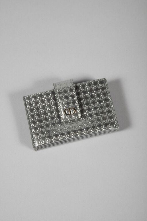 Montaigne model cardholder in grey patent leather with cane motif and several gussets, press stud flap closure with initial and tongue with initials signed "CD" in silvered metal. Interior with 5 pockets.