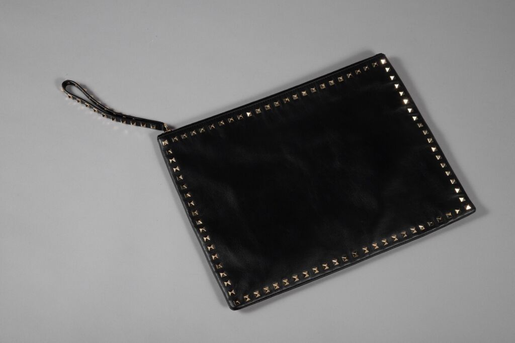 * VALENTINO GARAVANI. Black soft calf leather briefcase with metal pyramid studs, studded zip fastening, black fabric interior with one zip pocket and two flap pockets, VALANTINO GARAVANI red fabric label. 30 × 40 cm. (Excellent condition, new and unworn) This lot is sold by SELARL GILLET-SEURAT-MORETTON, at the request of AGRASC, the fees and taxes are as follows: 14.28% incl. VAT (i.e. 11.90% excl. VAT (20%)).