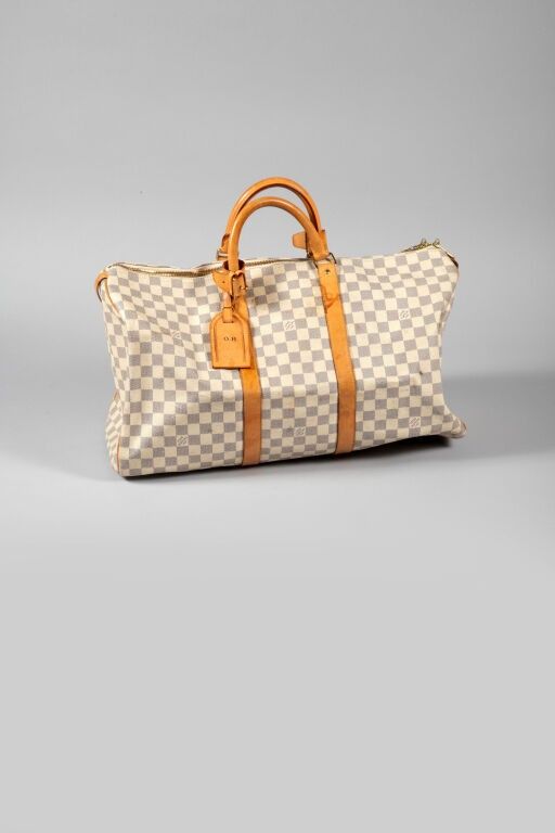 Keepall 50 bag in azure checkerboard canvas with natural cowhide leather finish. Monogrammed zip closure. Date code MB1089, engraved inside (between 1990 and 2006, MB: French manufacturing factory code). Leather luggage tag personalised with the initials H.O. Padlock inside (key missing) (No. 454).