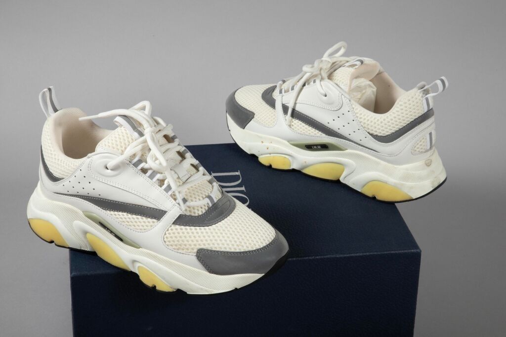 * DIOR (Made in Italy). Pair of white-grey-yellow B22 trainers, in technical canvas embellished with two-tone grey and white leather, numbered on the tongue "20 ELS 40". Size 40. (Used condition, already worn, slight traces of wear). Brand box (as is). This lot is sold by SELARL GILLET-SEURAT-MORETTON, at the request of AGRASC, the fees and taxes are as follows: 14.28% inclusive of tax (i.e. 11.90% exclusive of tax (VAT 20%)).