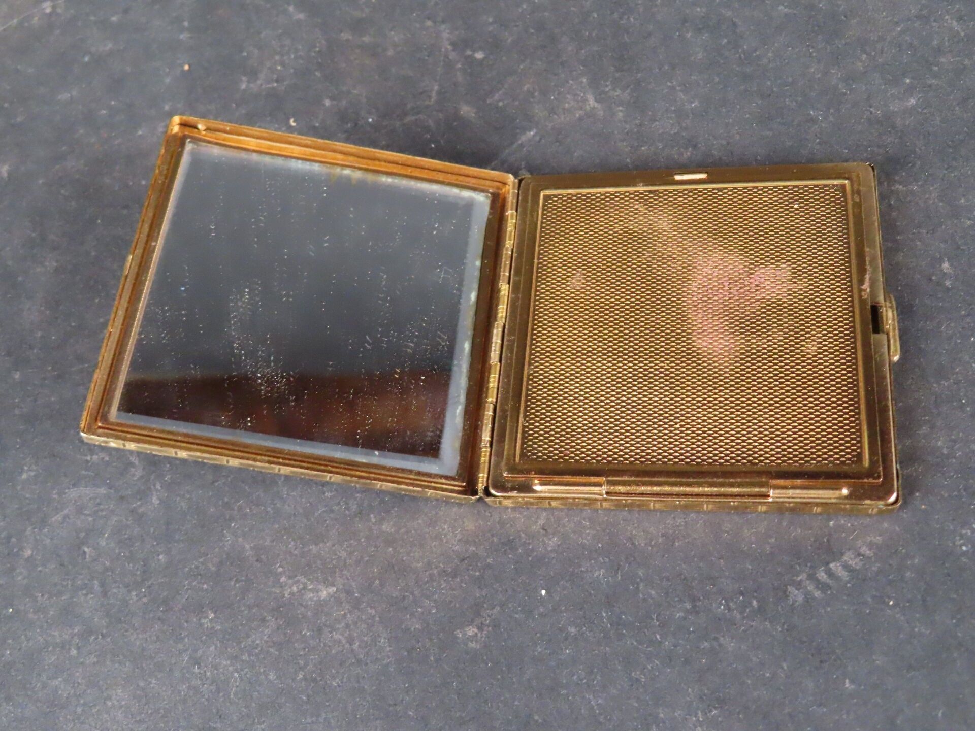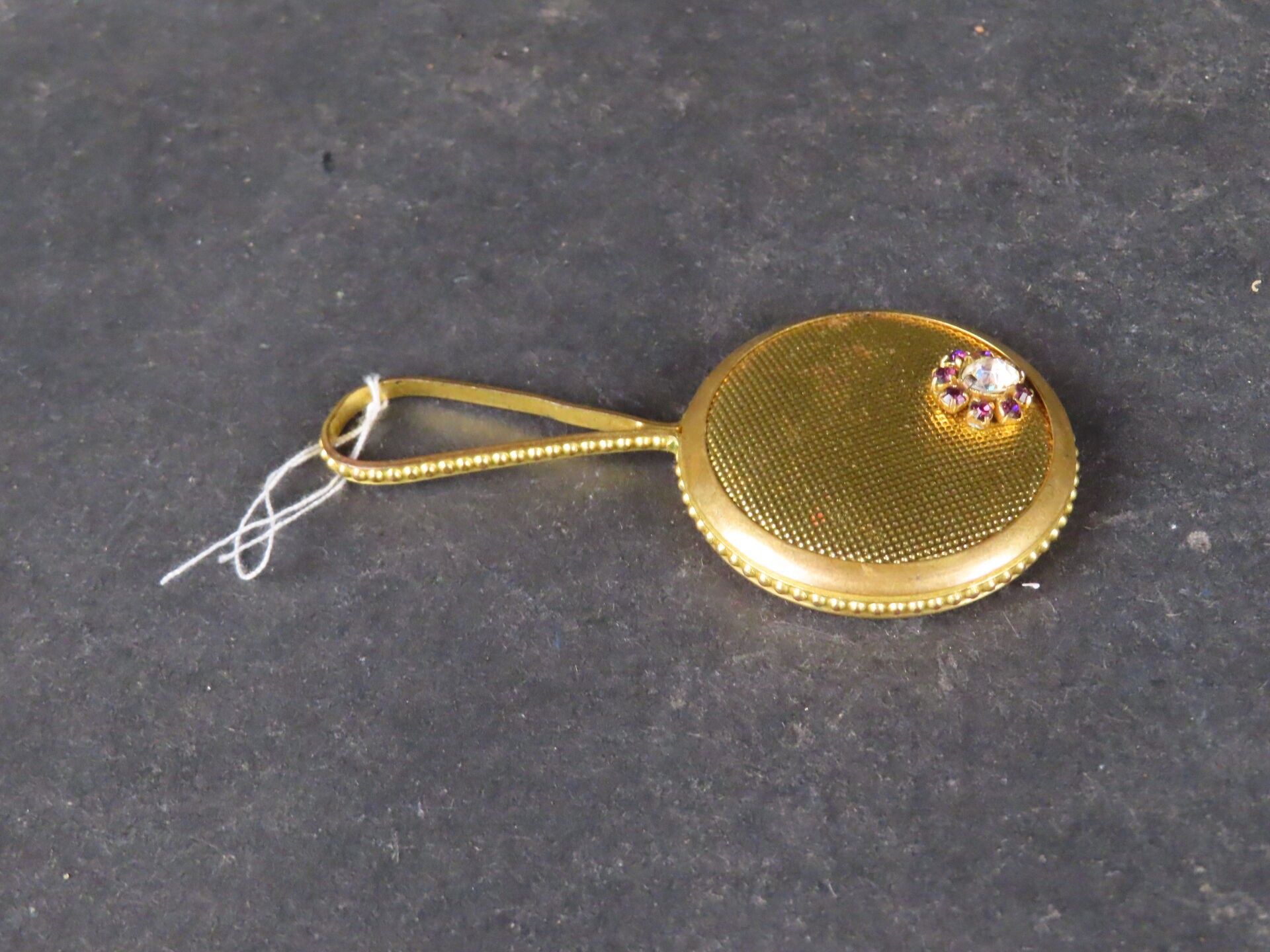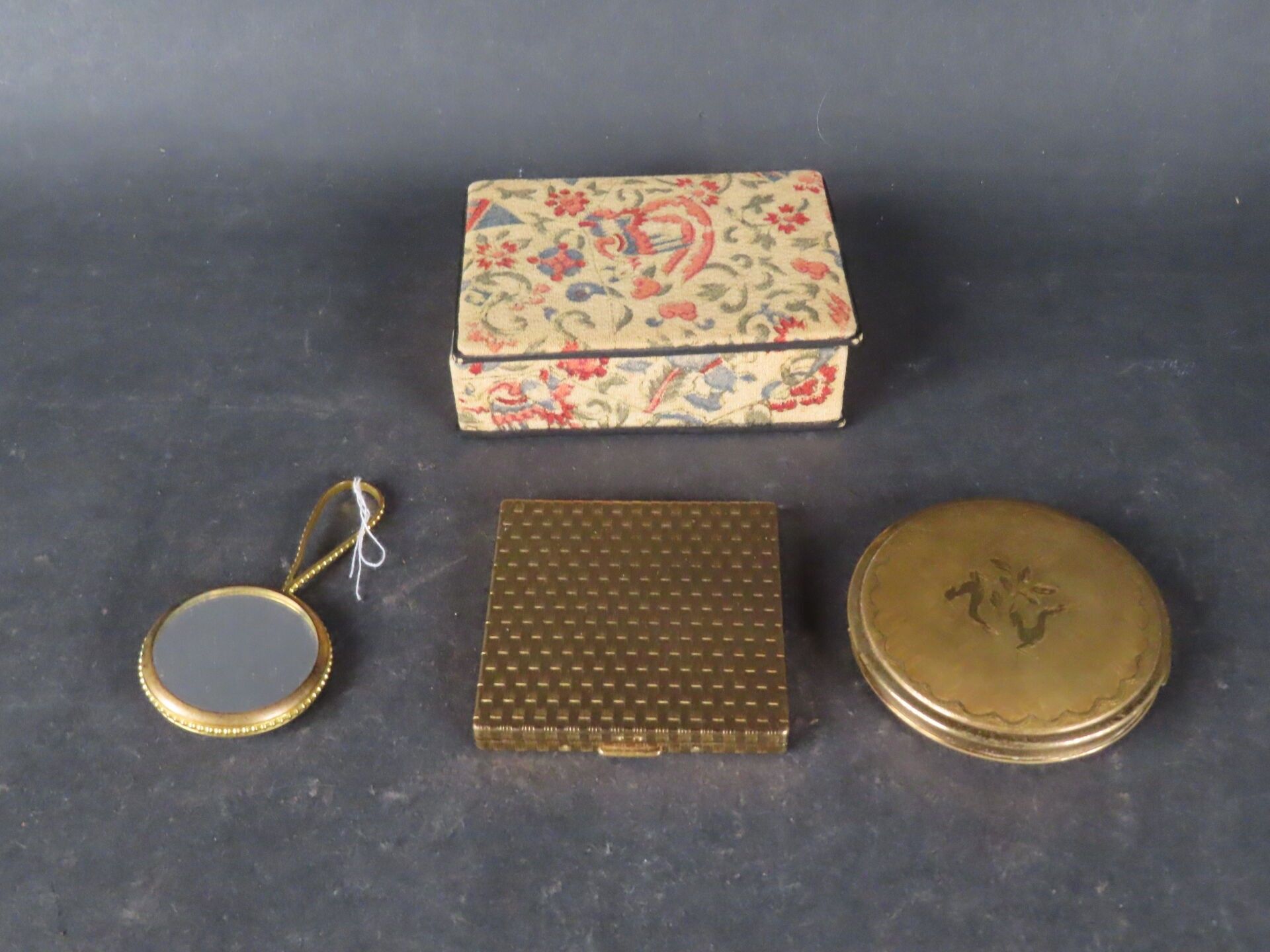 Set of showcase items including a fabric jewellery box, 2 gilded metal compacts and 1 brass hand mirror.