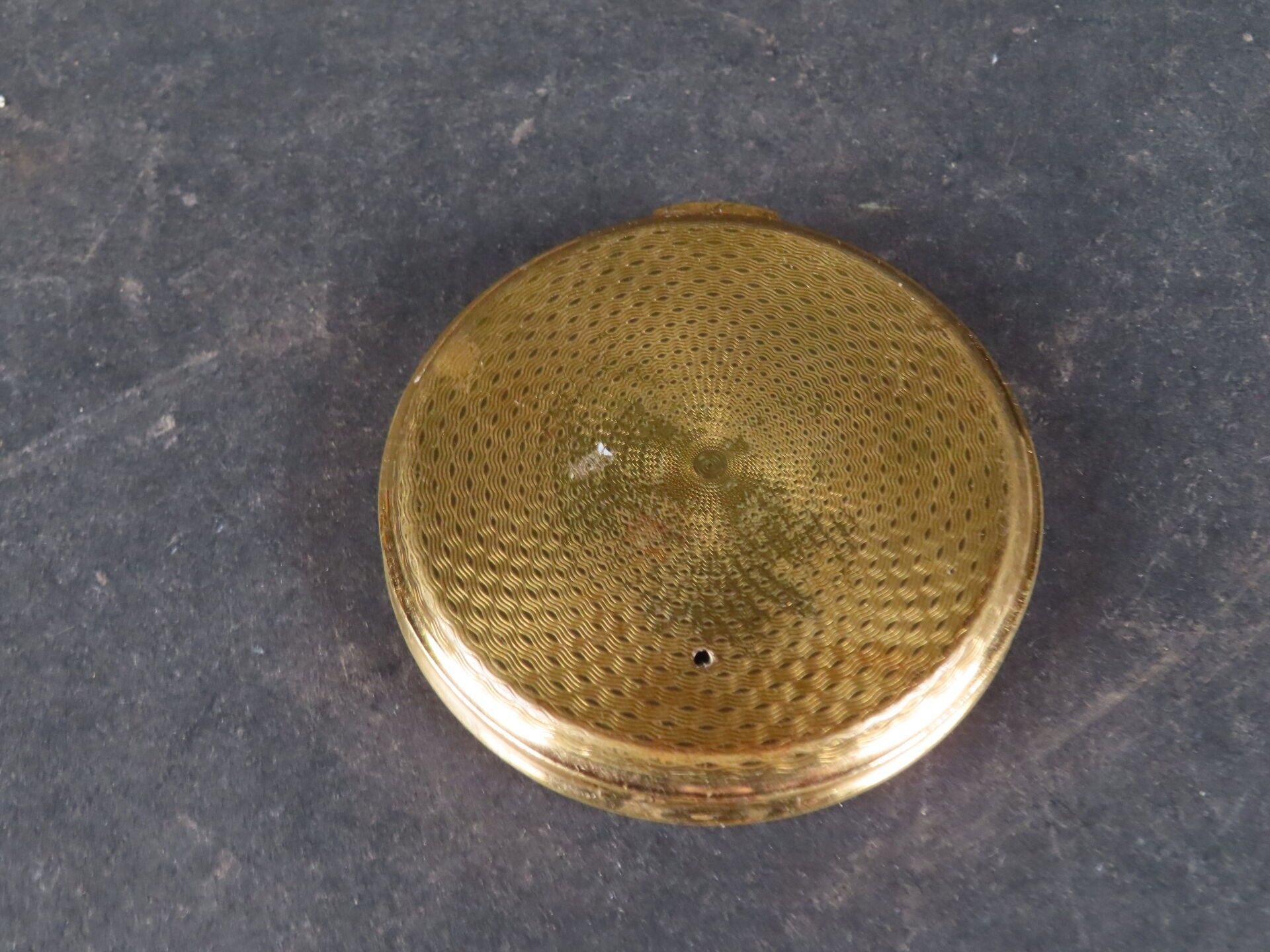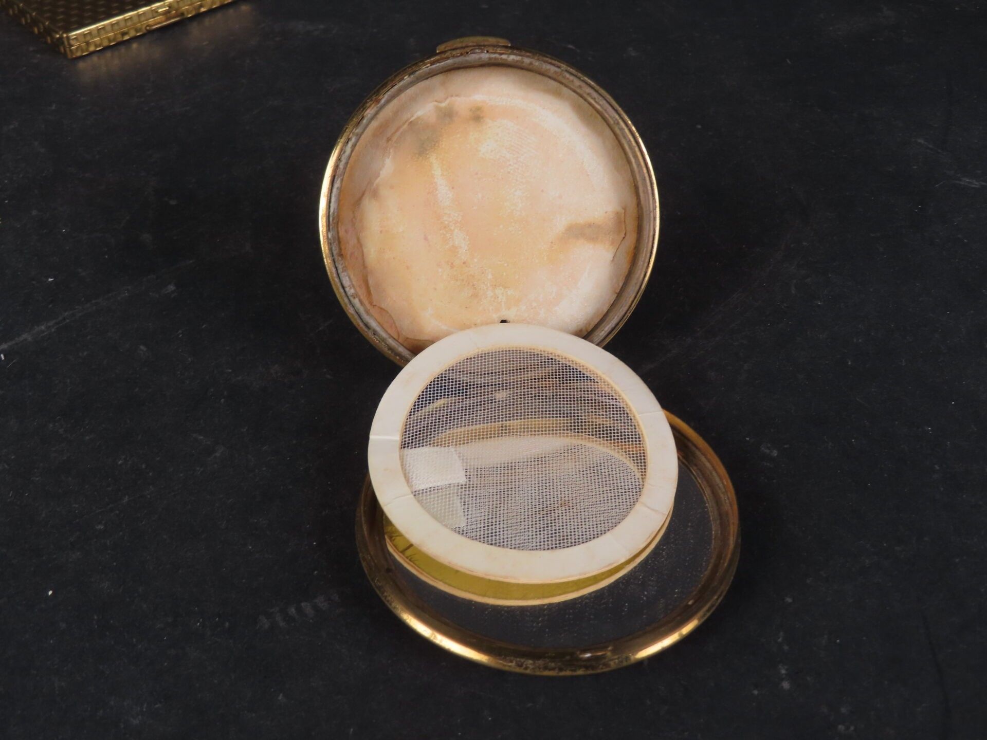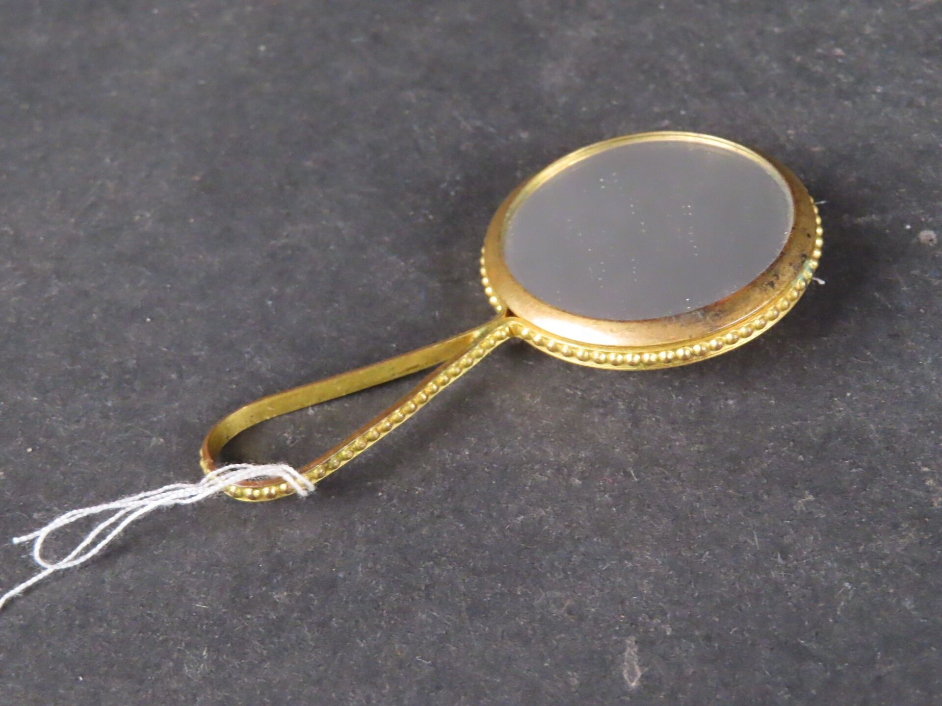 Set of showcase items including a fabric jewellery box, 2 gilded metal compacts and 1 brass hand mirror.