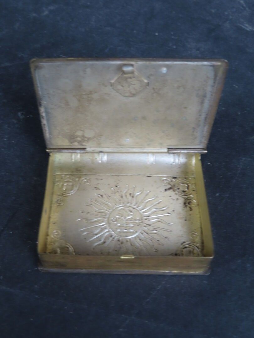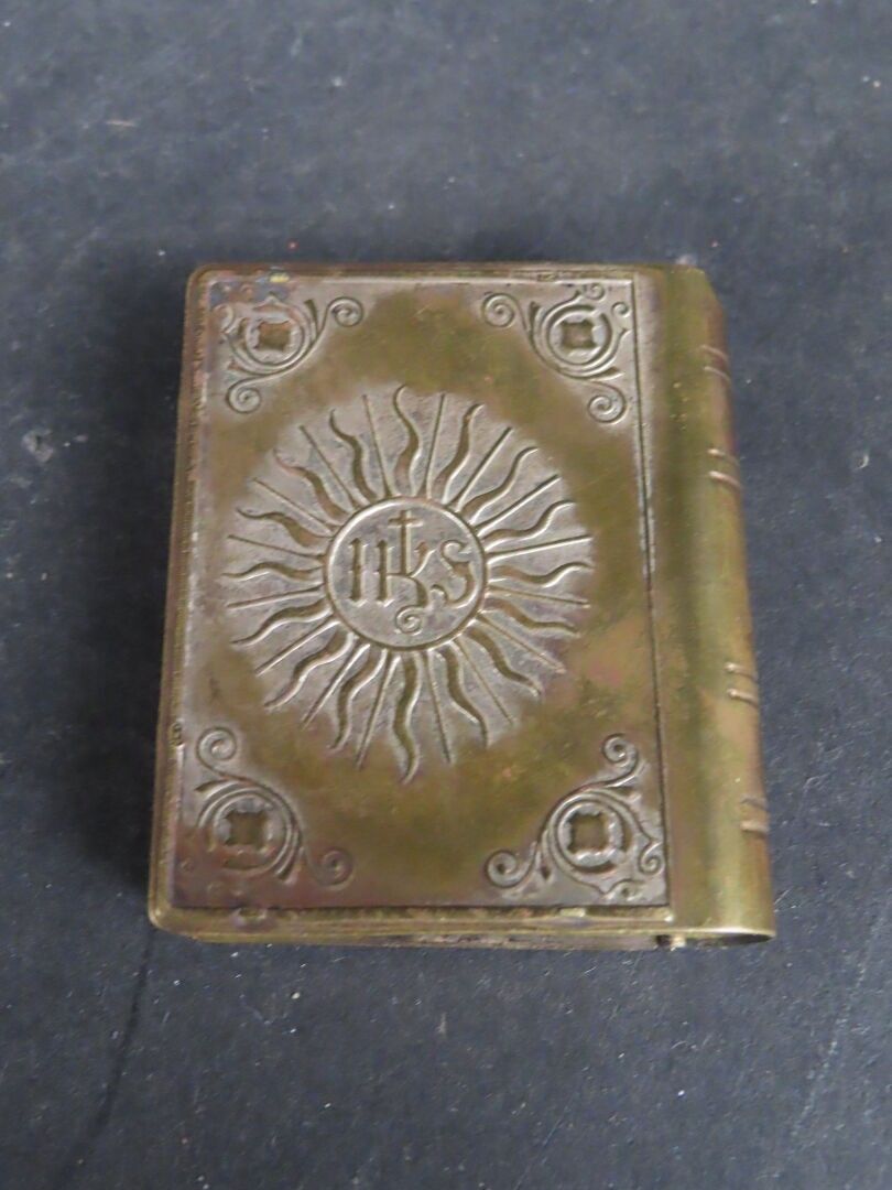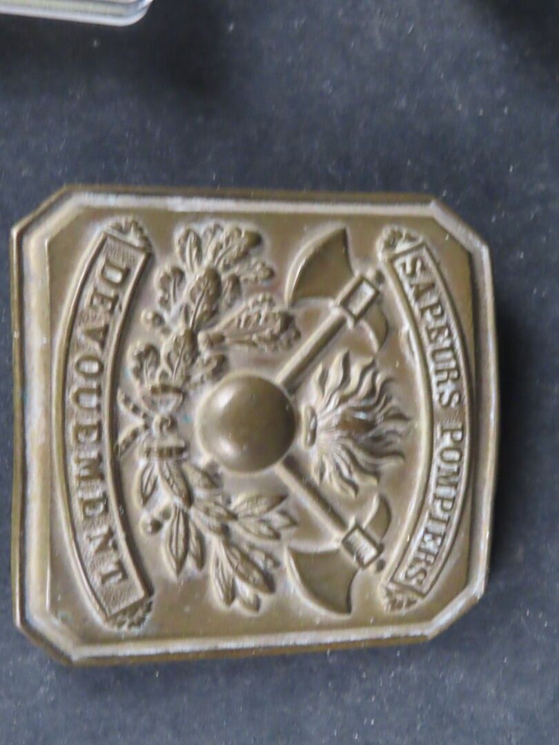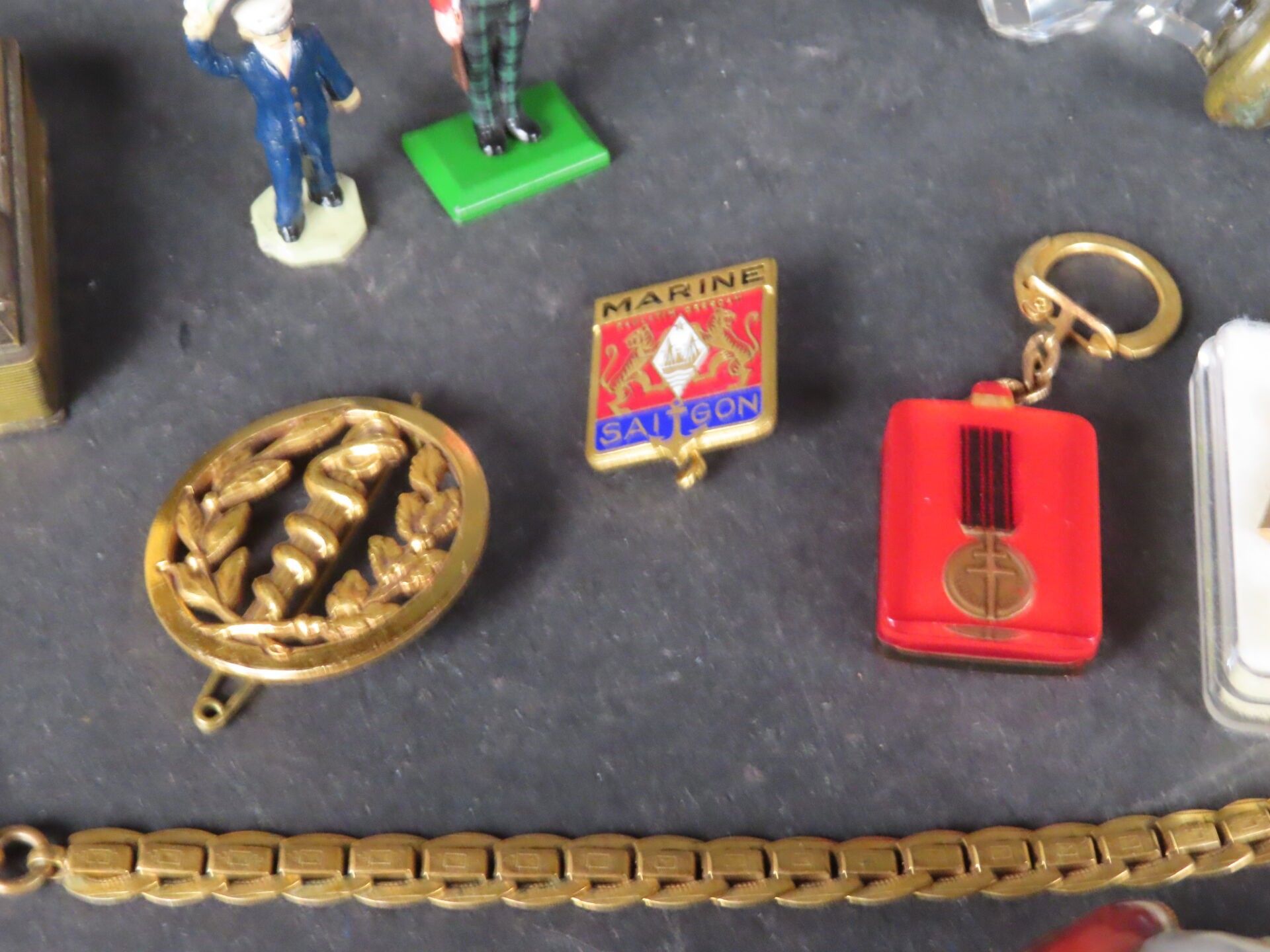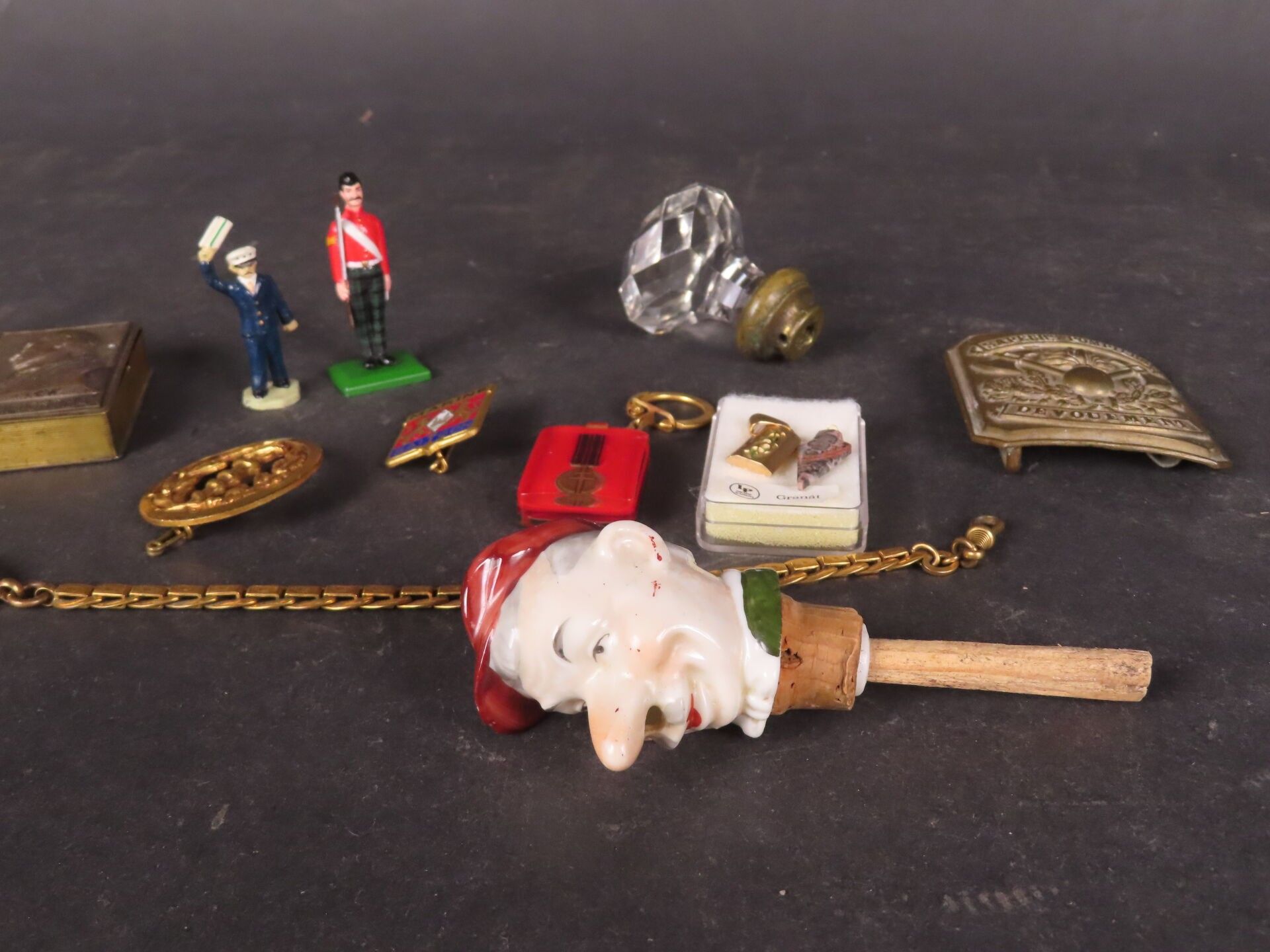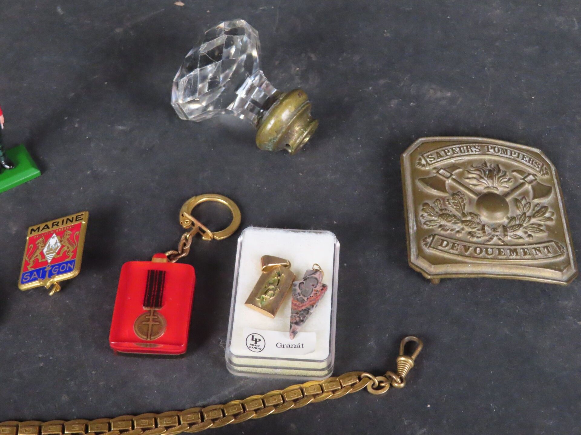 Display case including: 1 crystal door handle, 1 fireman's belt buckle, 3 militaria badges and key rings, 1 gilt metal watch chain, 2 lead soldiers, 2 pendants, 1 book box bearing the effigy of Pius XII and 1 porcelain bottle stopper "homme au béret" ("man in a beret").