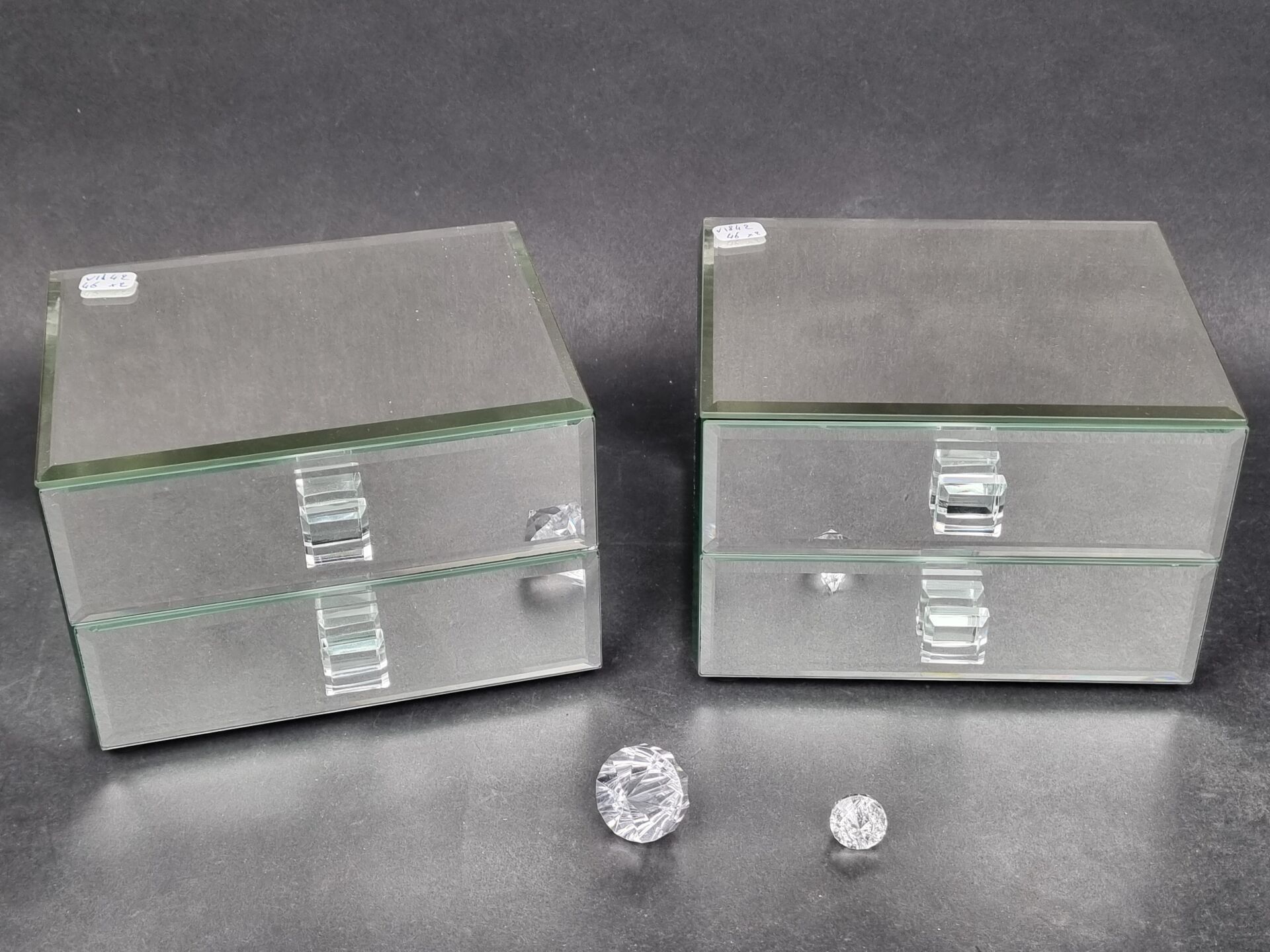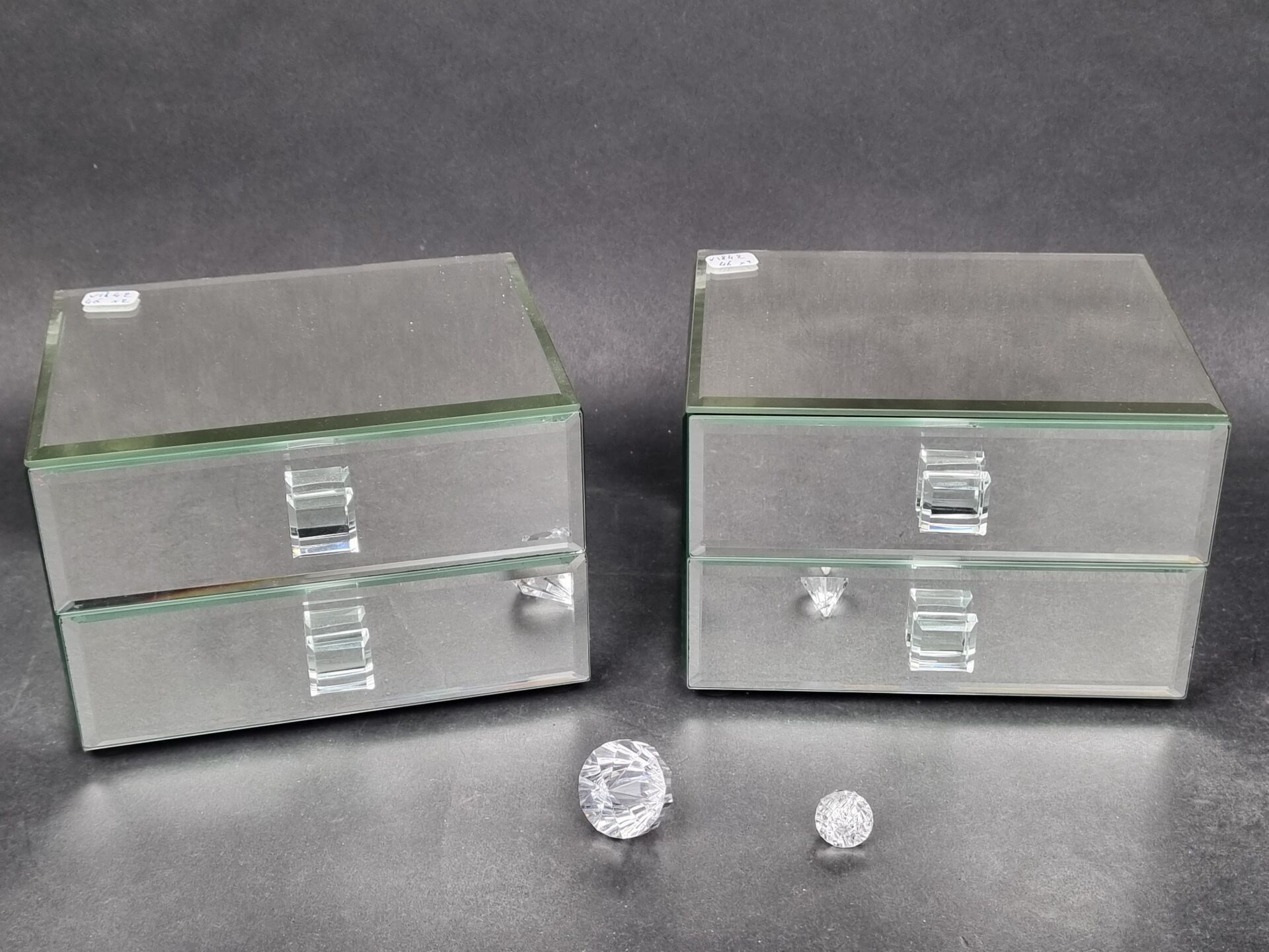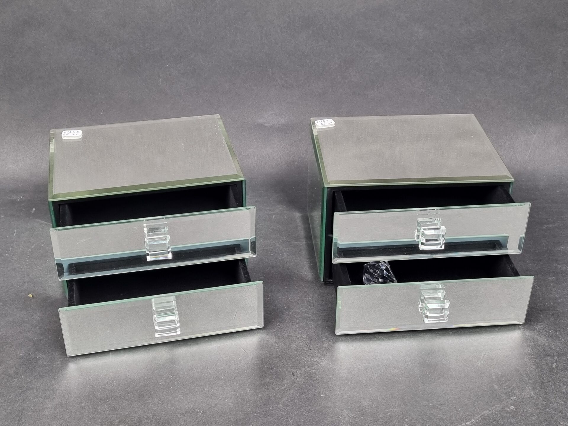 SWAROWSKI. Set of two bevelled mirror-lined jewellery boxes with two drawers and black velvet lining (each: 11.5 x 16.5 x 14 cm)