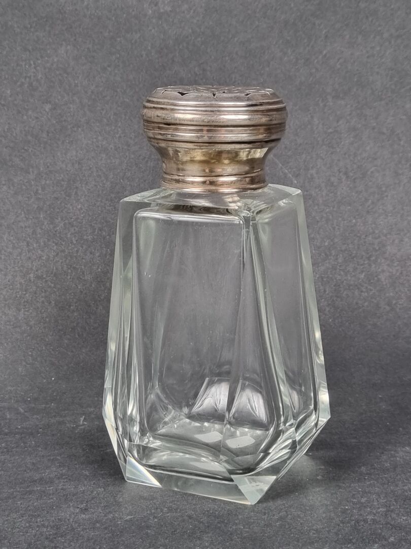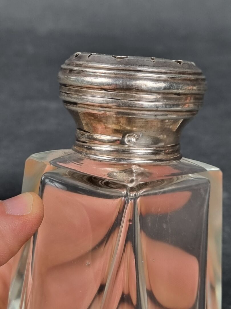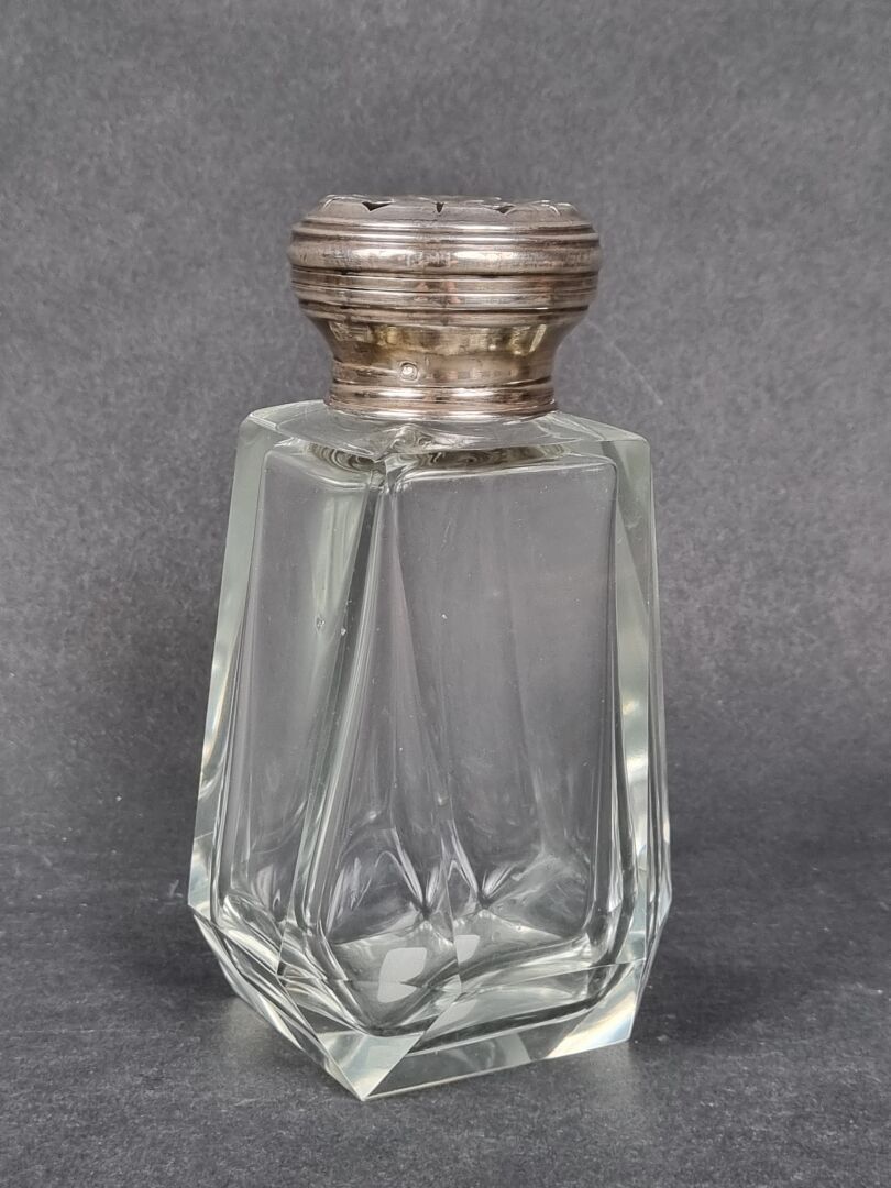 Glass saucepan with cut sides, pierced silver stopper, Minerve hallmark (H: 13.5 cm) (dents)