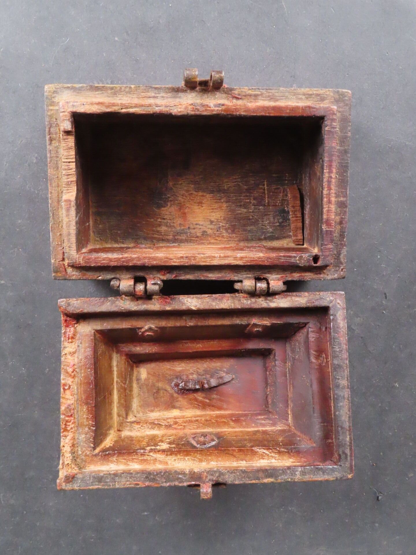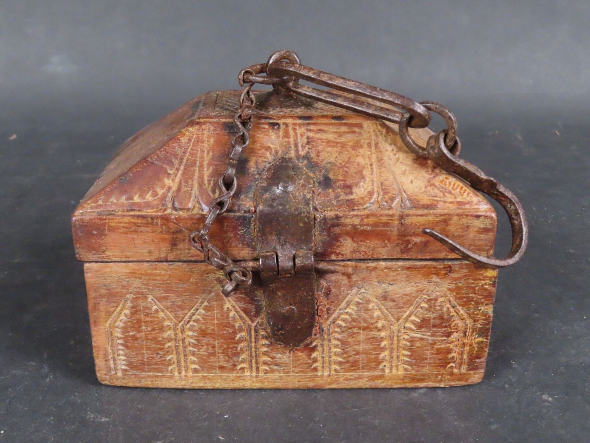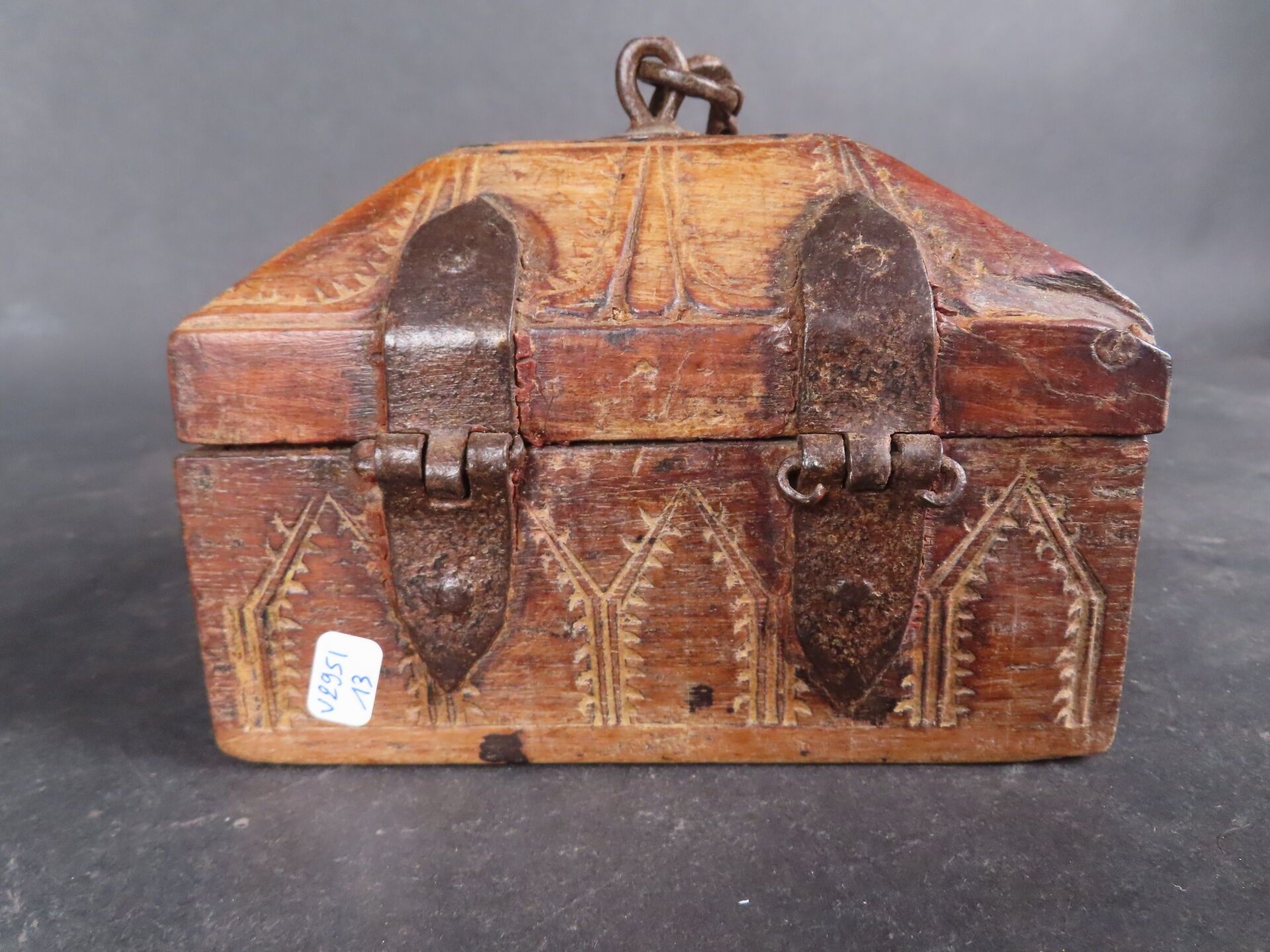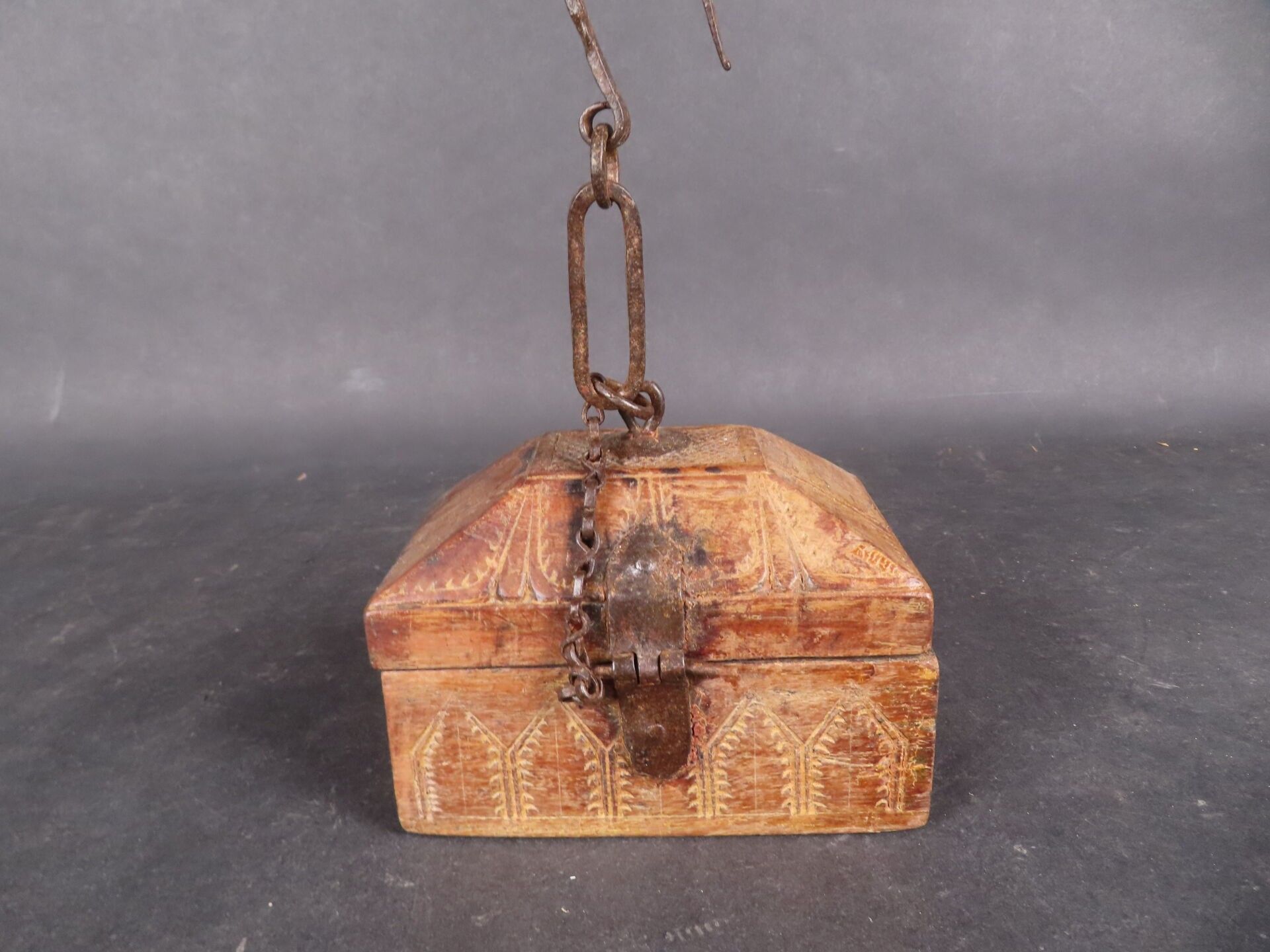 Small engraved wood and wrought iron box with hanging hook (11 x 17 x 10.5 cm)