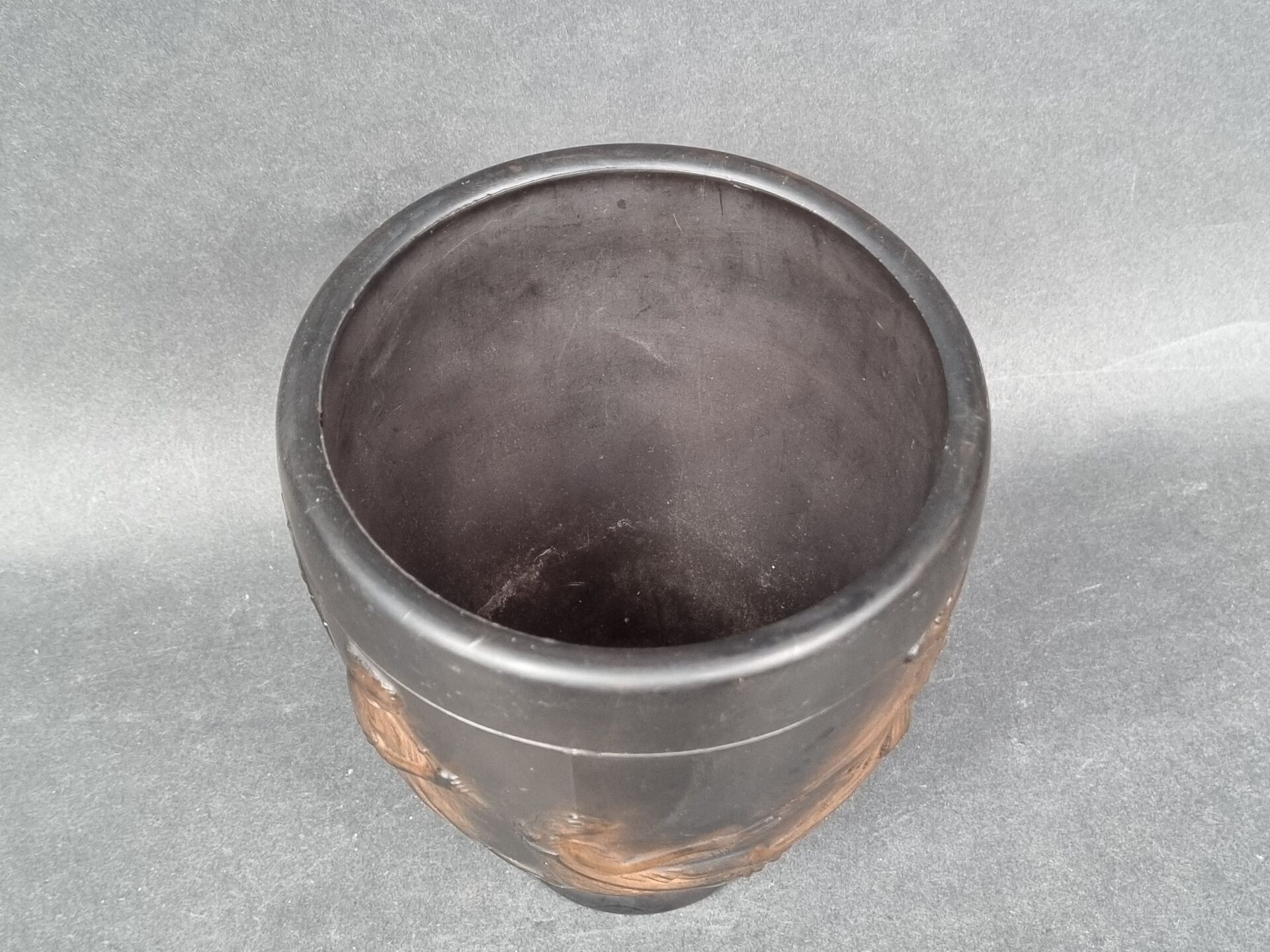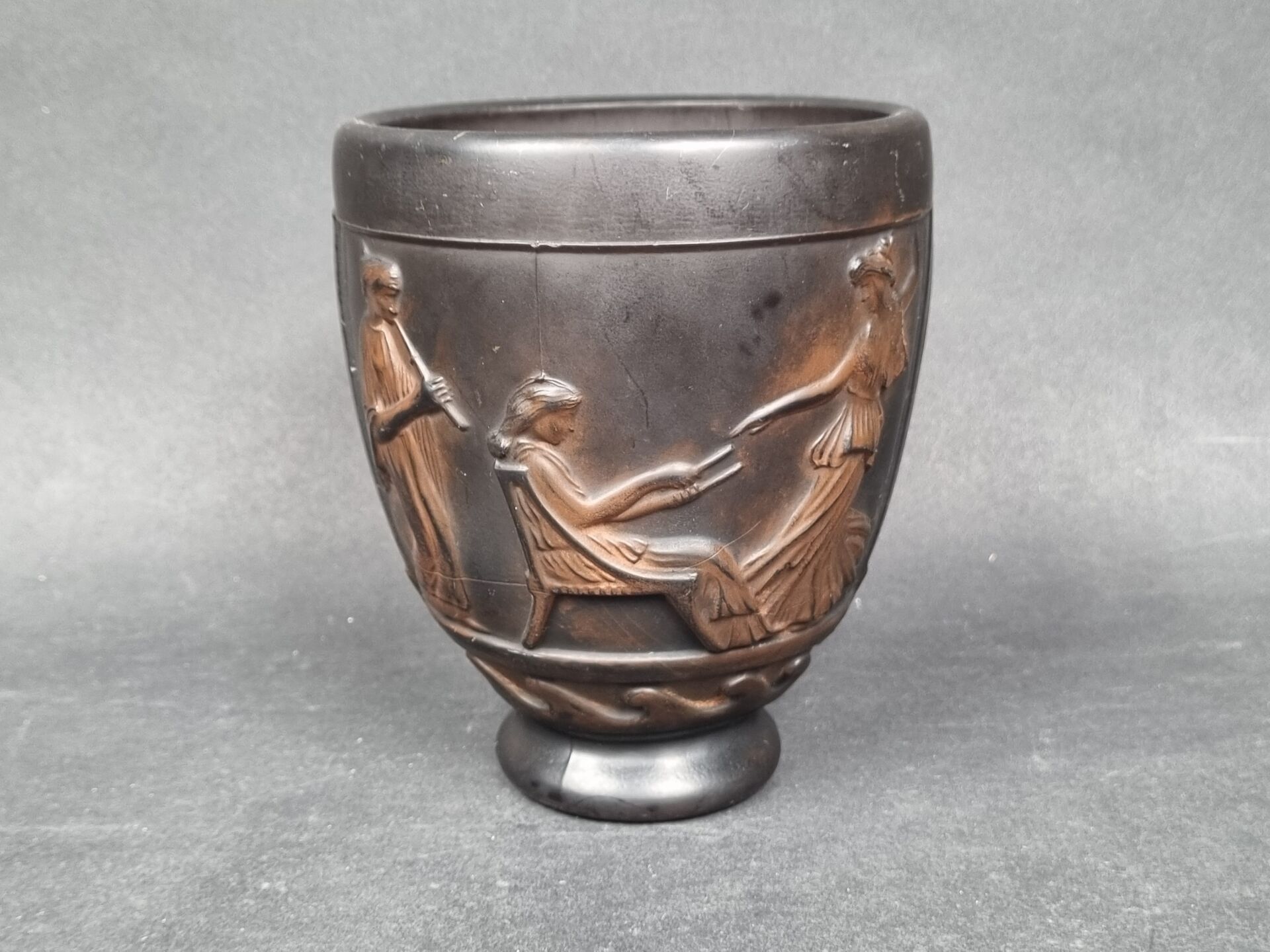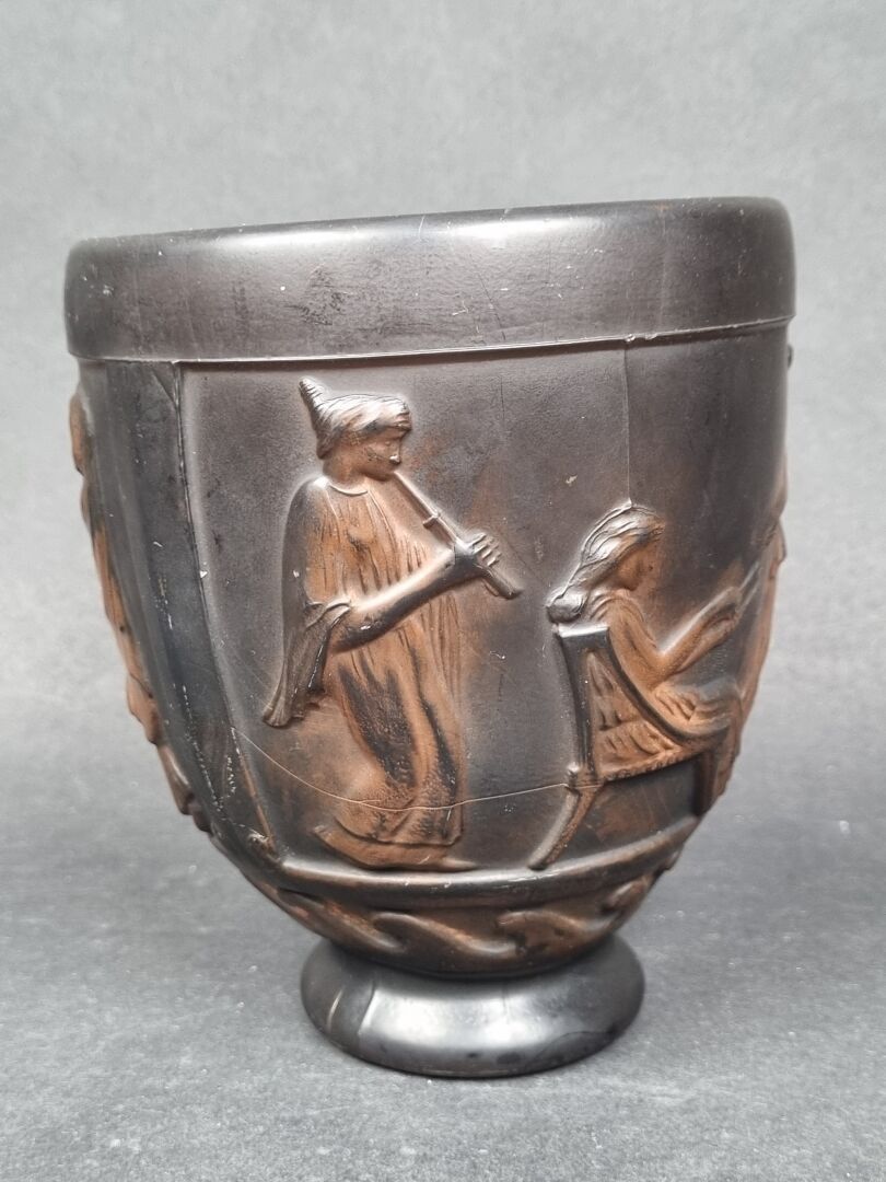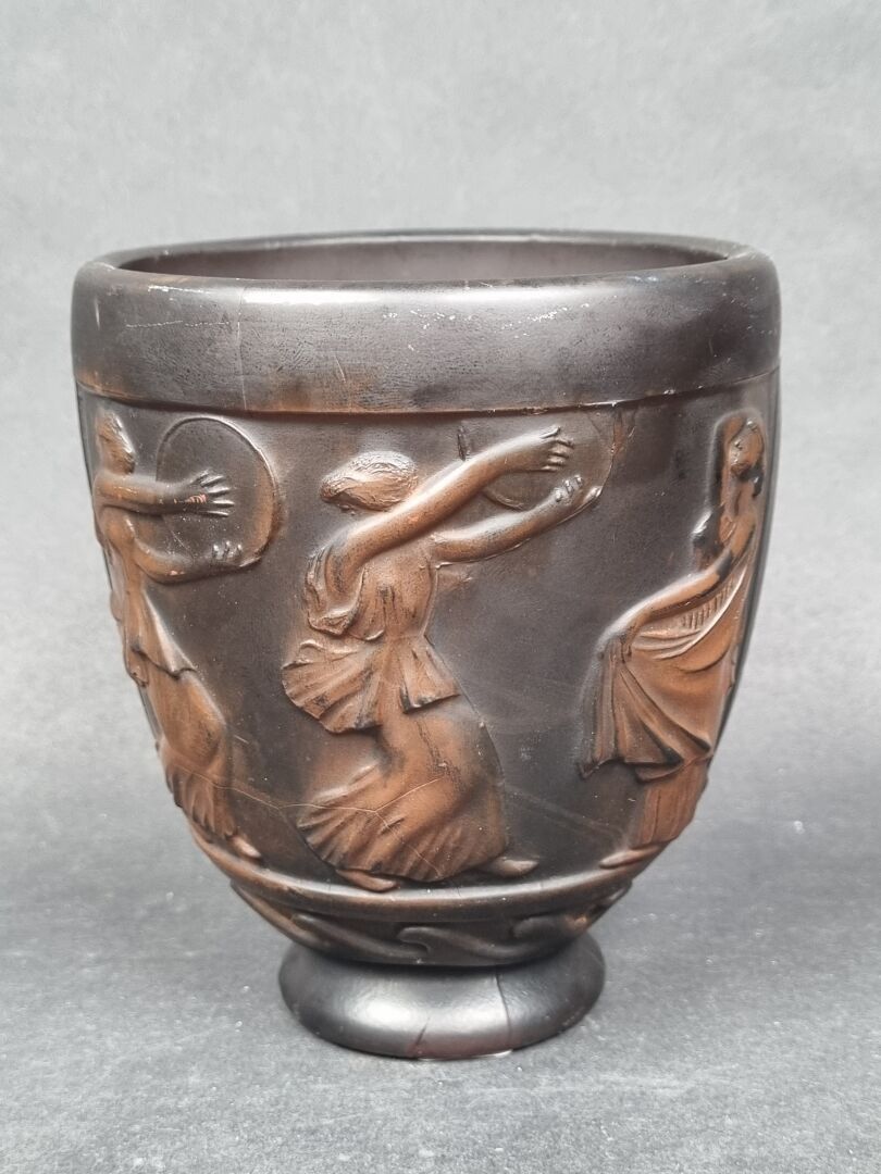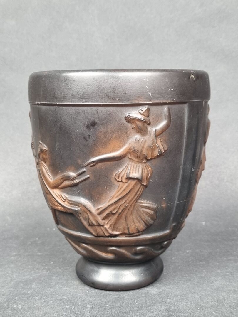 Georges DE FEURE (1868-1943). Pressed moulded glass vase decorated with an antique woman. Signed under the base (H : 14 cm ; diam : 11, 5 cm)