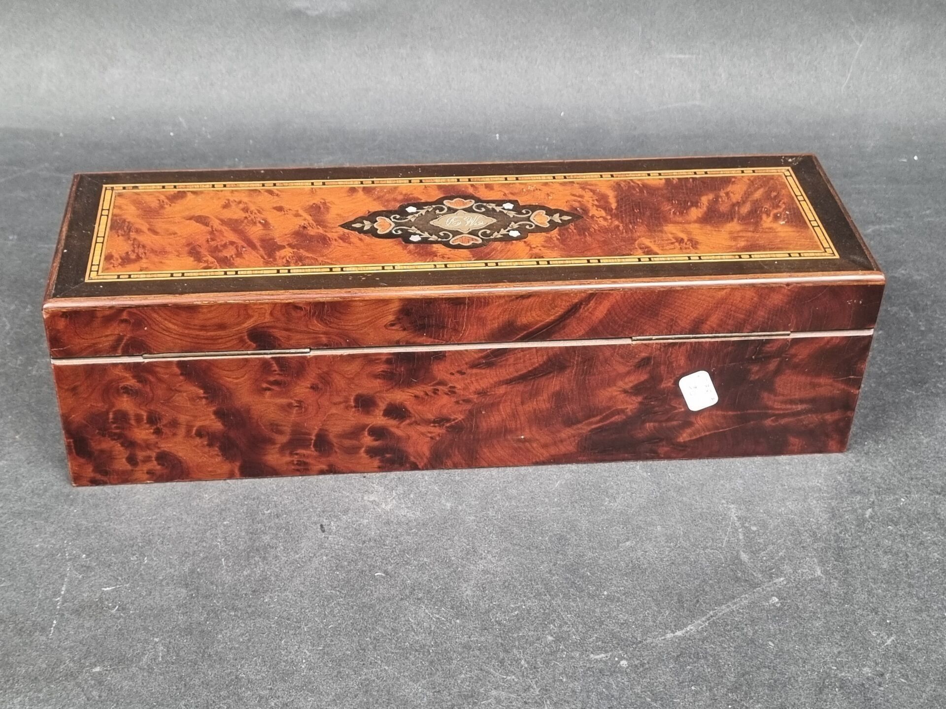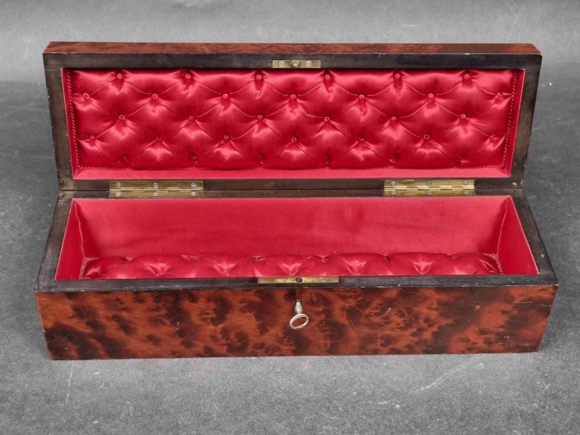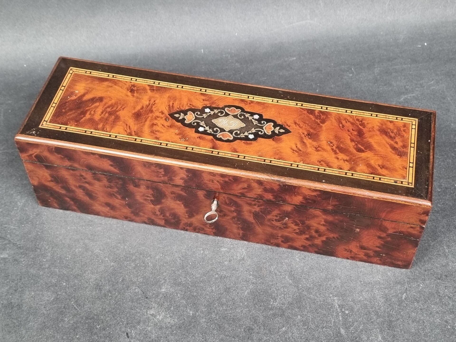 Cedar burl and marquetry glove box, padded interior, with key. Napoleon III period (9 x 31.5 x 9.5 cm)