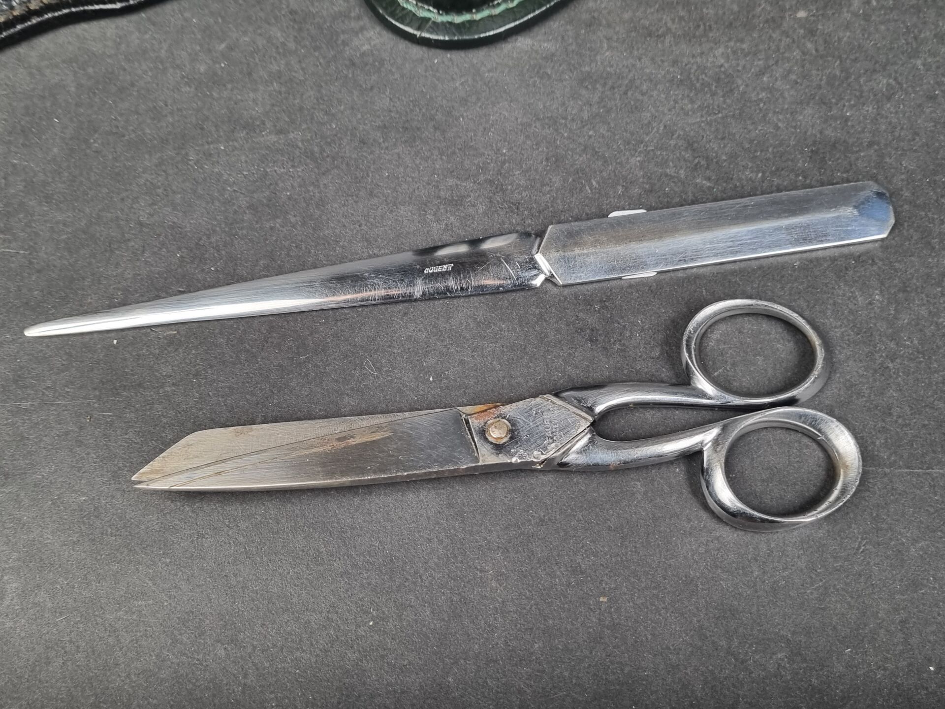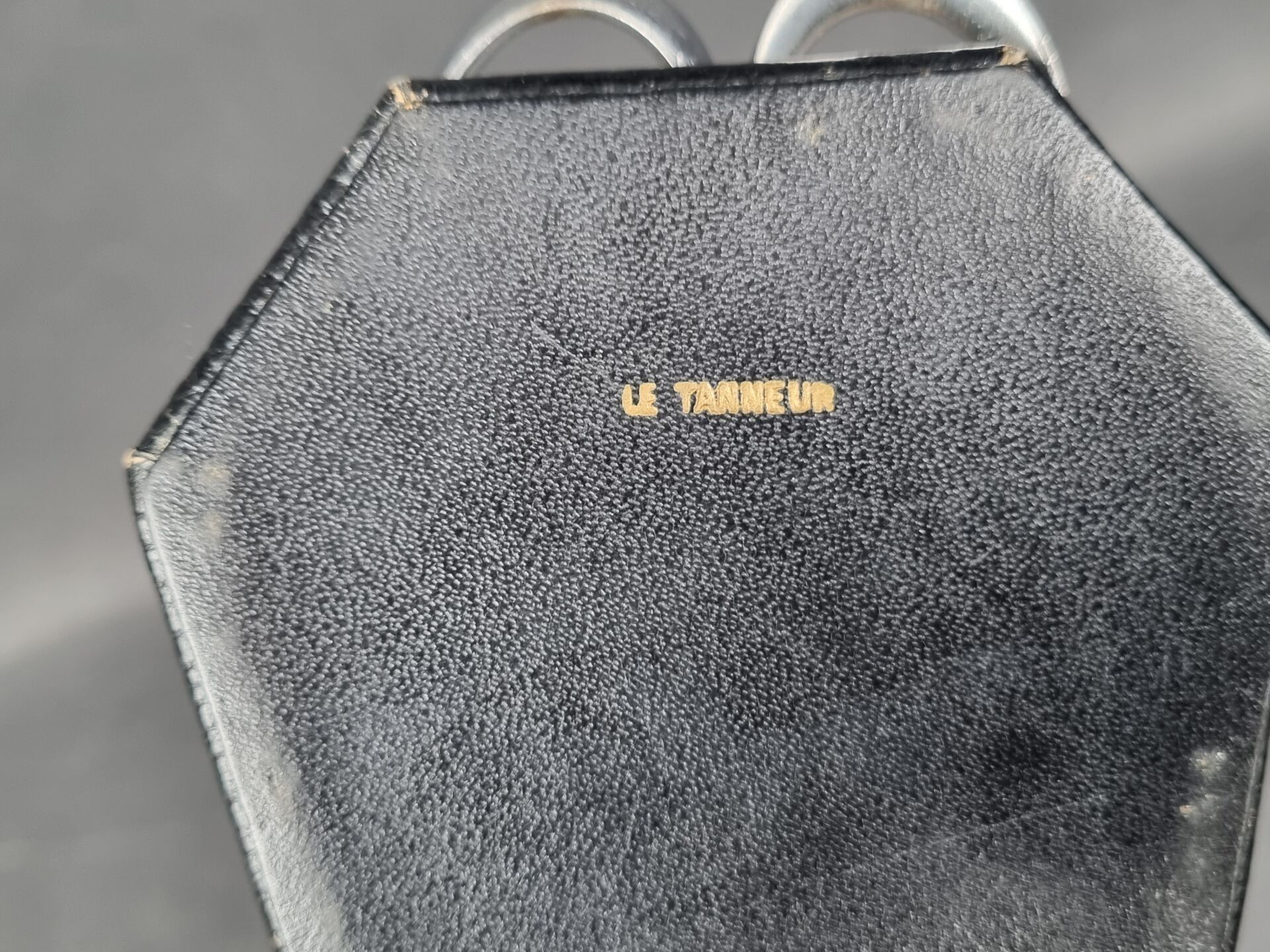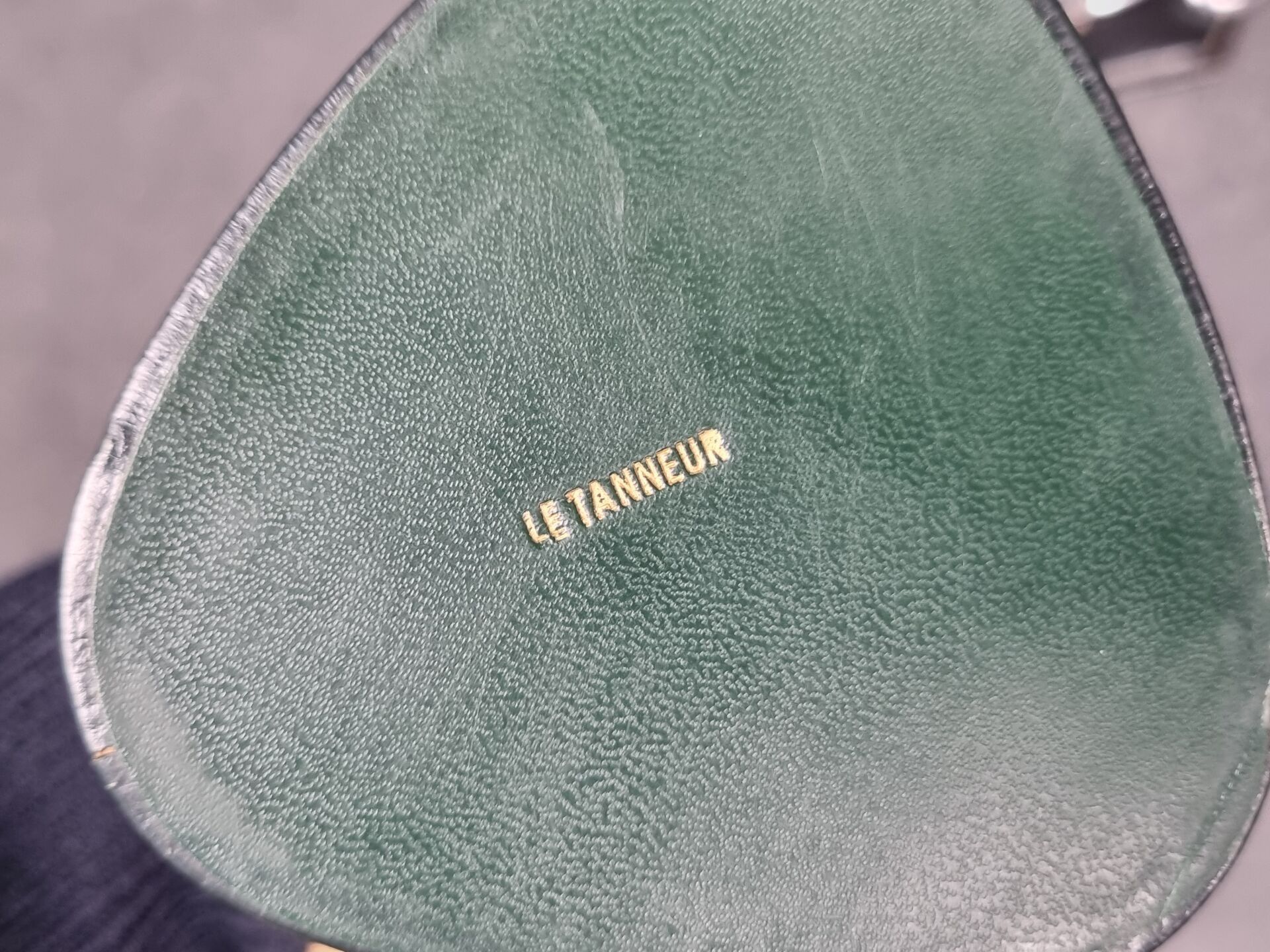 LE TANNEUR. Part of a green leather desk set comprising a pencil cup and a scissors and paper cutter case, marked on the reverse.