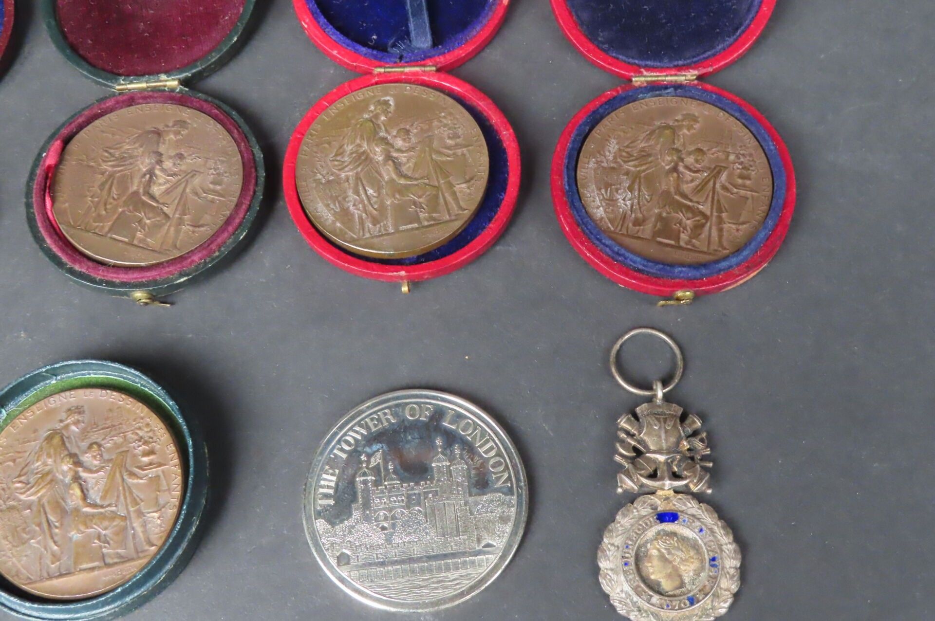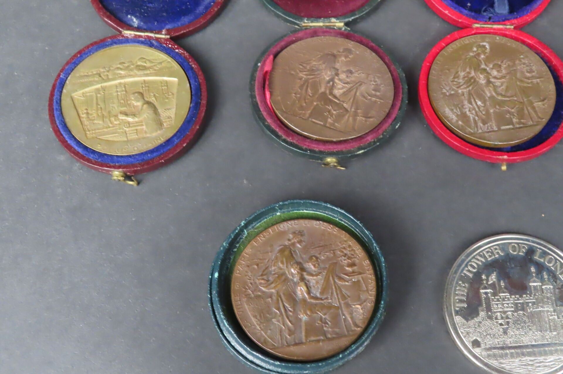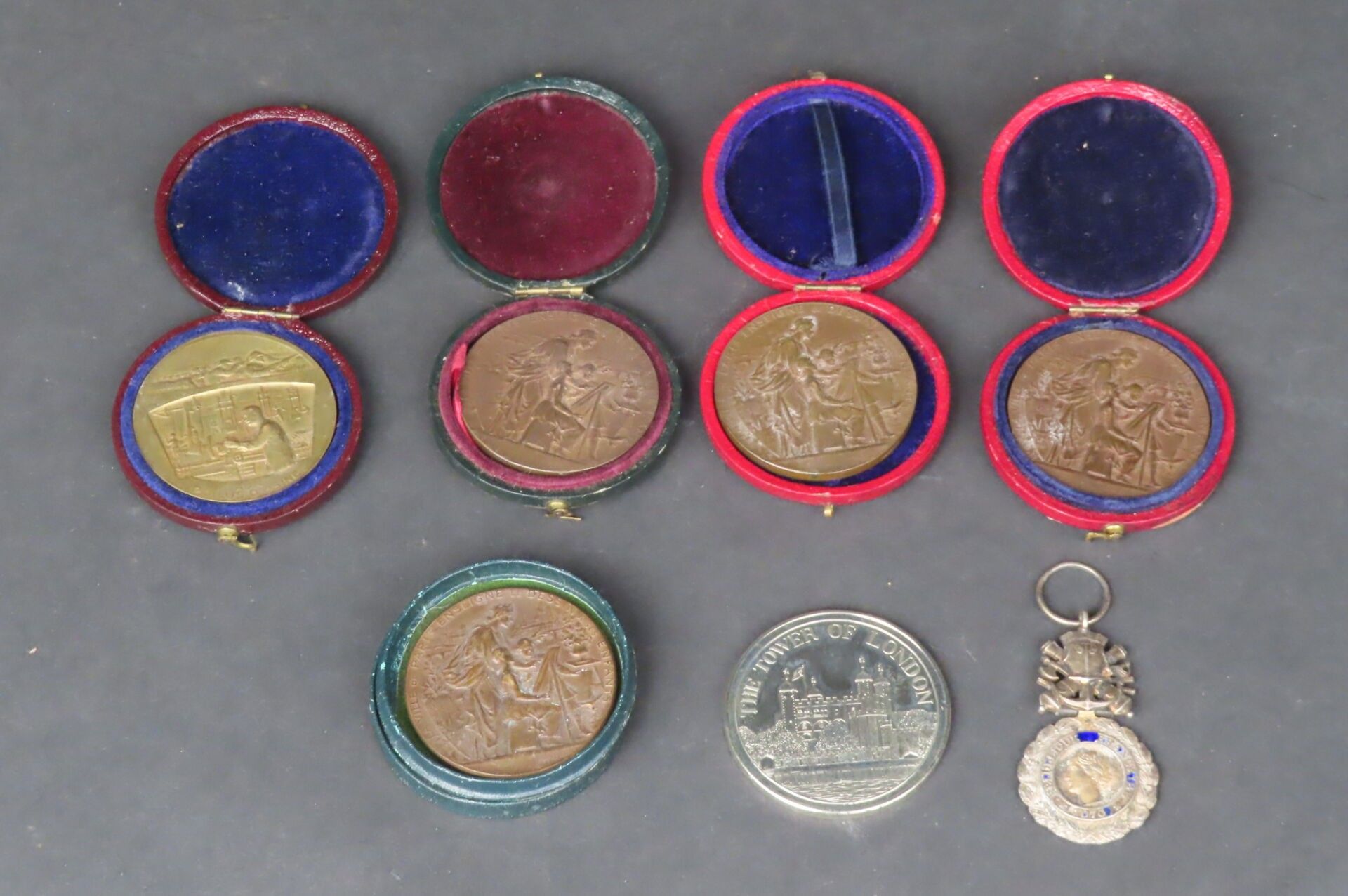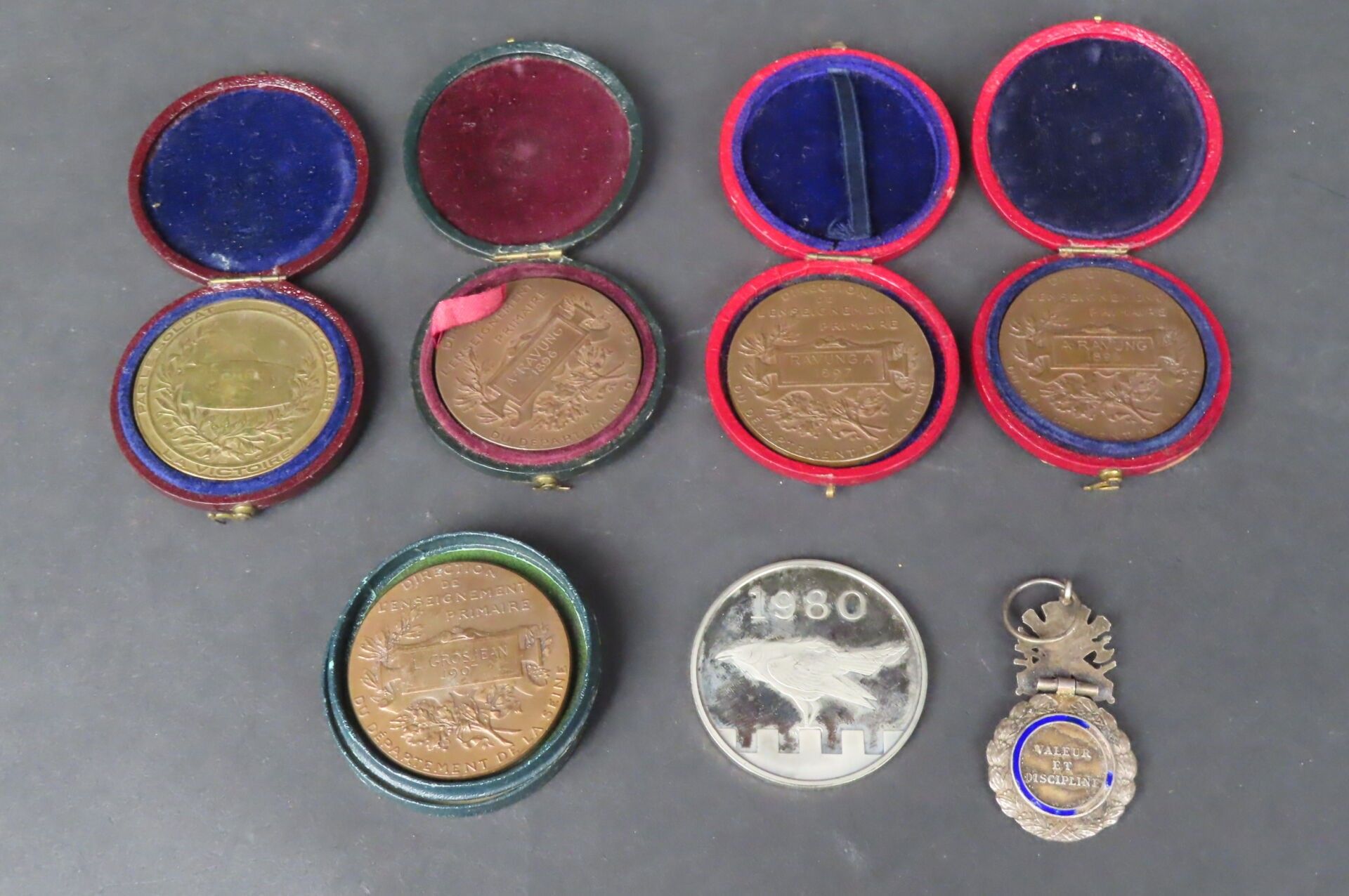 Set of 6 medals: 4 patinated bronze medals "La Ville de Paris enseigne le dessin à ses enfants" after Louis Bottée (diam: cm), 1 gilt bronze medal "Aux poilus d'usine - Par le soldat, par l'ouvrier, la Victoire", after Lordonnois and 1 silver medal "The Tower of London 1980". Five cases; a "Valeur et Discipline" medal (without ribbon, worn and missing) is attached.