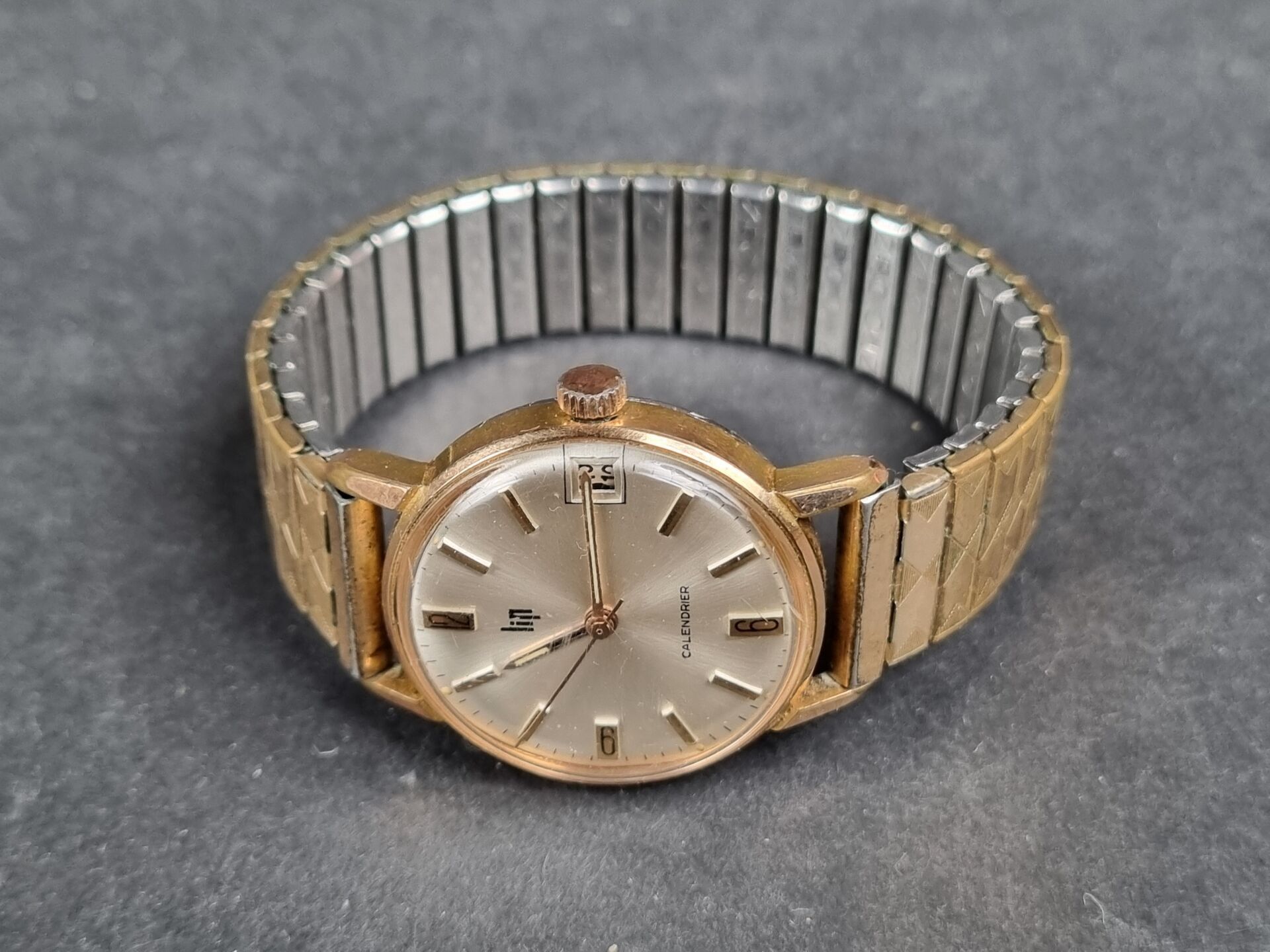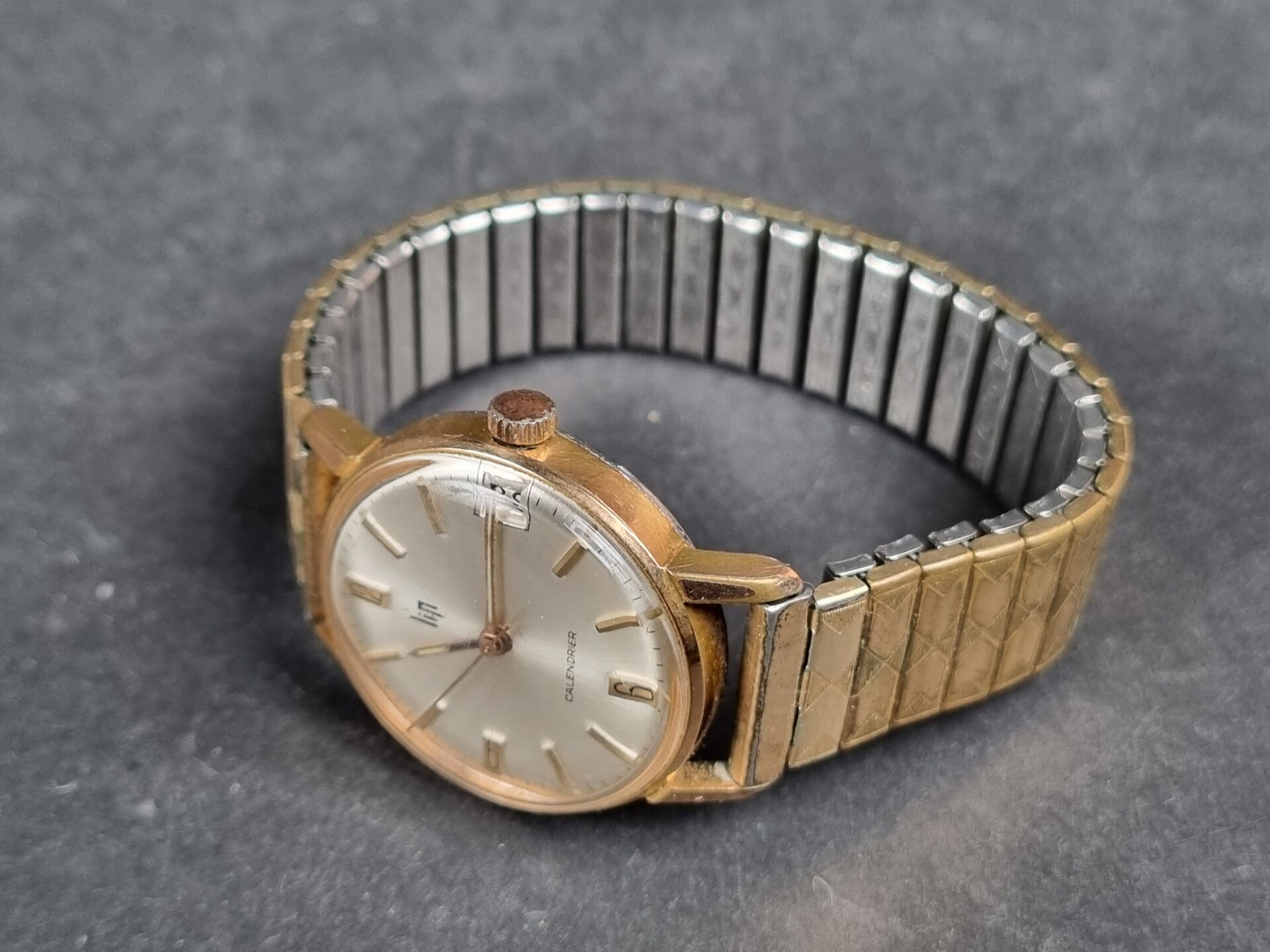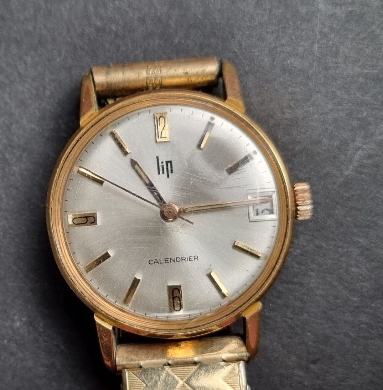 LIP. Wristwatch, Lip Calendrier, mechanical movement, gold-plated case with steel back, dial with hour-markers, date window at 3 o'clock (starts)