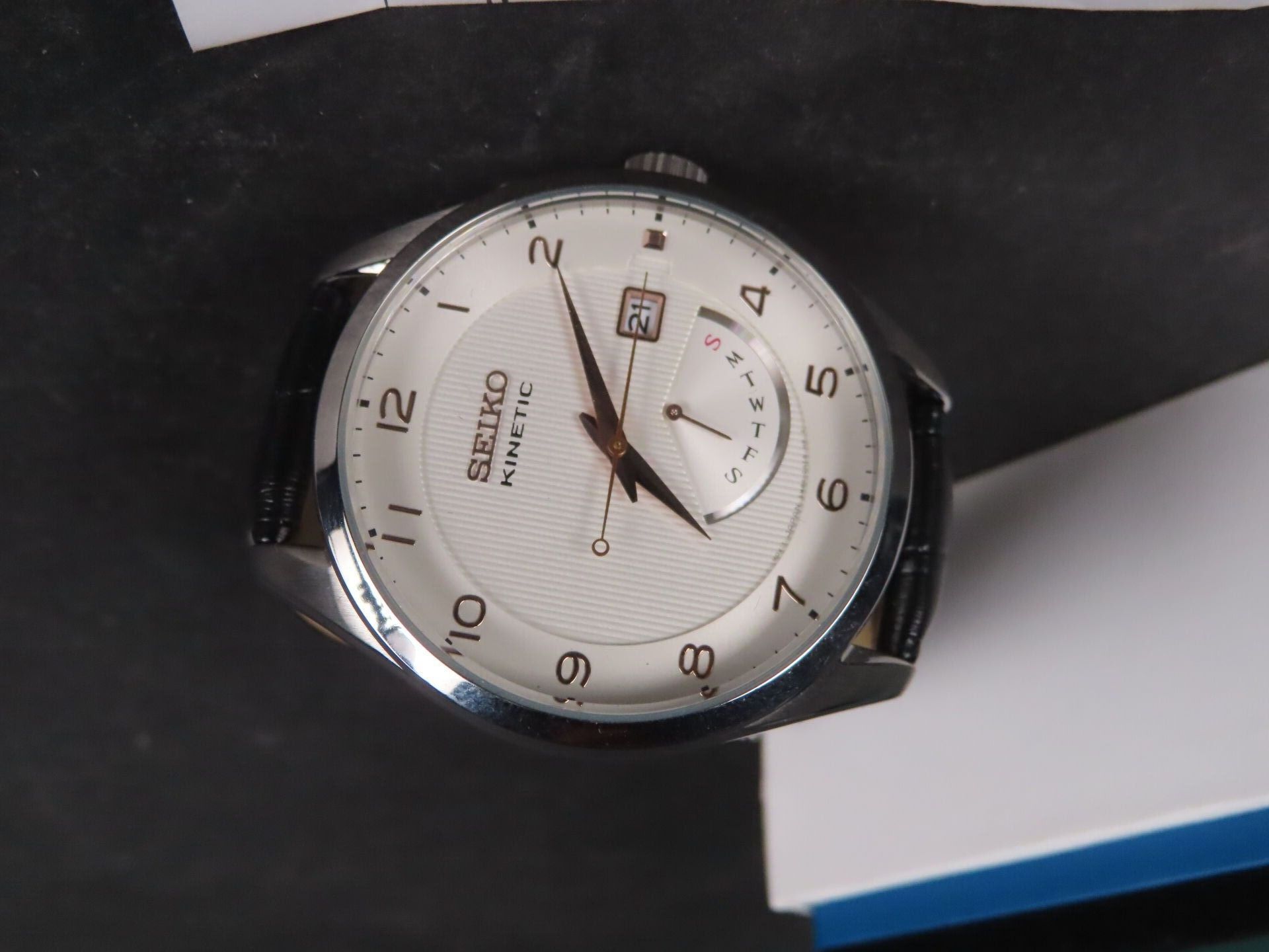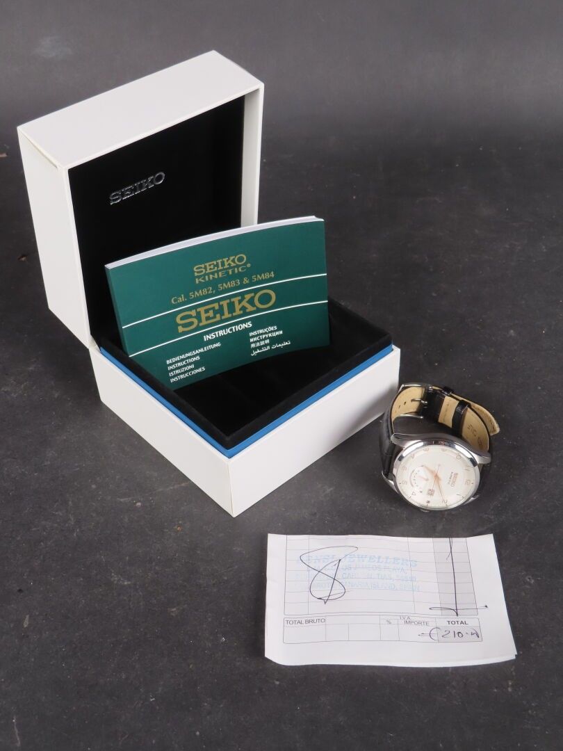 SEIKO. SEIKO Kinetic wristwatch, stainless steel case, Seiko leather strap, with box and receipt