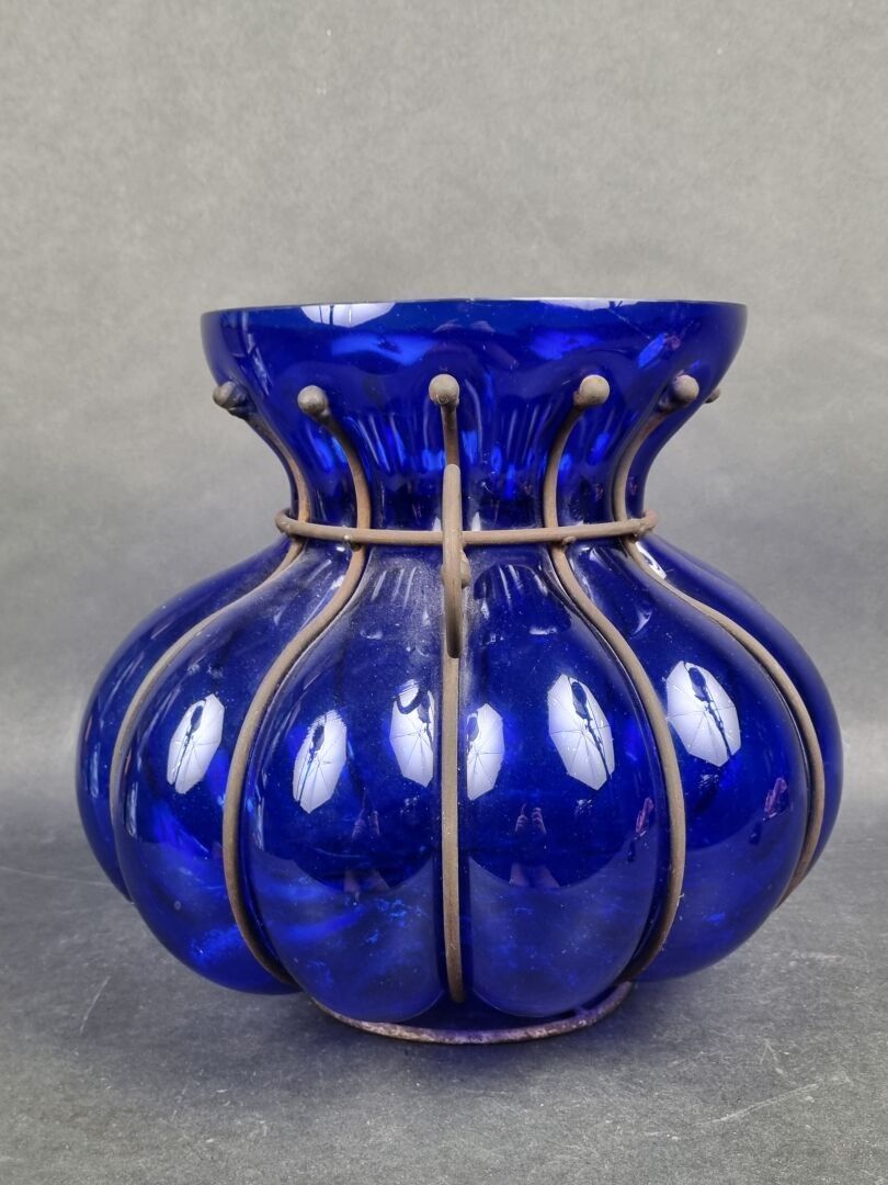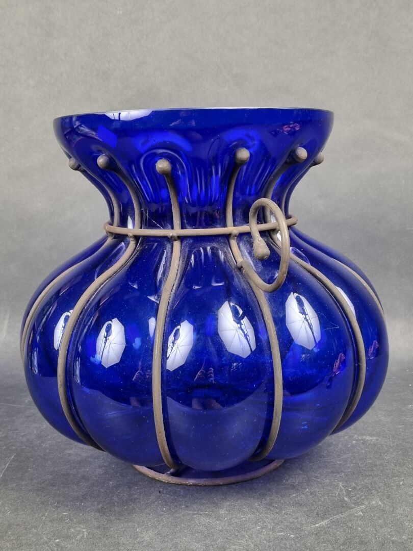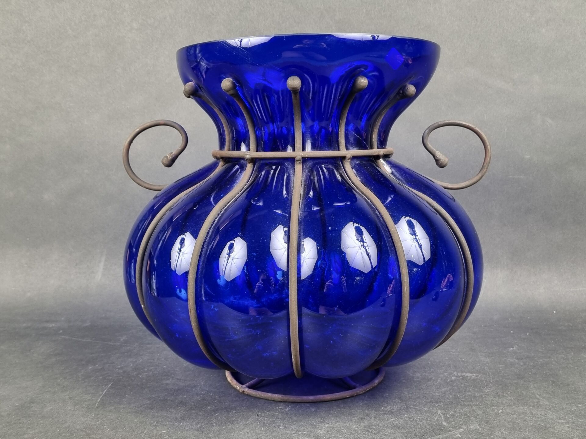 Large blue glass vase in a metal frame (H: 33 cm, W: 36 cm)