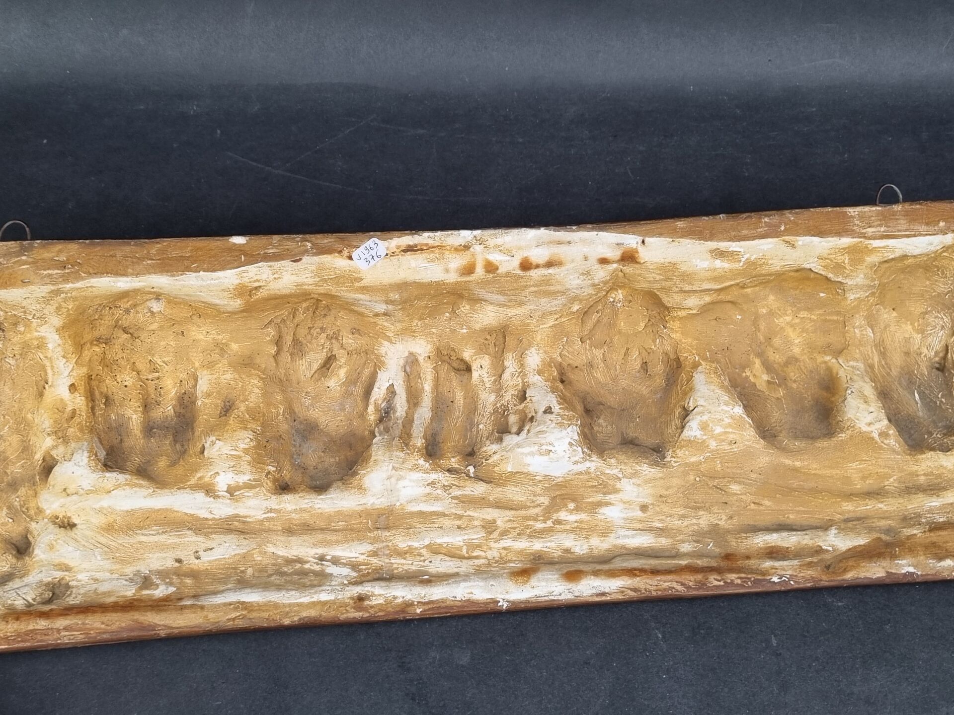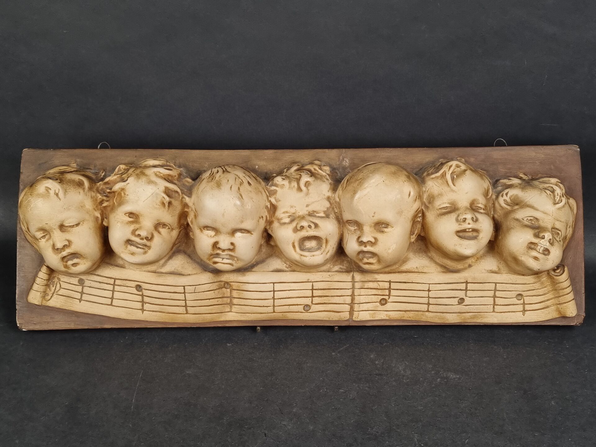 High relief in patinated plaster decorated with 7 children's heads and a musical score (H: 22 cm, W: 69 cm)
