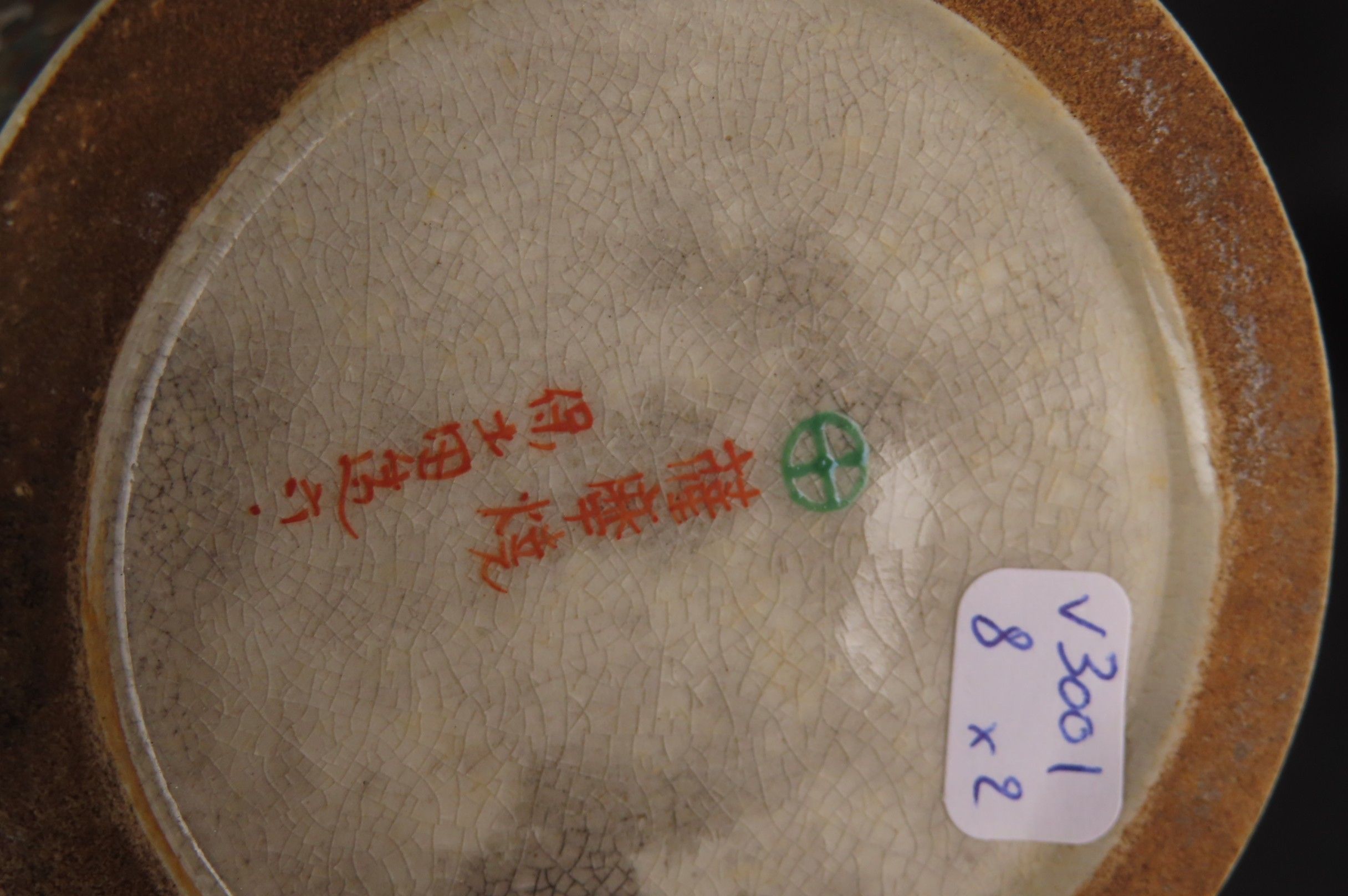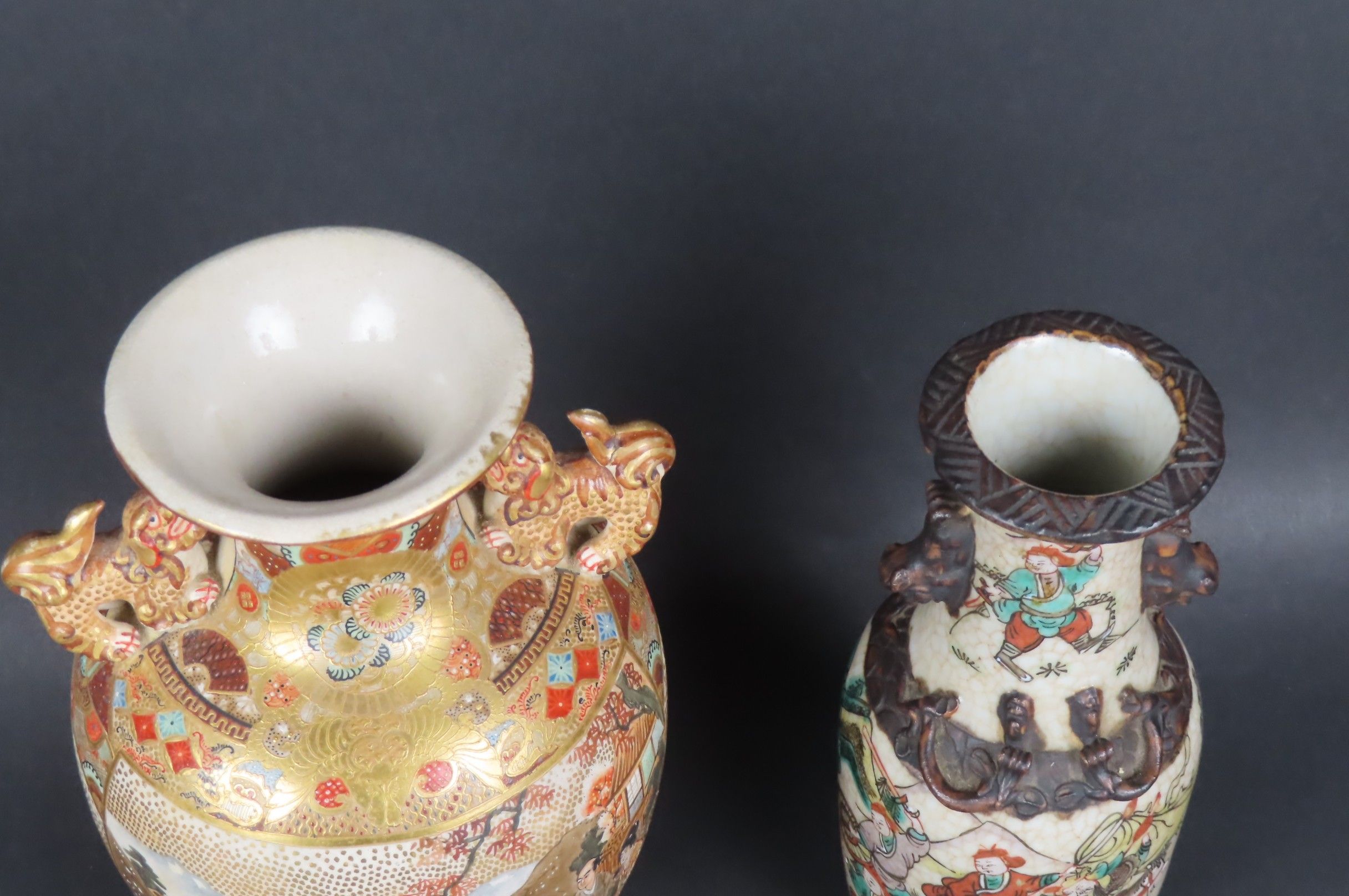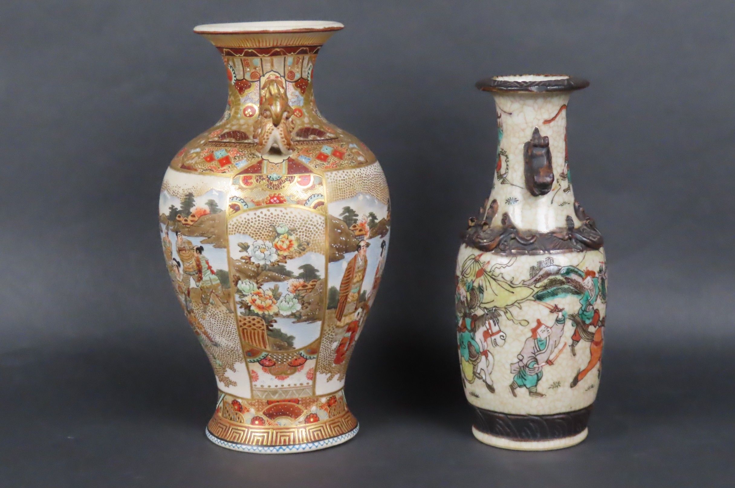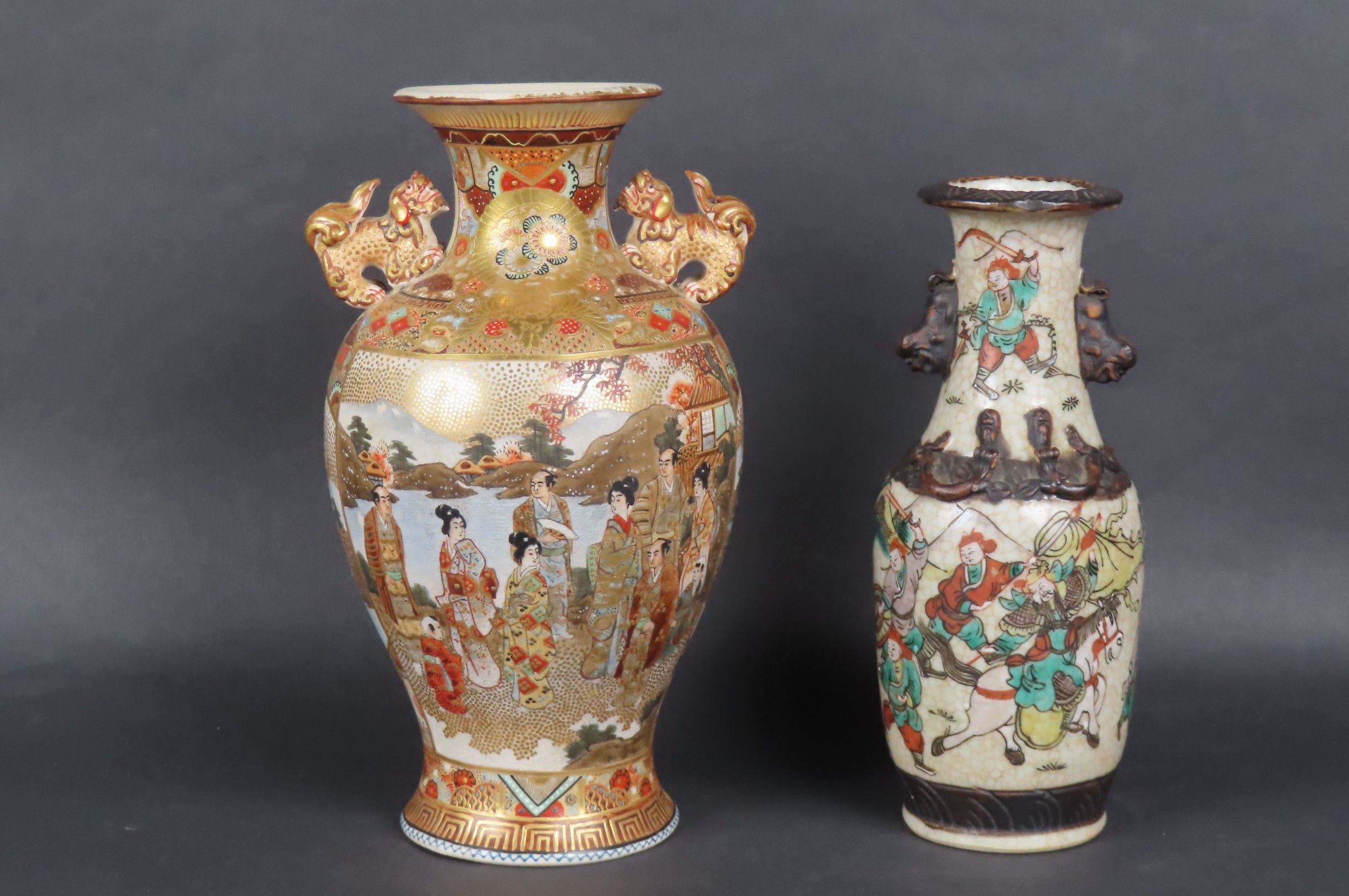 Two vases, one in Nanking porcelain decorated with fighting scenes and handles representing Buddhist lions. China (H: 21 cm) and a Satsuma earthenware vase decorated with Japanese in a landscape. Japan (H: 24 cm)