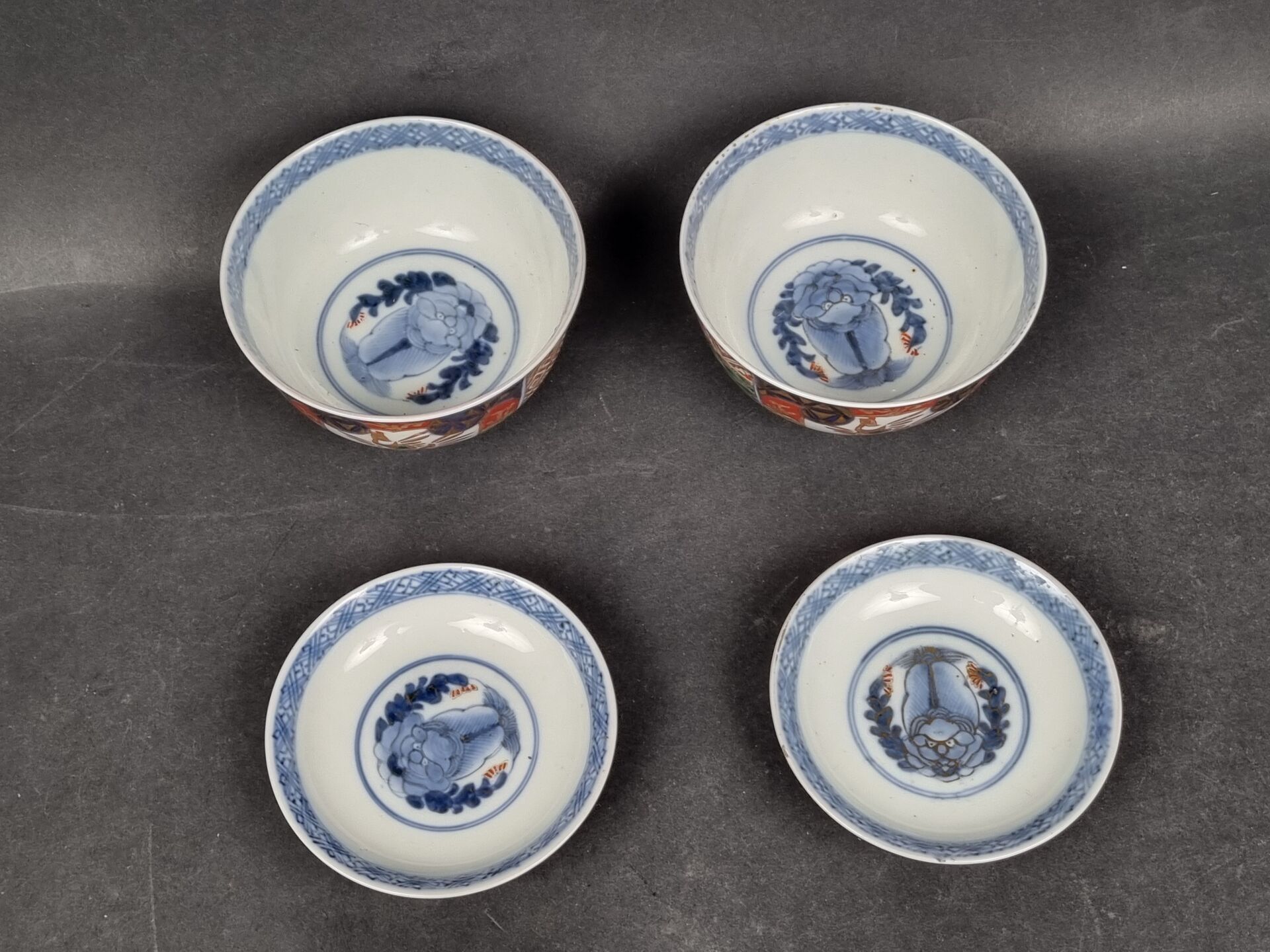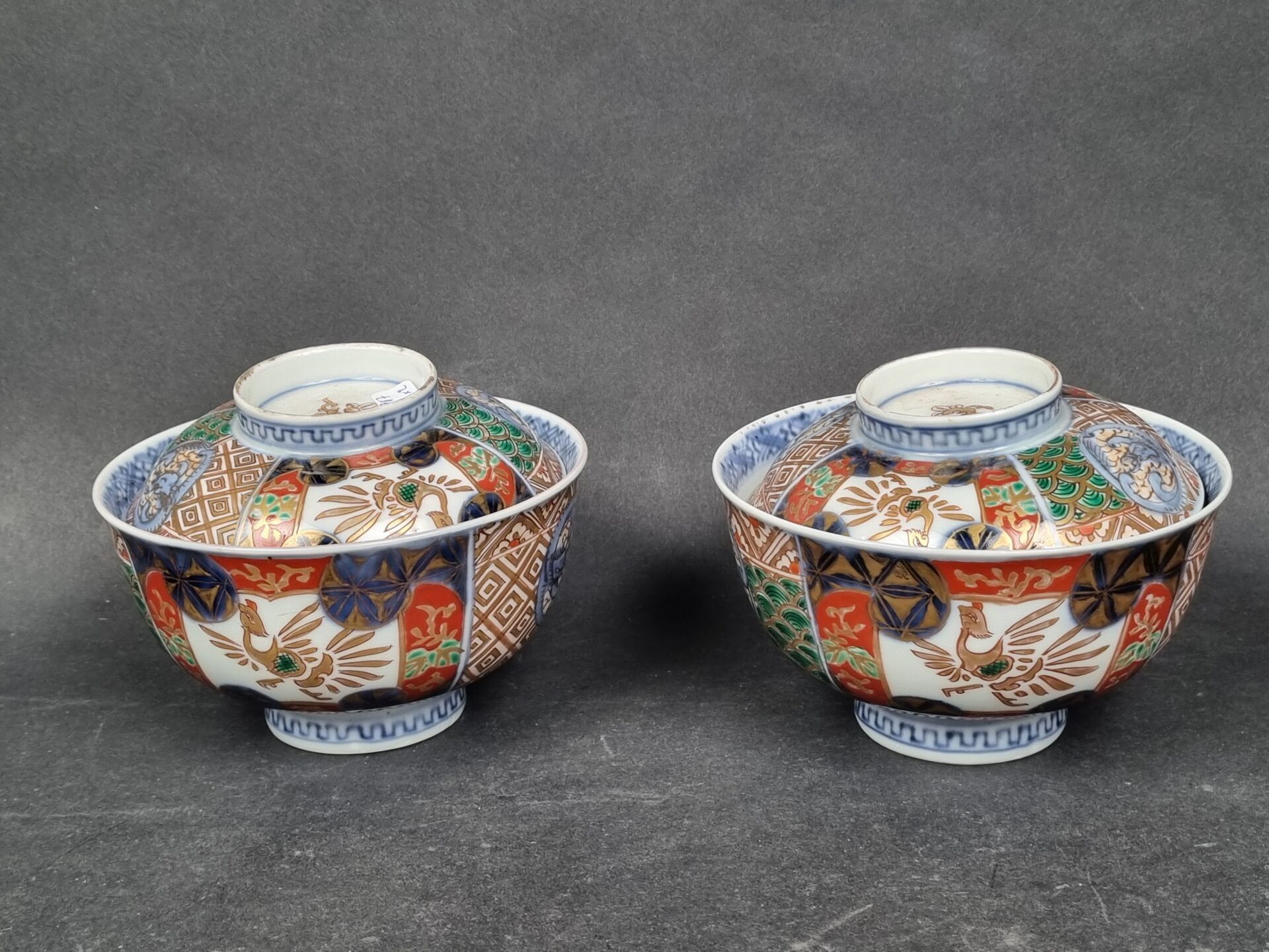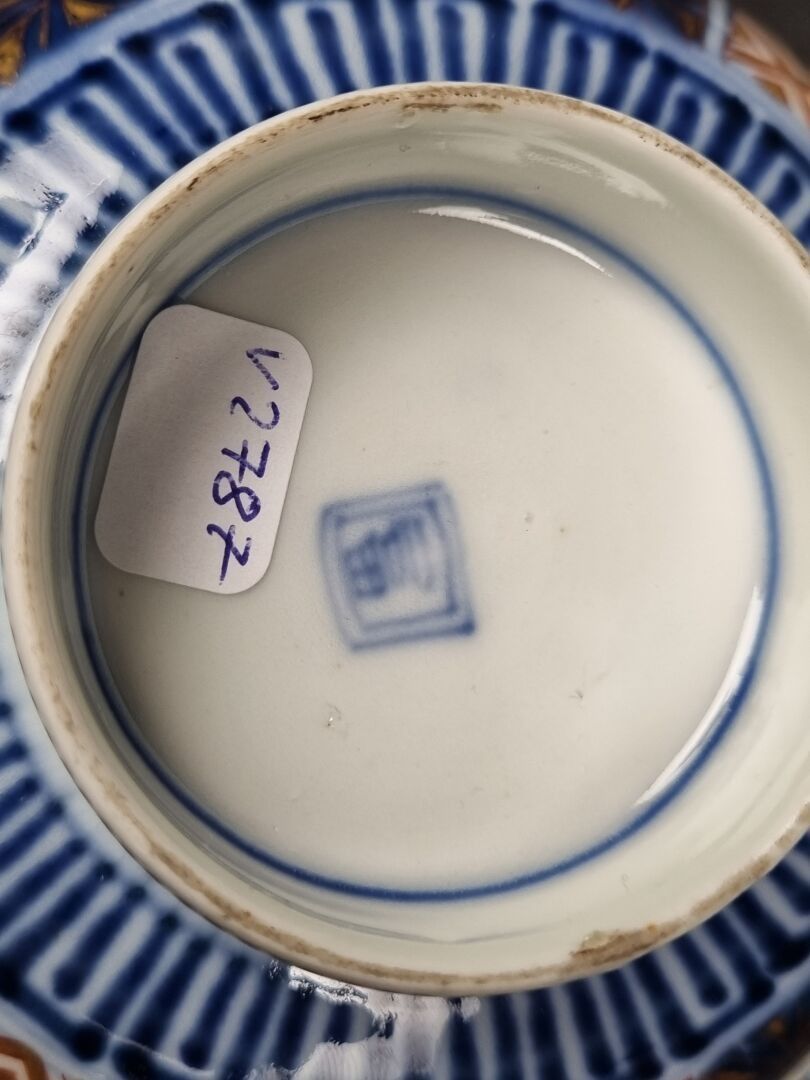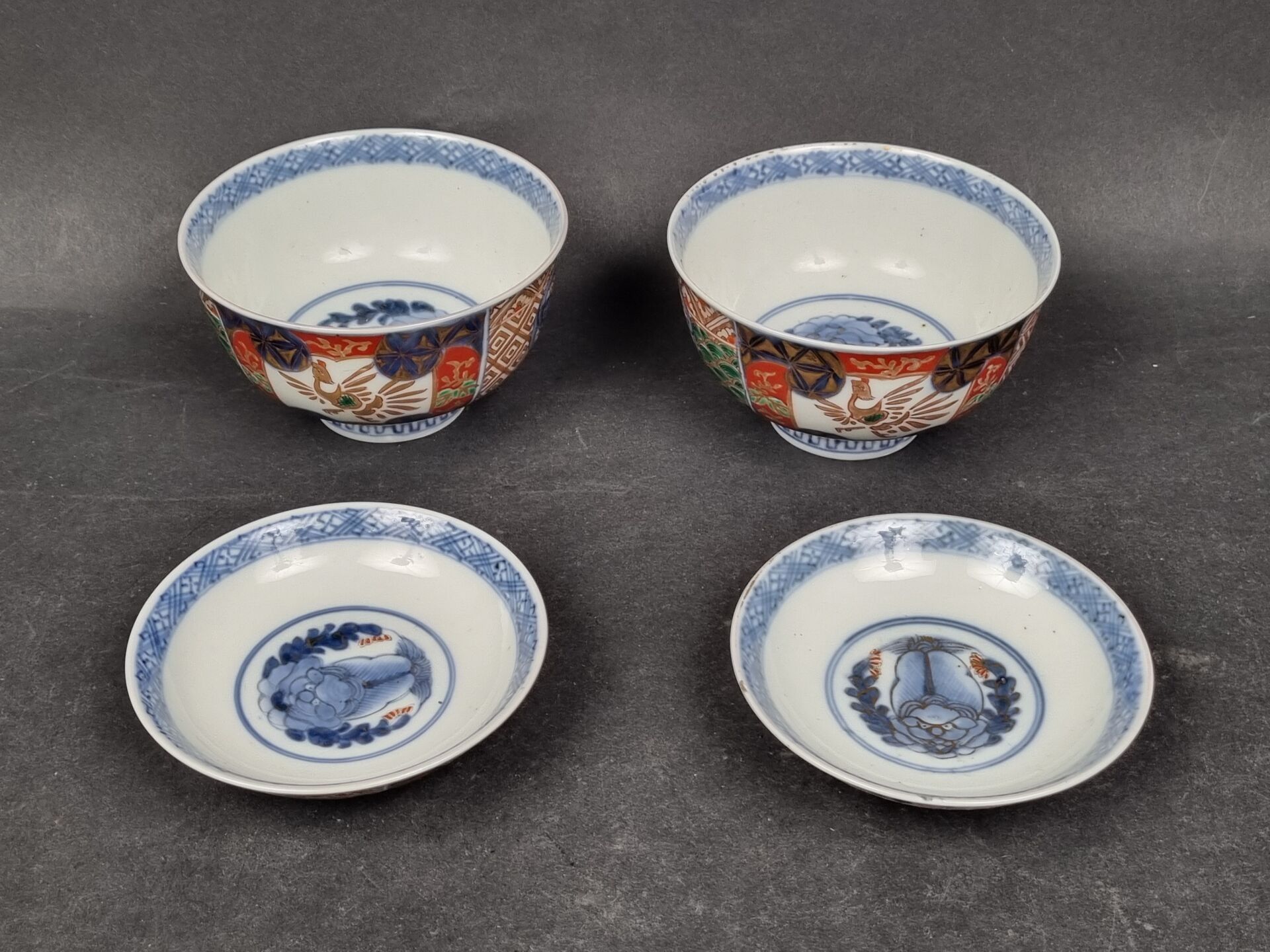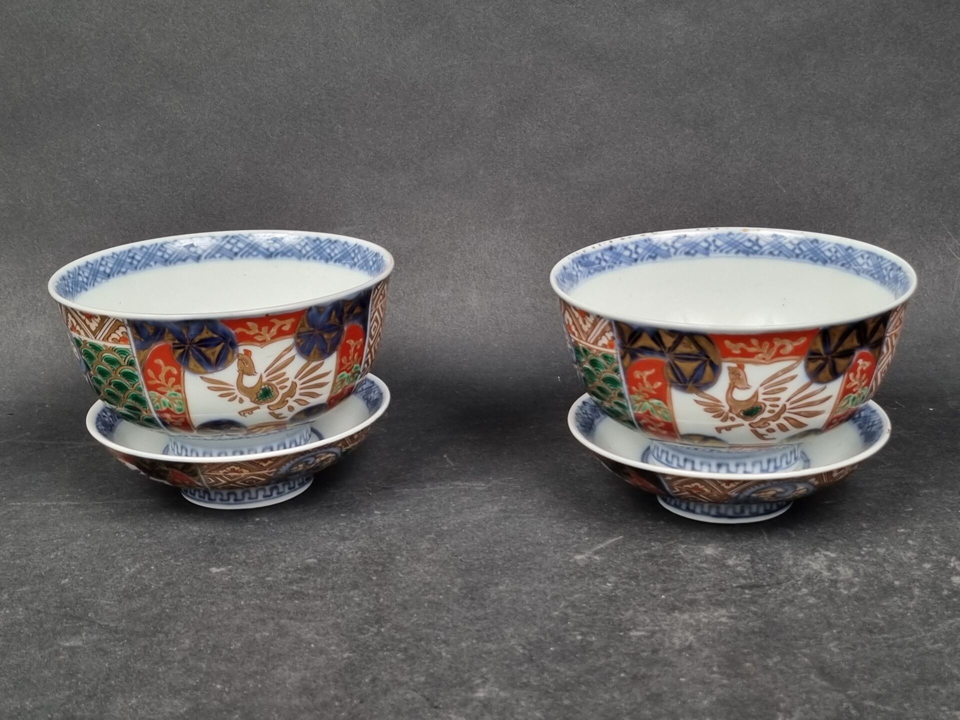 A pair of heeled bowls and a heeled cup in polychrome and gold porcelain. China