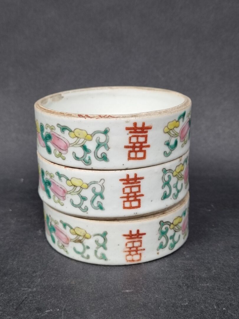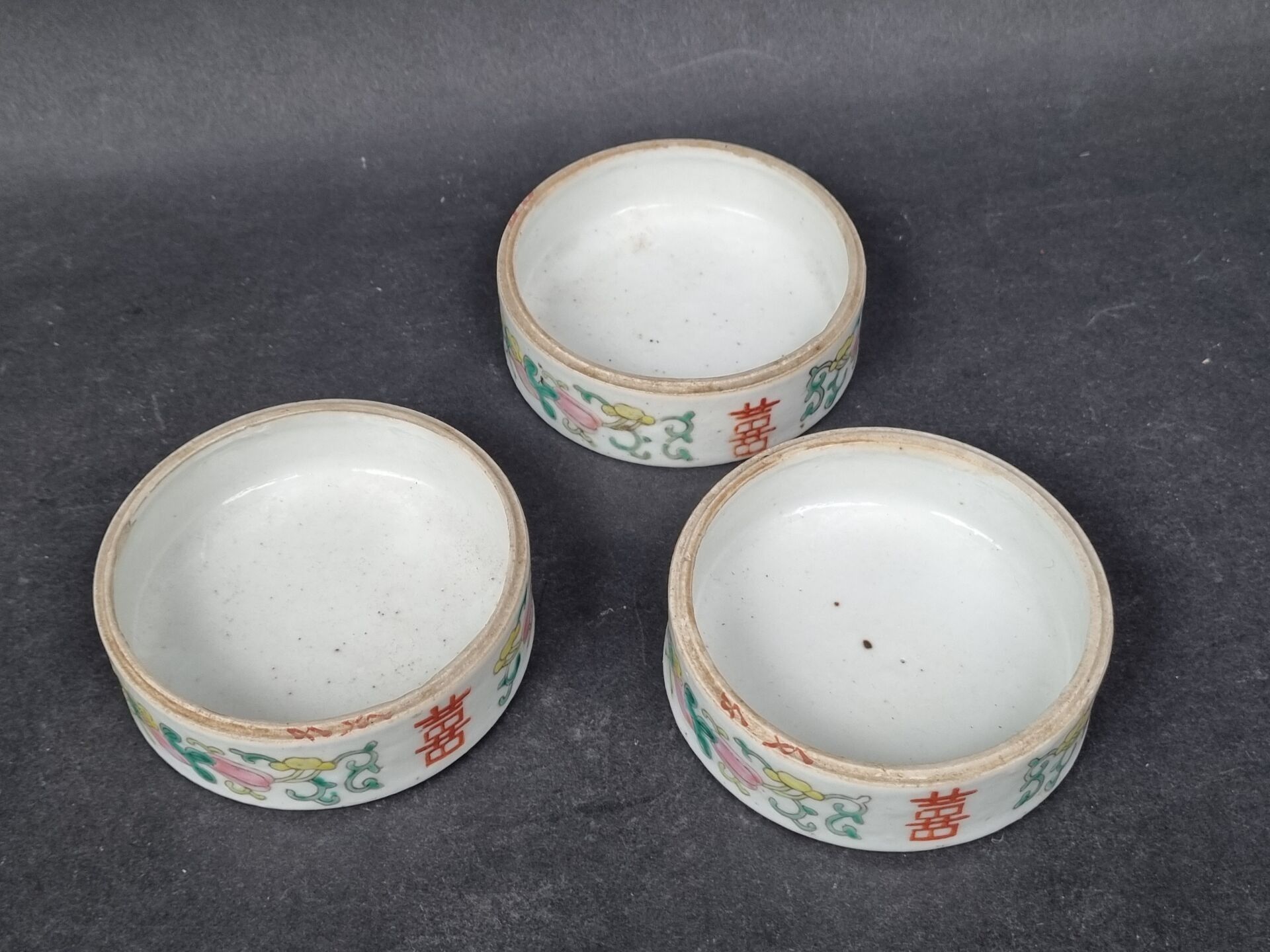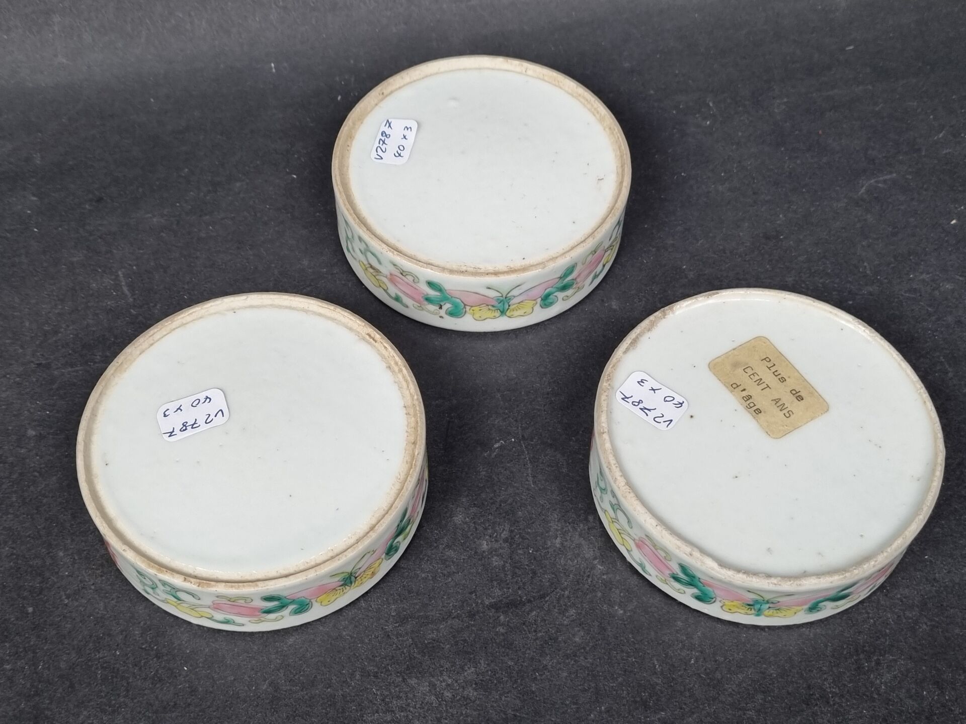 Set of three circular enamelled porcelain compartments with polychrome floral decoration on a white background. China (H: 3 cm; diam: 9 cm each)