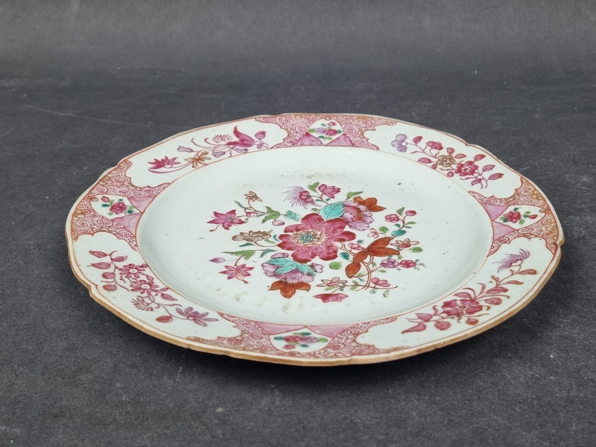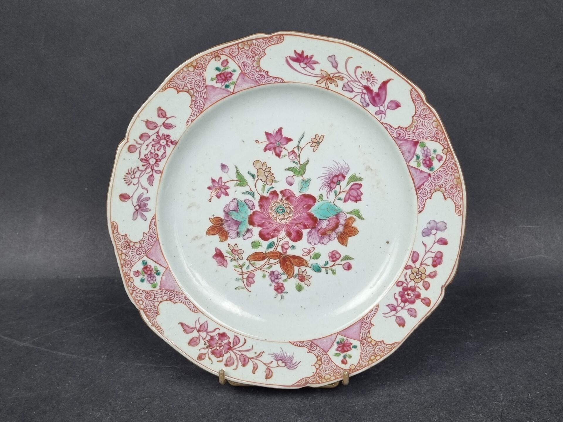 CHINA Compagnie des Indes. Porcelain plate, famille rose enamels, decorated with flowers. 18th century (diameter: 23 cm) (small chips)