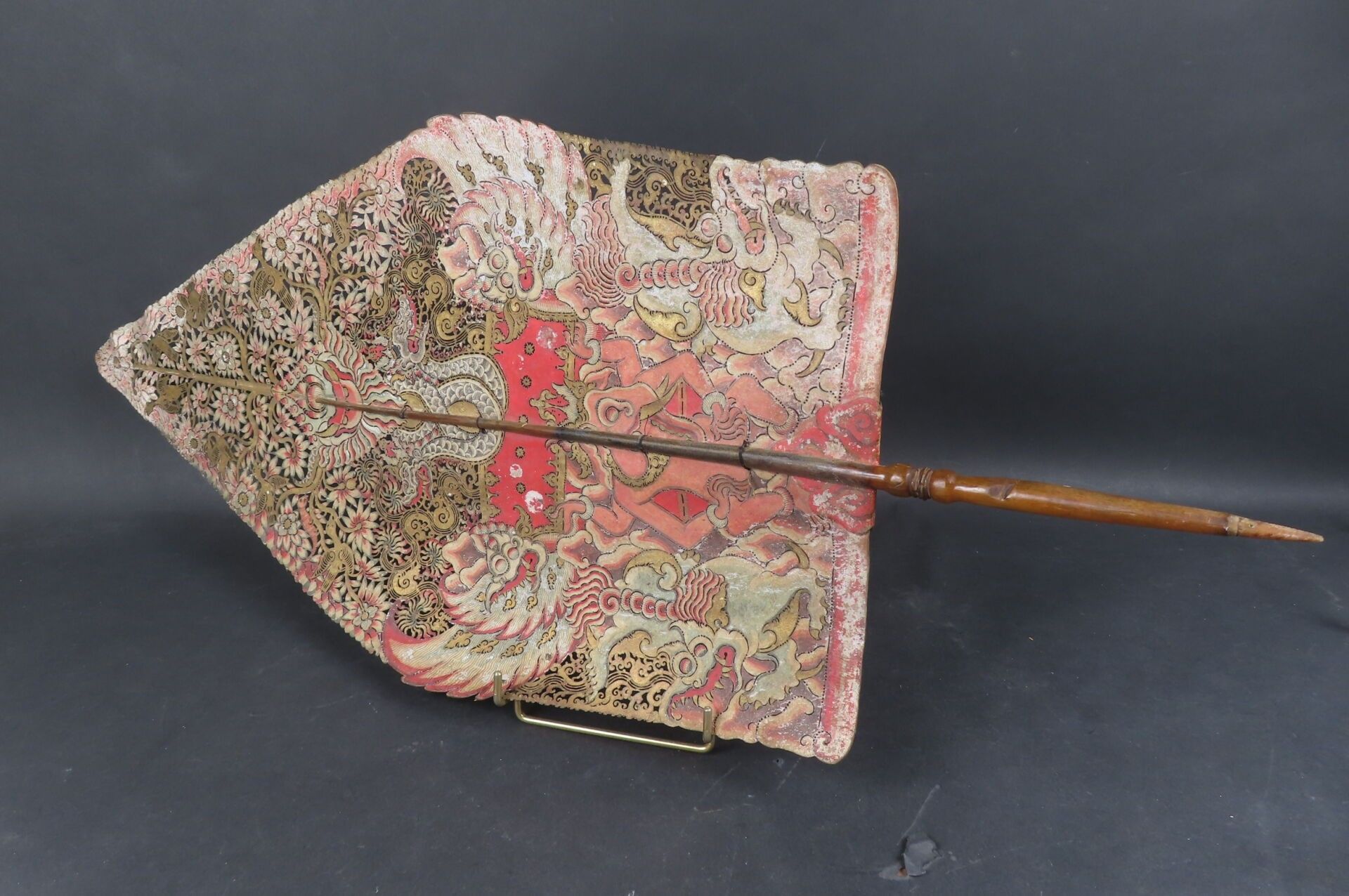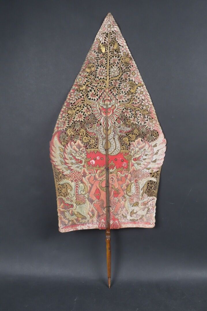 Large openwork painted shadow theatre leaf, wooden handle. Bali, 20th century (L: 85 cm) (small accidents and missing pieces)