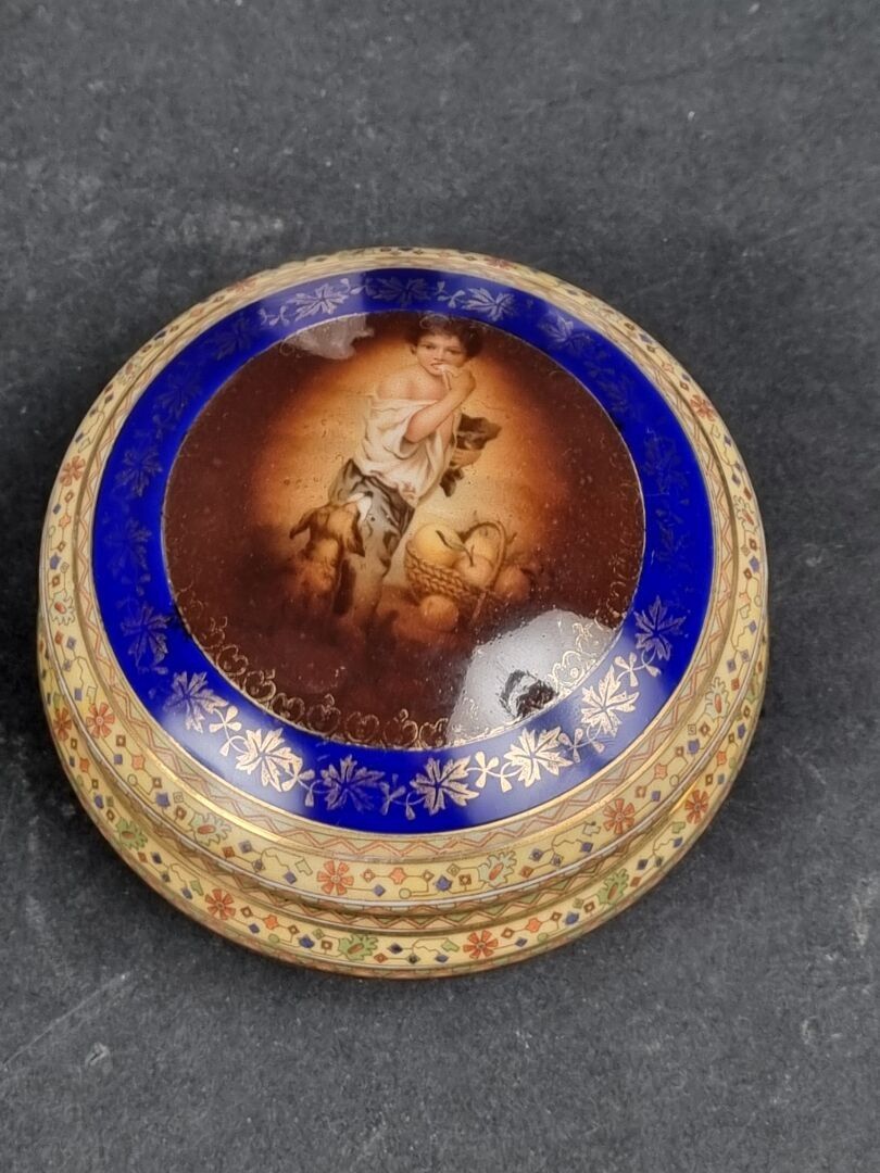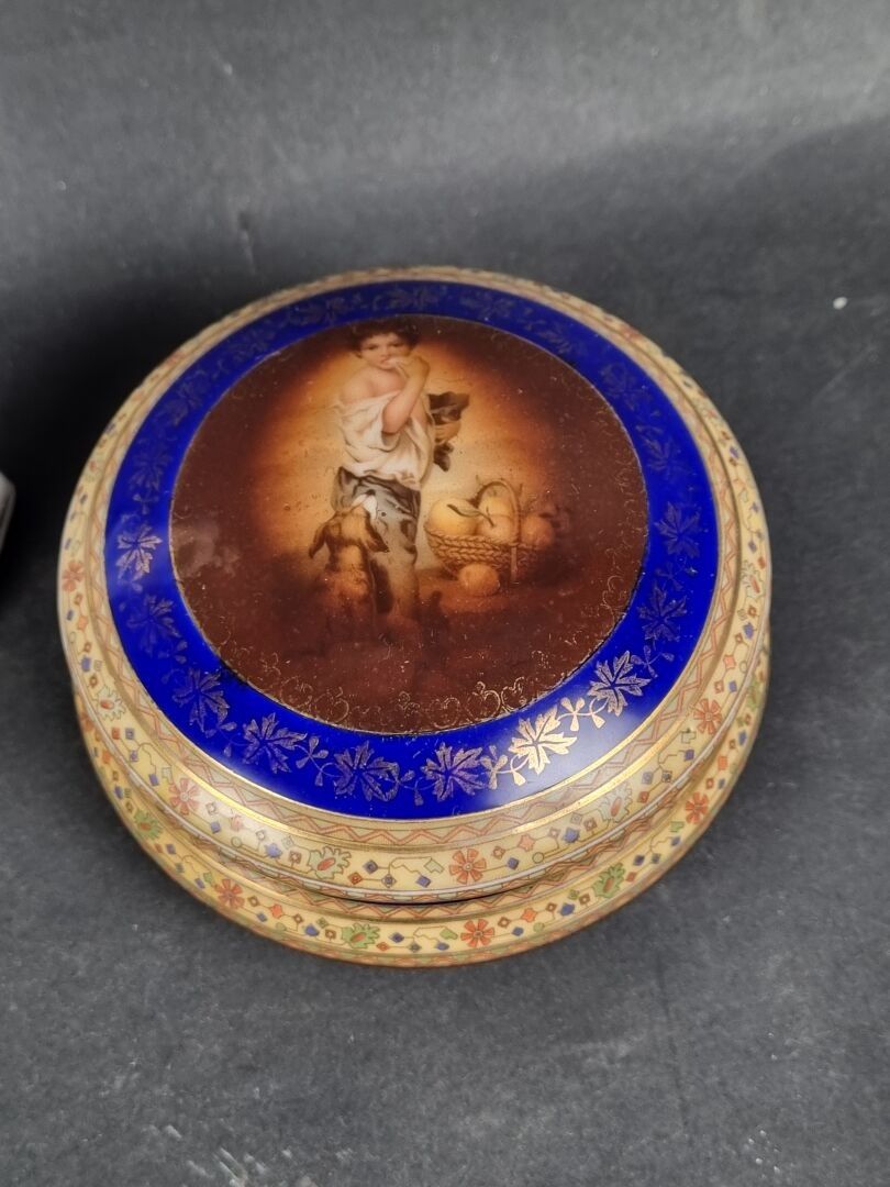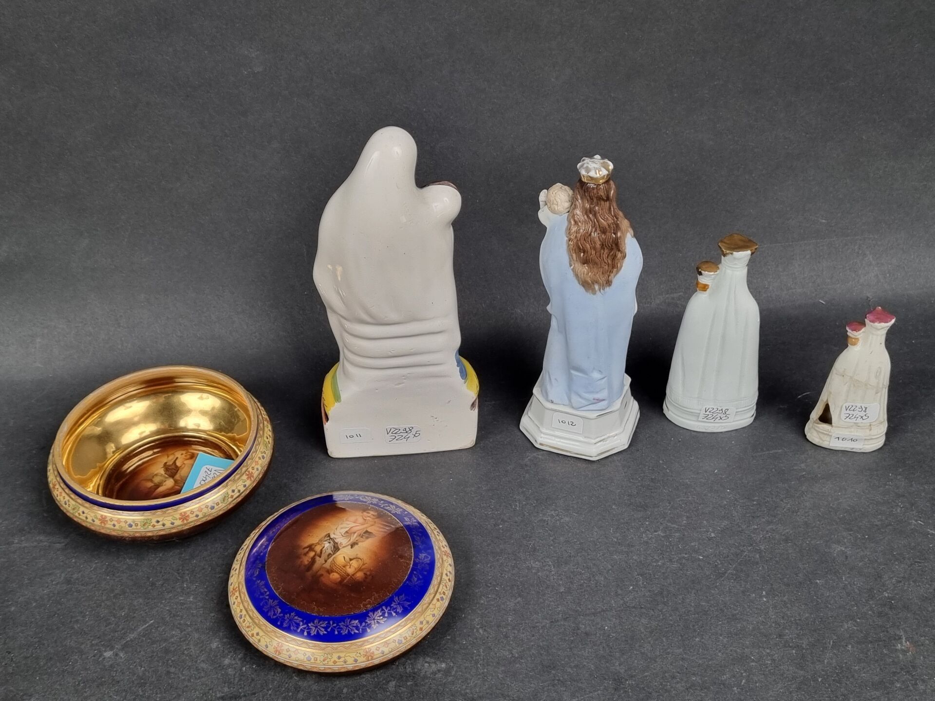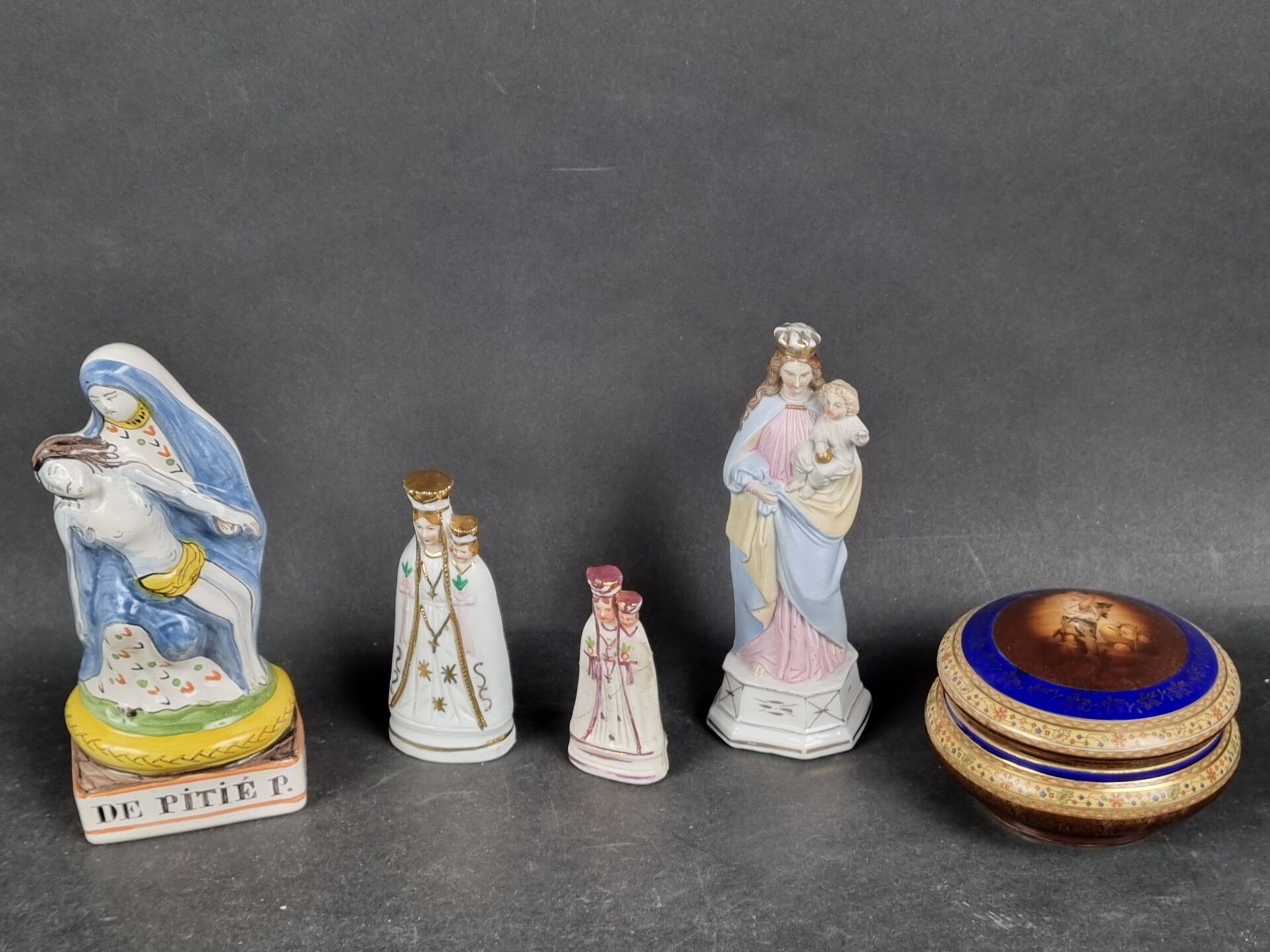 Lot comprising 1 porcelain Virgin of Notre Dame de Pitié P. (H.: 18 cm), 1 porcelain Virgin and Child (H.: 16 cm), 2 porcelain representations of the Virgin (H.: 11 cm / 8 cm) (the 8 cm representation is missing and cracked) and a signed porcelain bonbonnière from Slovaki.
