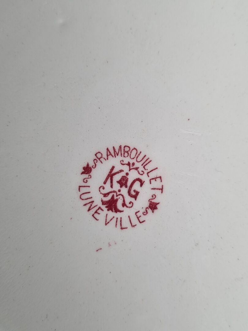 LUNEVILLE. Service set in red and white enamelled earthenware, Rambouillet model, comprising: 12 plates, 1 oval dish, 1 salad bowl and 1 circular dish.