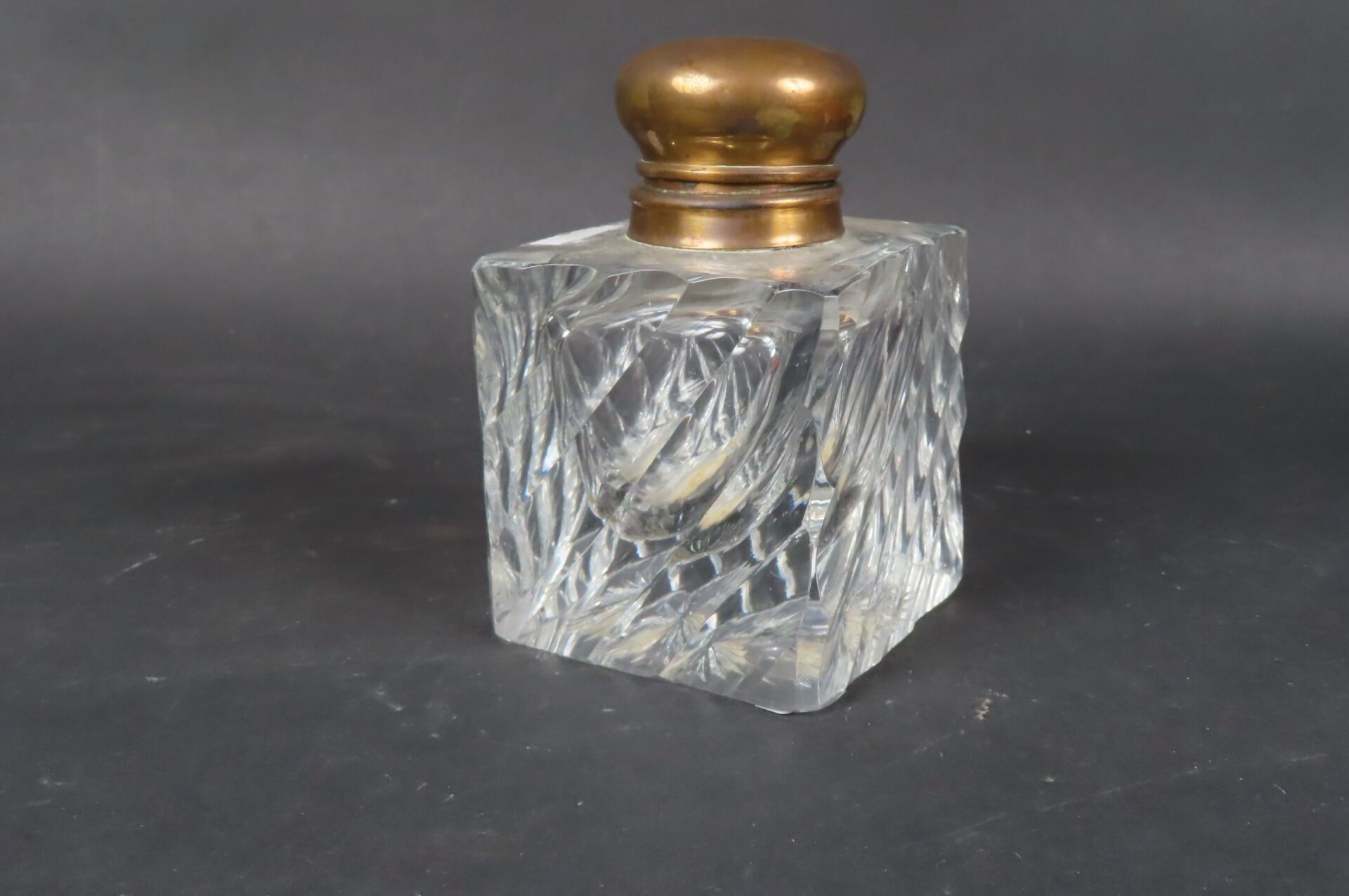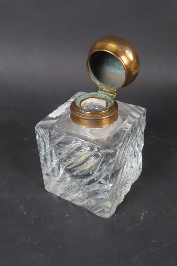 Large crystal inkwell with diagonal channel decoration, metal frame (16 x 10.5 x 10.5 cm) (chips)