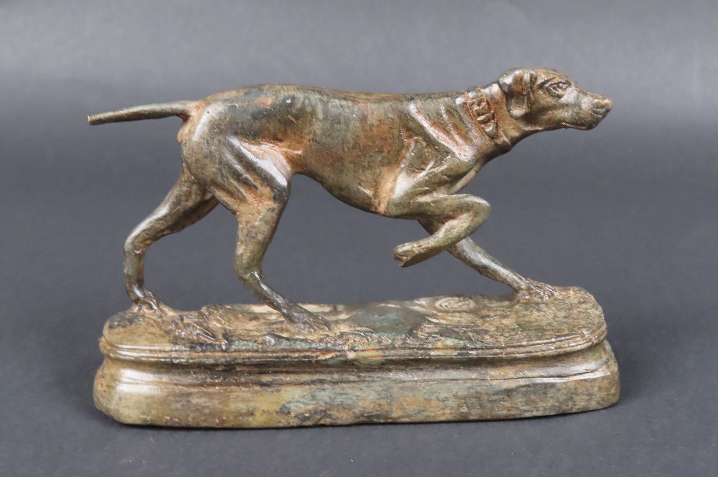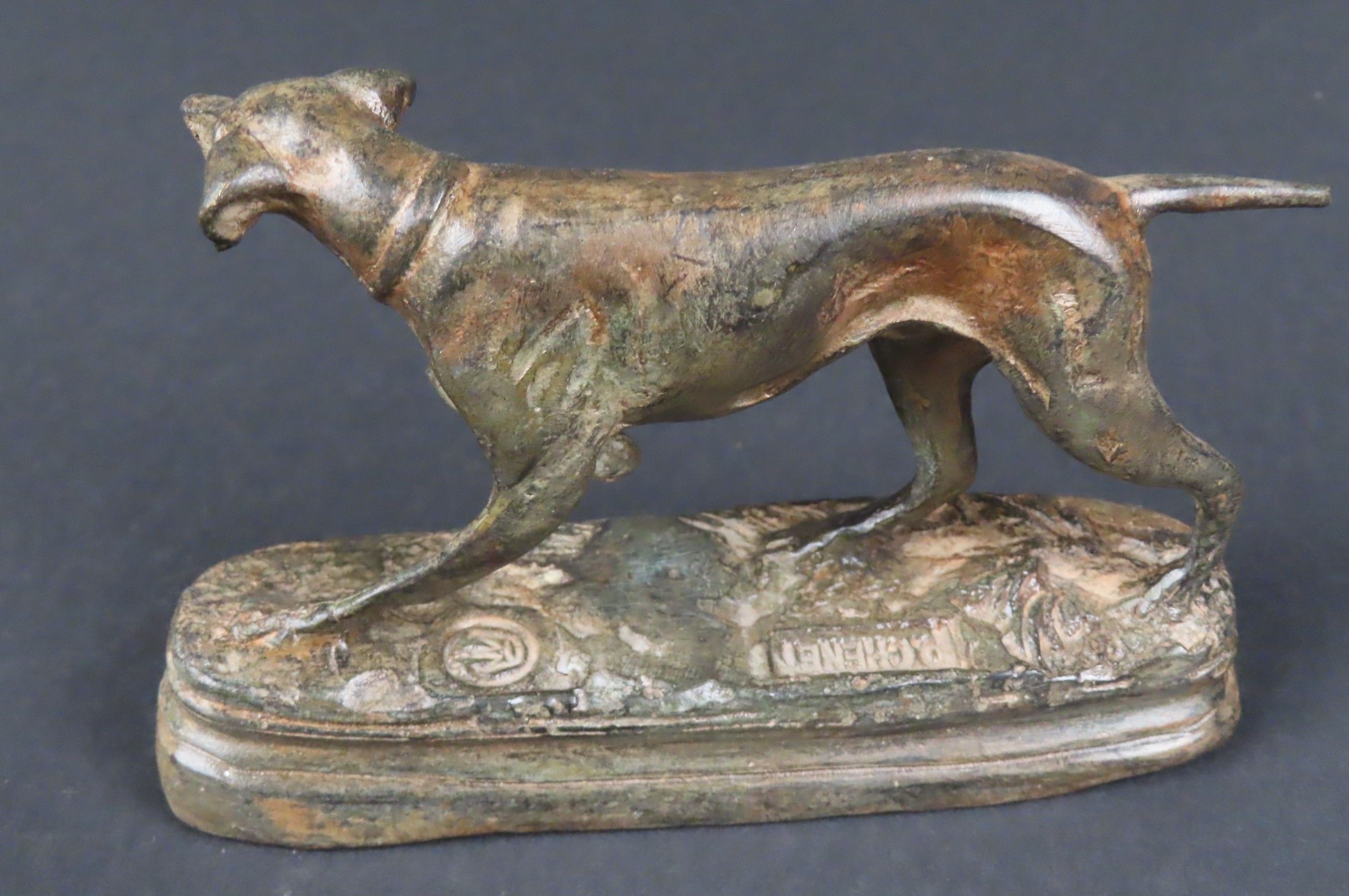 Pierre CHENET (XX-XXIth). "Hunting dog standing still", bronze subject with shaded patina, signed on the terrace (H: 8.5 cm; L: 14 cm) (small missing tail)