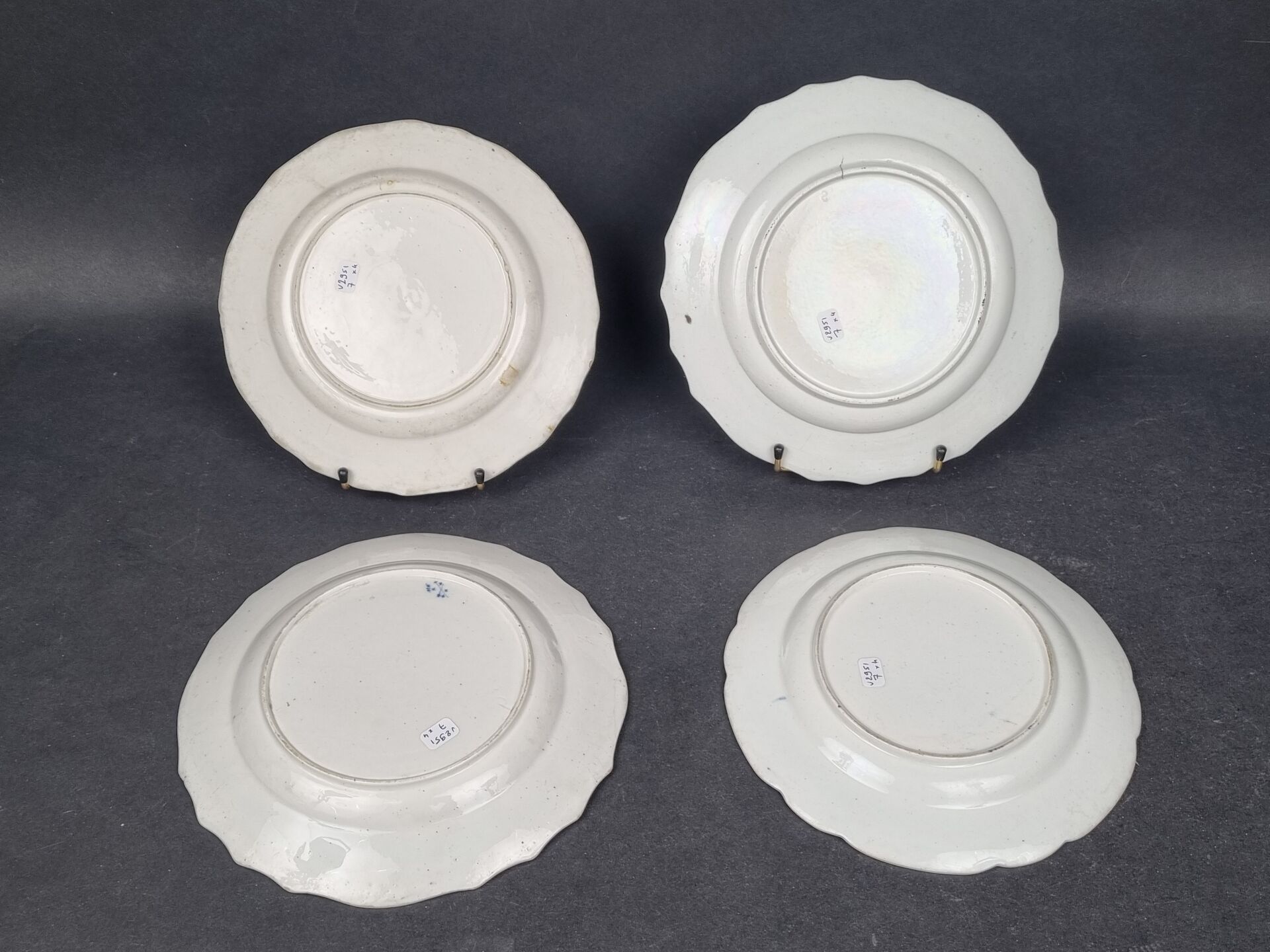 TOURNAI. Set of 4 soft-paste porcelain plates comprising: 1 blue-white plate with Ronda design, 1 manganese plate with Ronda design (one chip), 1 plate with Mouche design (one chip), 1 plate with Chantilly sprig design