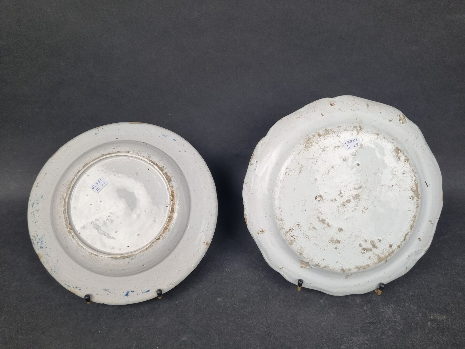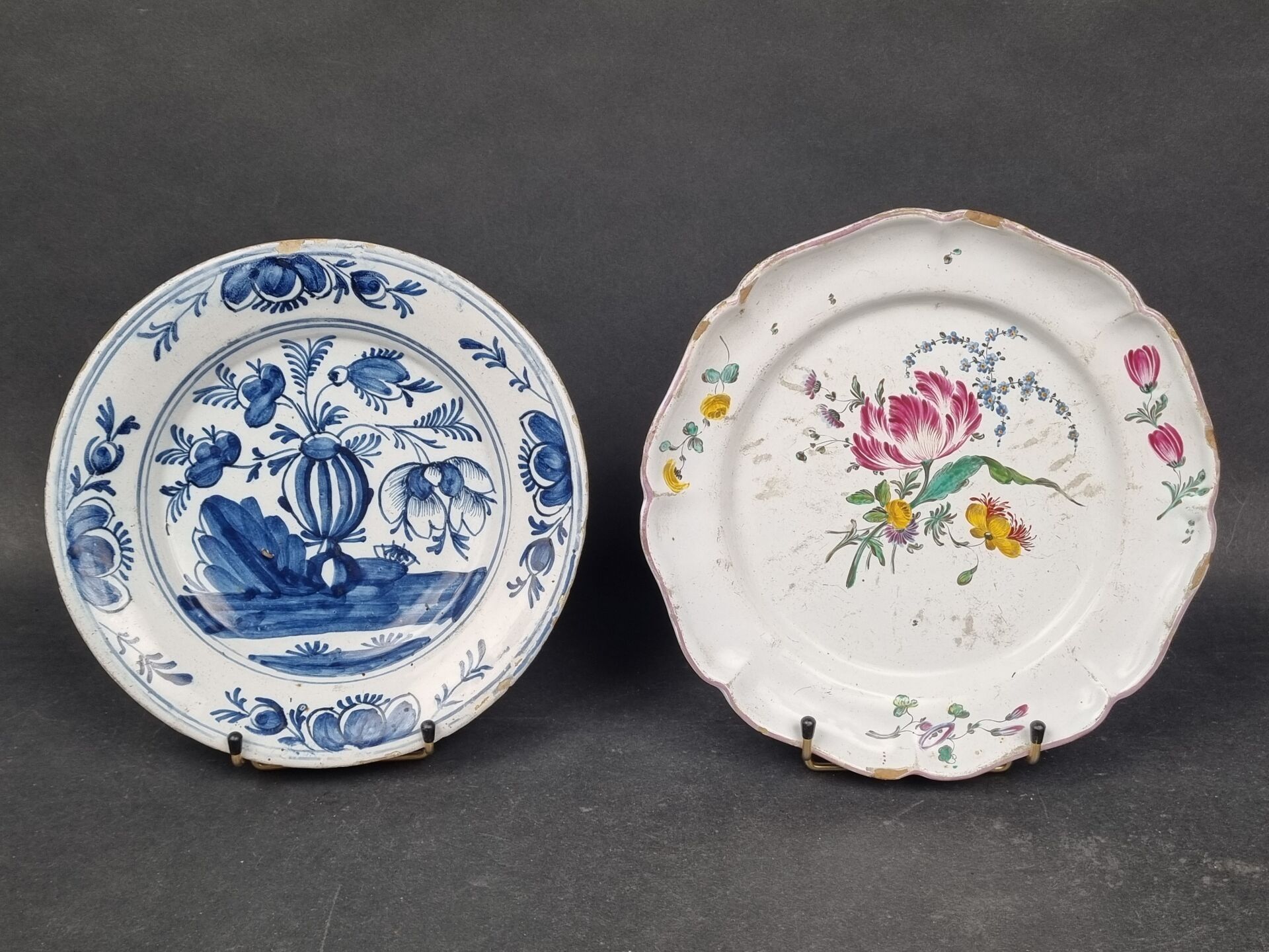 Lot comprising: 1 polychrome enamelled earthenware plate with flower design. 18th century, Aprey ? (diam: 24 cm) (small chips, wear) and 1 blue-white enamelled earthenware plate with foliage decoration. Delft, 18th century (diam: 22.5 cm) (missing enamel around the edge)