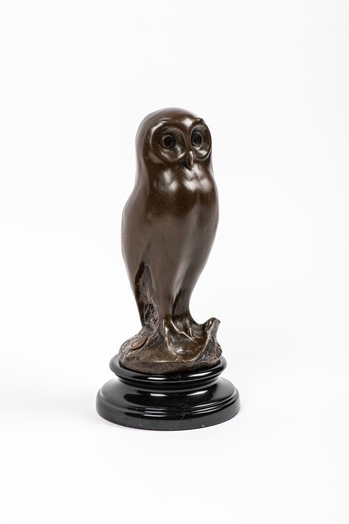 MILO (20th). "Owl", bronze subject with brown patina, black marble base (H: 25 cm)