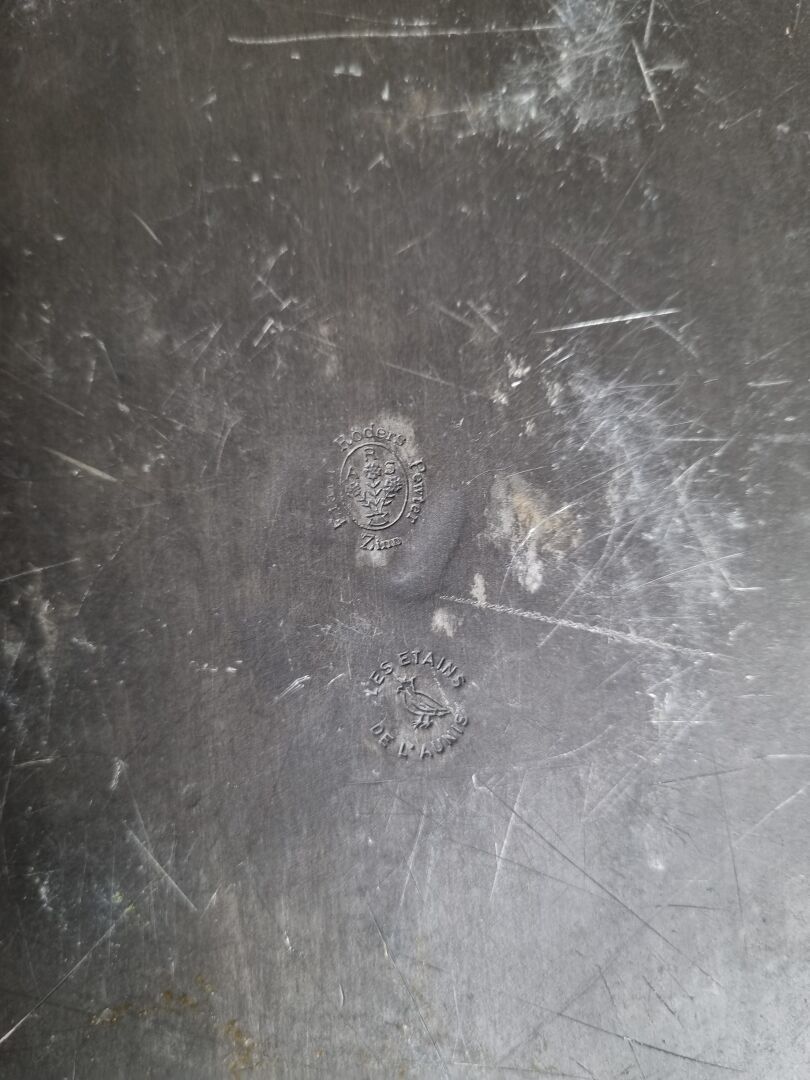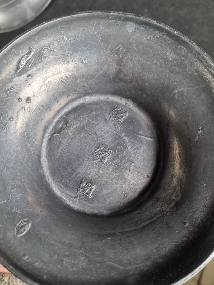 Set of pewter including: 1 pair of candelabras, 1 covered tureen and 1 plate