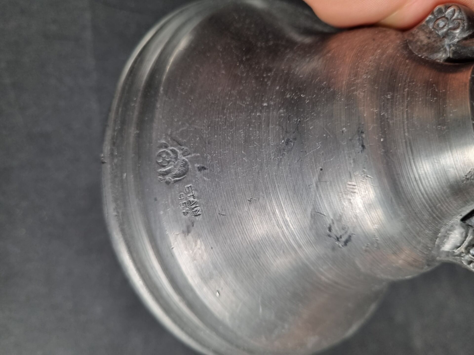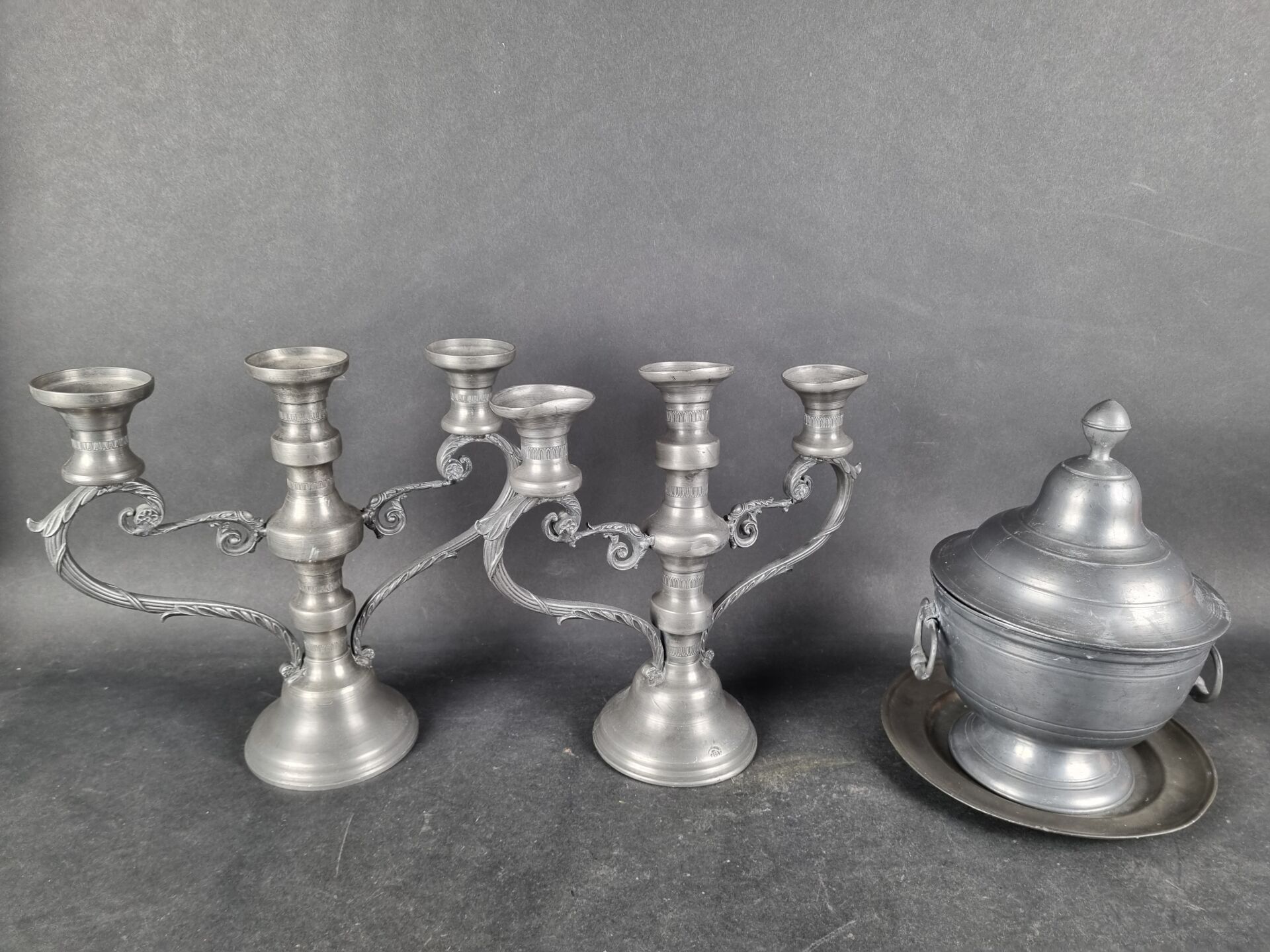 Set of pewter including: 1 pair of candelabras, 1 covered tu…