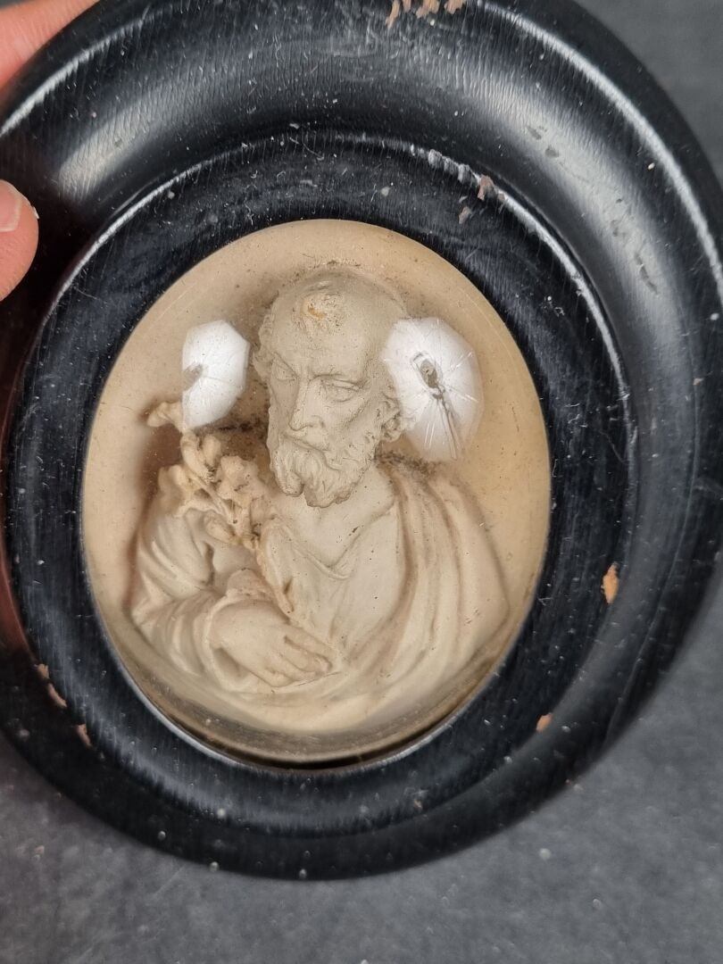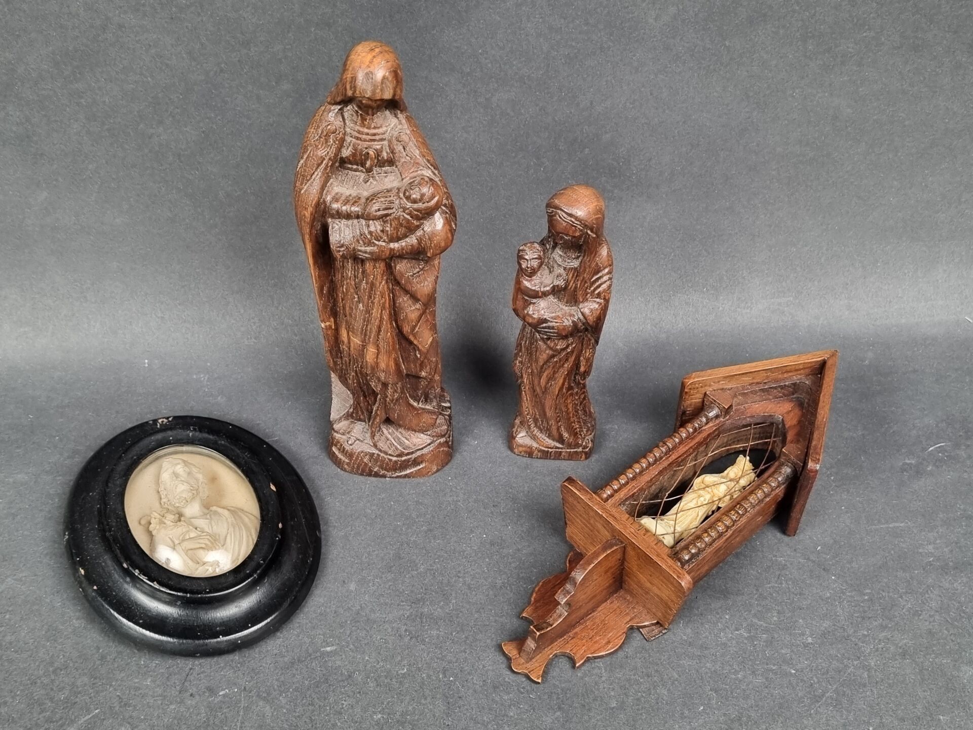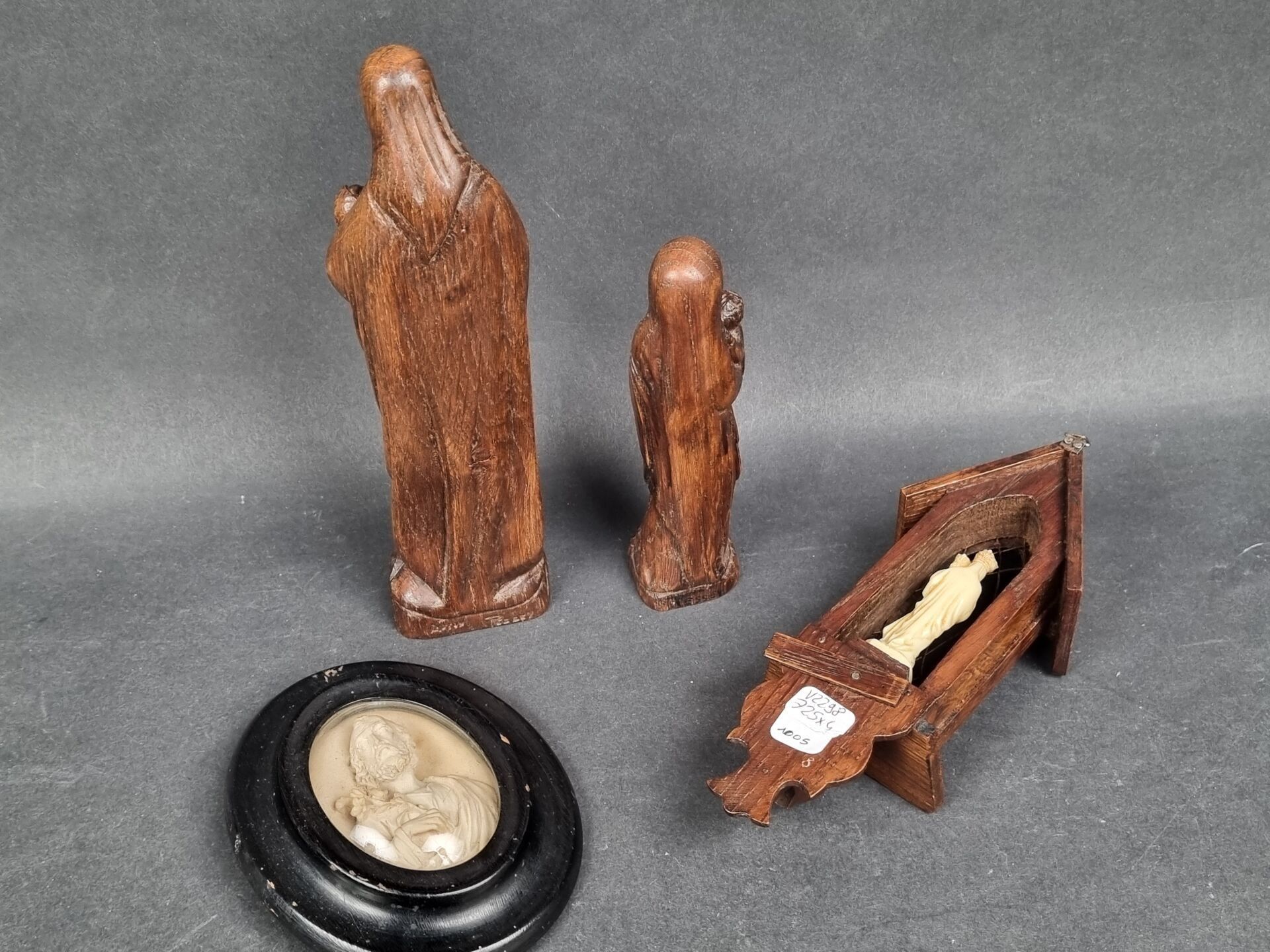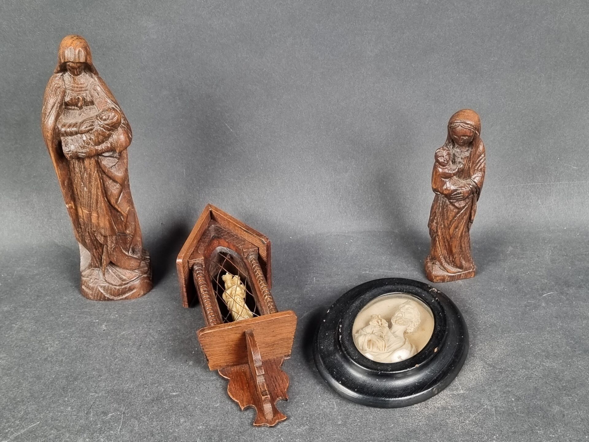 Lot comprising 1 small carved wooden chapel with Virgin inside (H.: 18 cm), 1 carved wooden statuette representing the Virgin of Autun (H.: 20 cm), 1 carved wooden statuette representing the Virgin and Child (H.: 13 cm) and a small frame containing a carved stone representing St Joseph (H.: 11.5 cm).