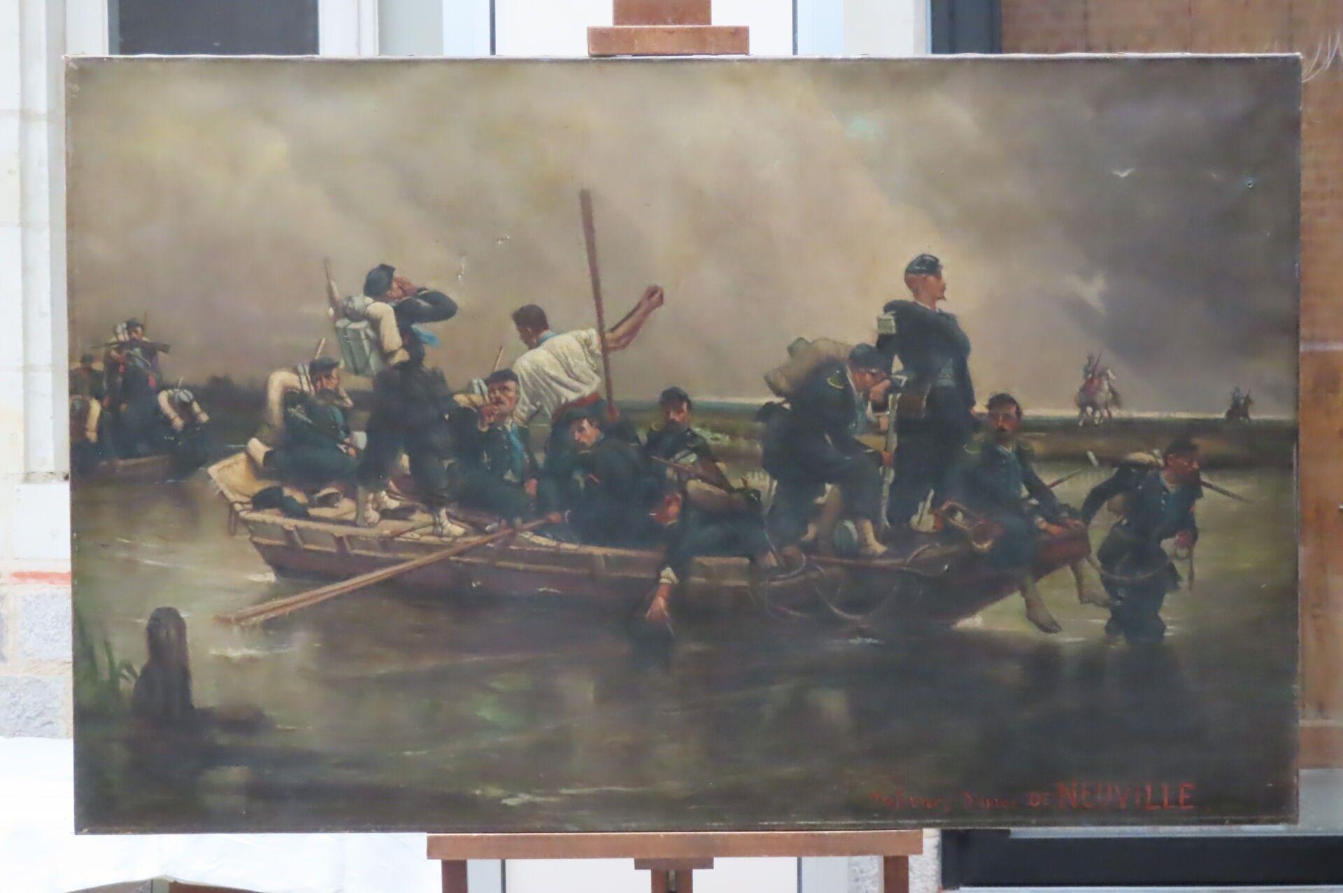 Late 19th century school, after Alphonse DE NEUVILLE (1835-1885). "Éclaireurs d'avant-garde passant une rivière (Crimée)", oil on canvas, signed lower right "Defernez d'après DE NEUVILLE" (88 x 140 cm) (accident, restorations)