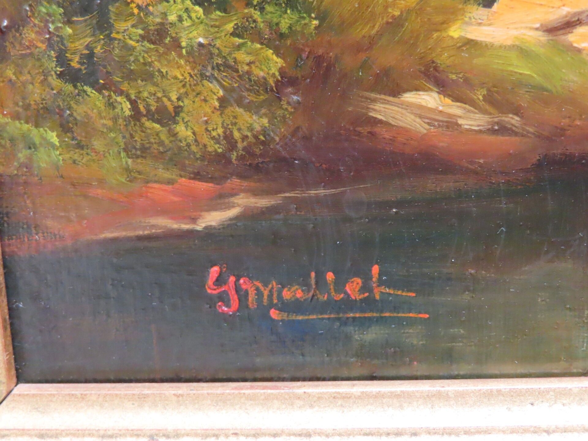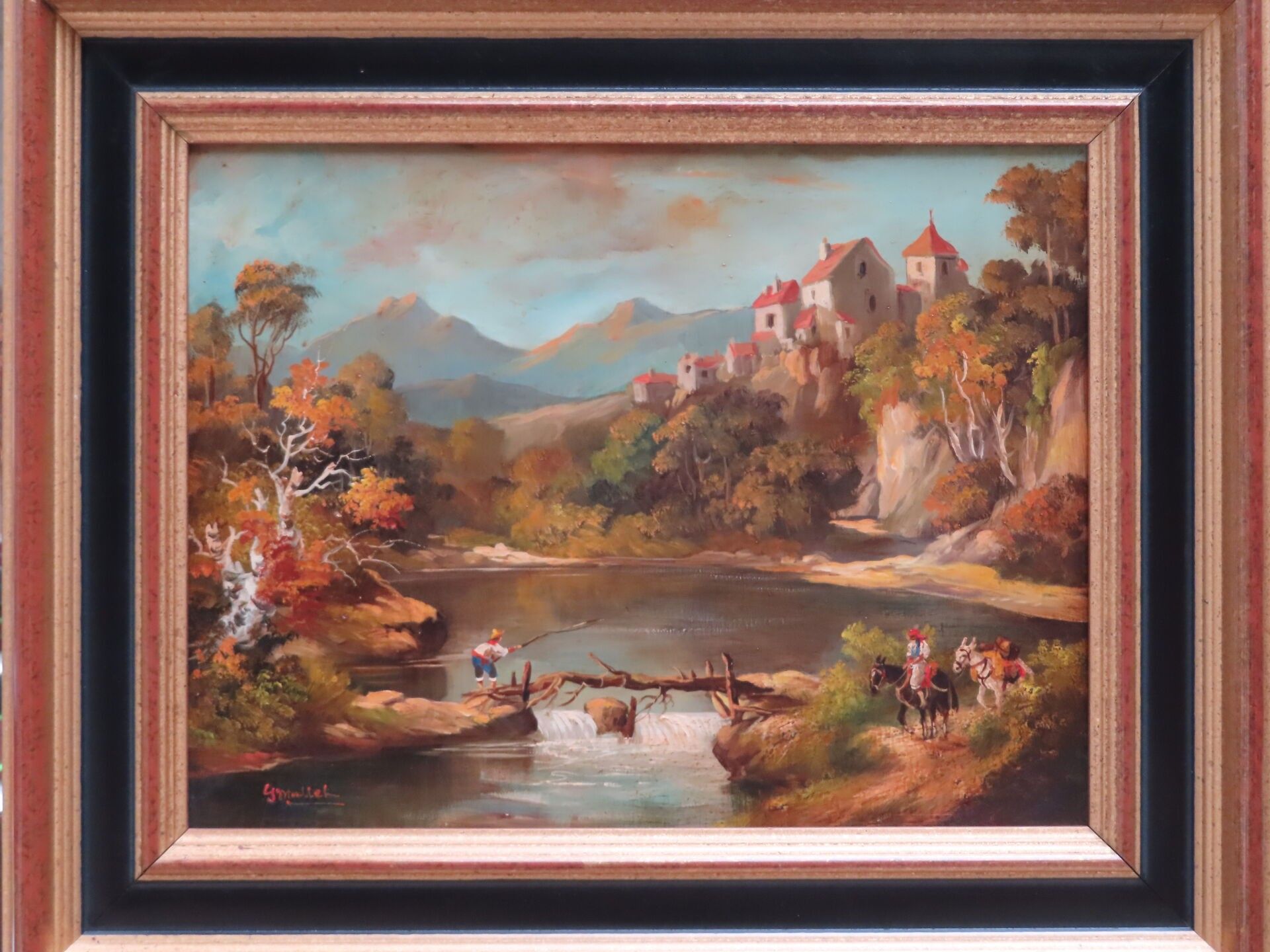 Georges MALLET (20th). "Landscape with fisherman and town in background", oil on canvas, signed lower left (27 x 35 cm)