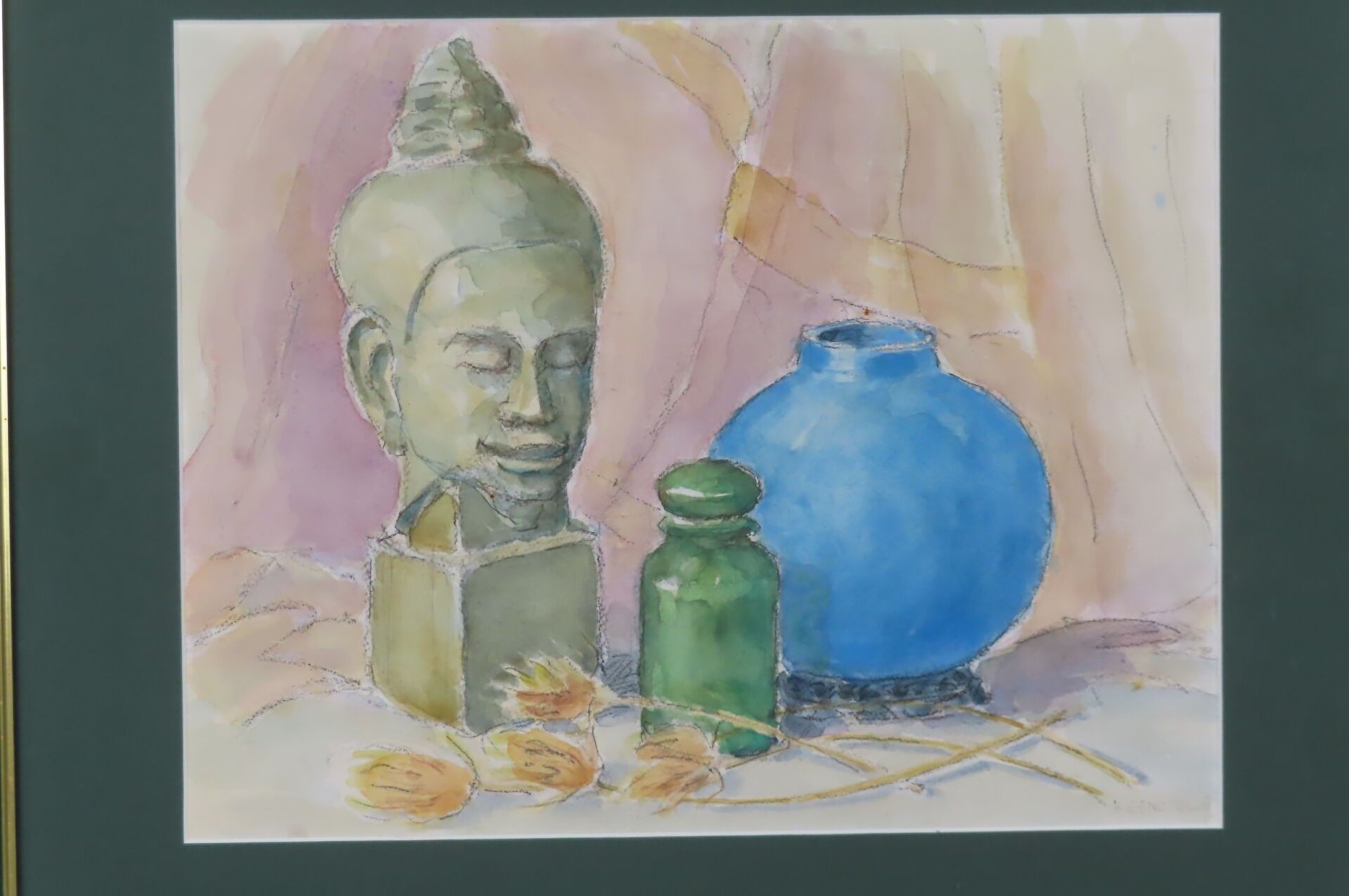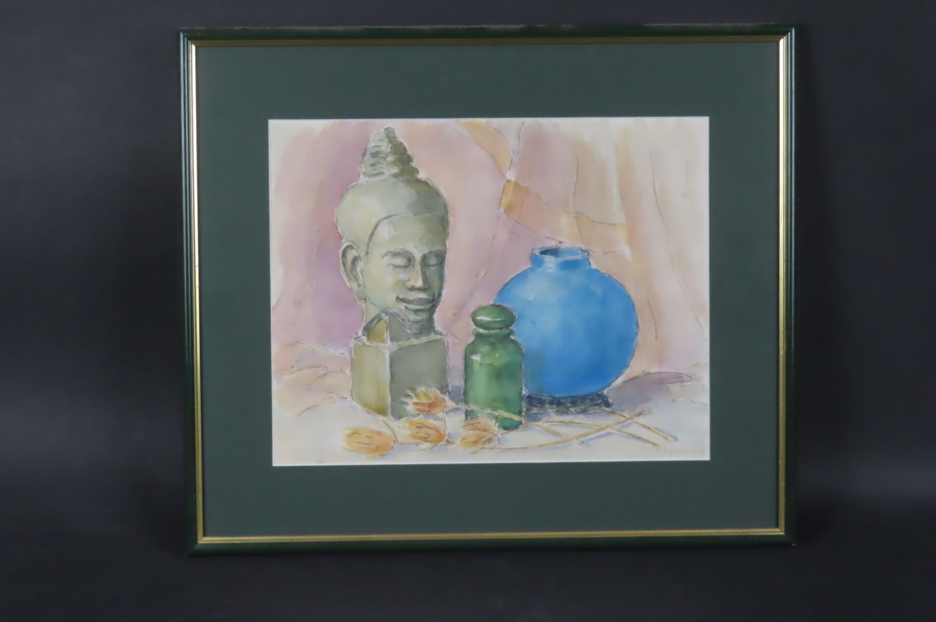 H. GENOTELLE (20th). "Still life with Buddha and blue vase", pencil and watercolour, signed lower right (with frame: 40 x 46 cm)