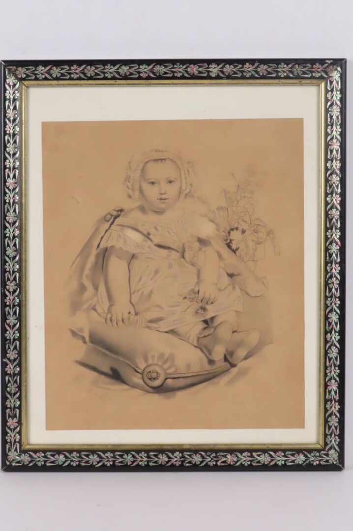 J. GIFFARD (XIXth). "Bébé assis sur un coussin", graphite drawing, signed lower left and dated 1880 (at sight: 27 x 22.5 cm). Blackened wood frame decorated with a frieze of flowers in imitation of the burgau.