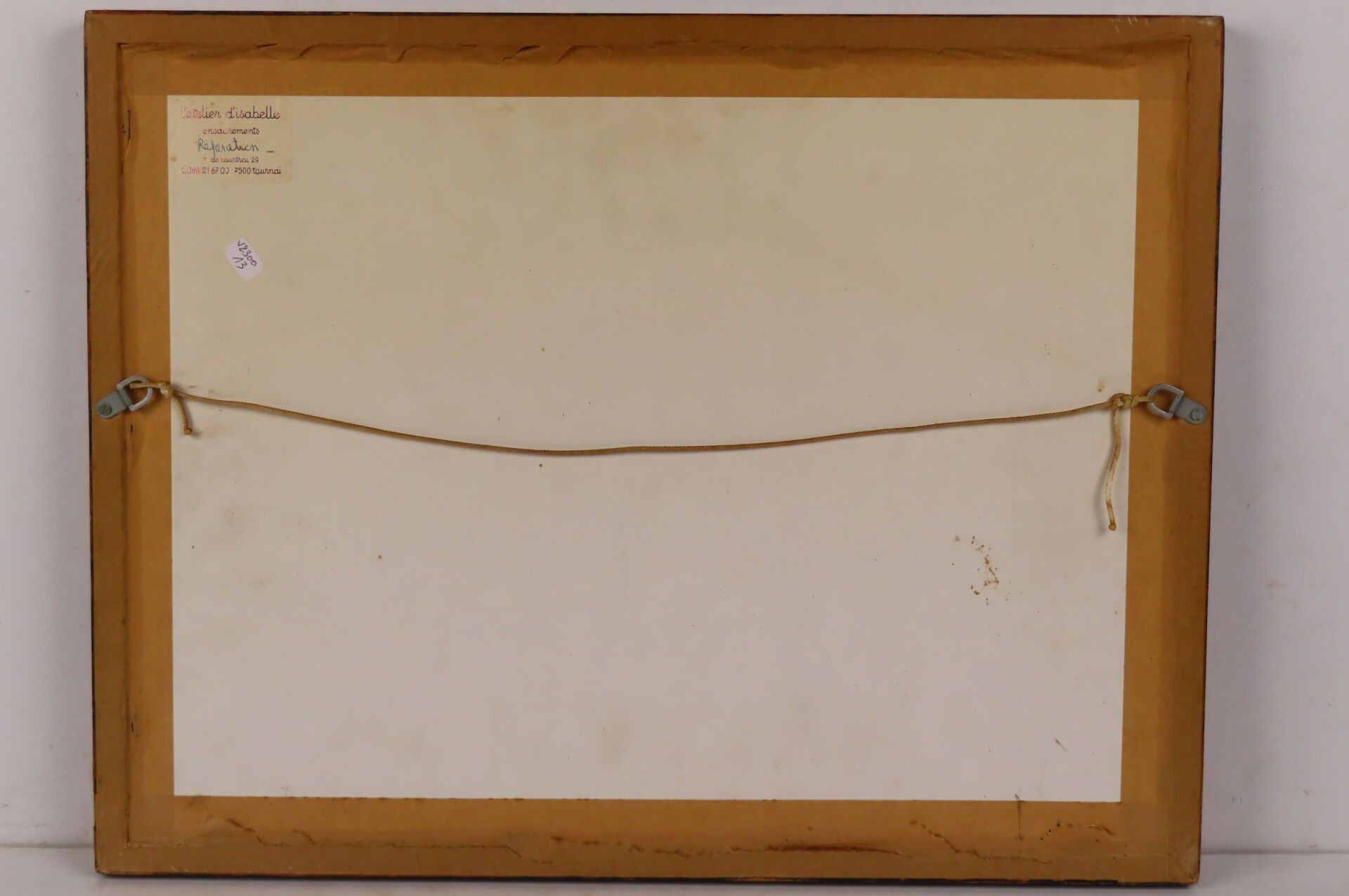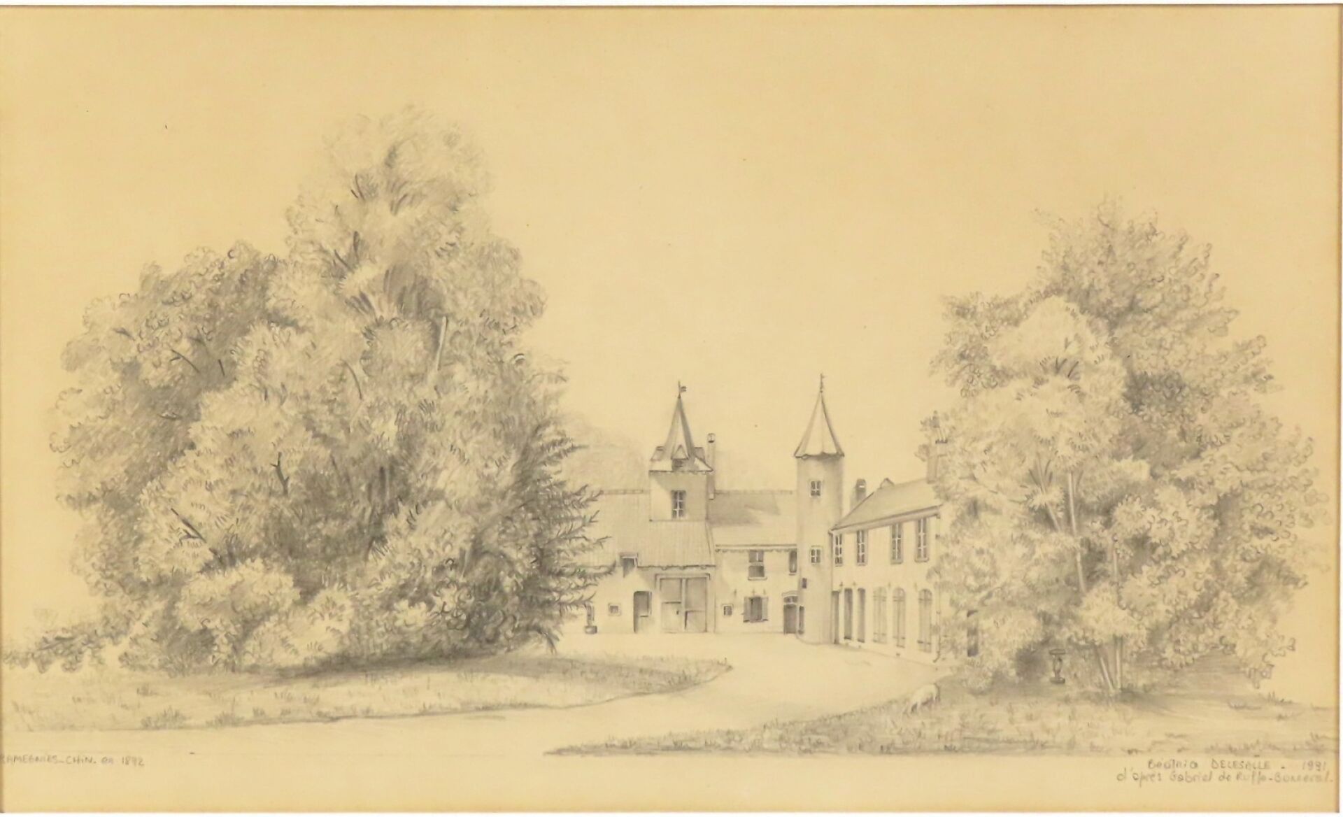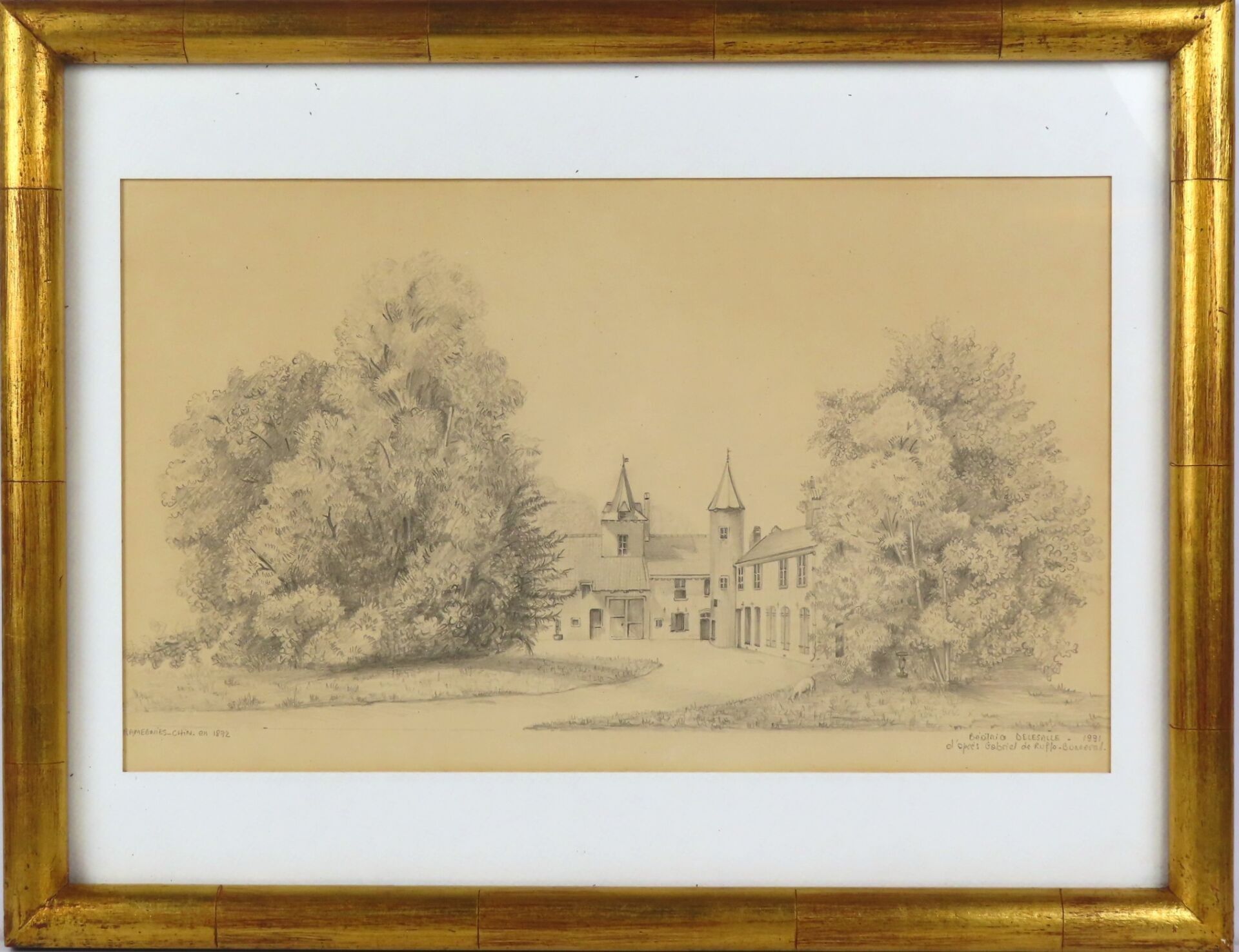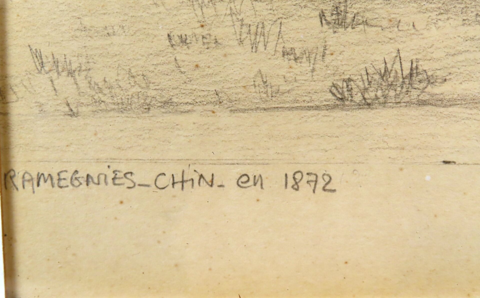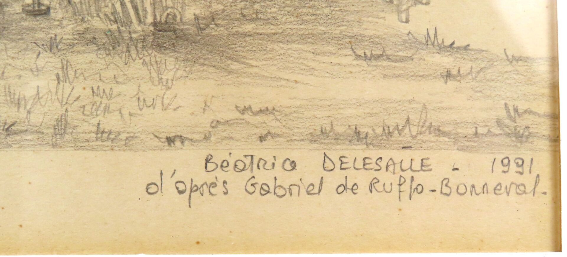 Béatrice DELESALLE (XXth). "View of Ramegnies-Chin", pencil drawing, signed and localised, after Gabriel de Ruffo-Bonneval (at sight: 24.5 x 40.5 cm). Gilded wood frame