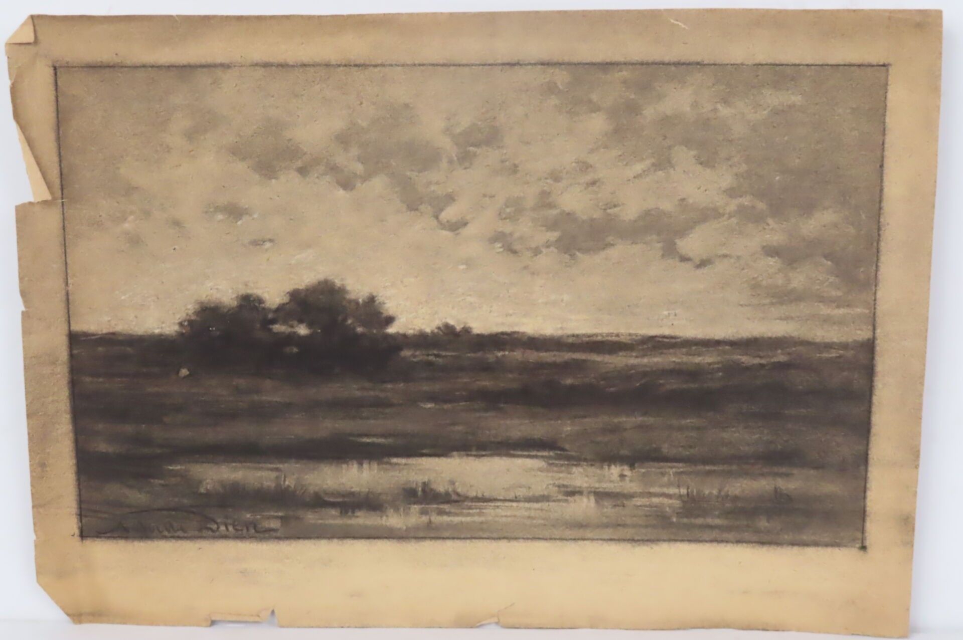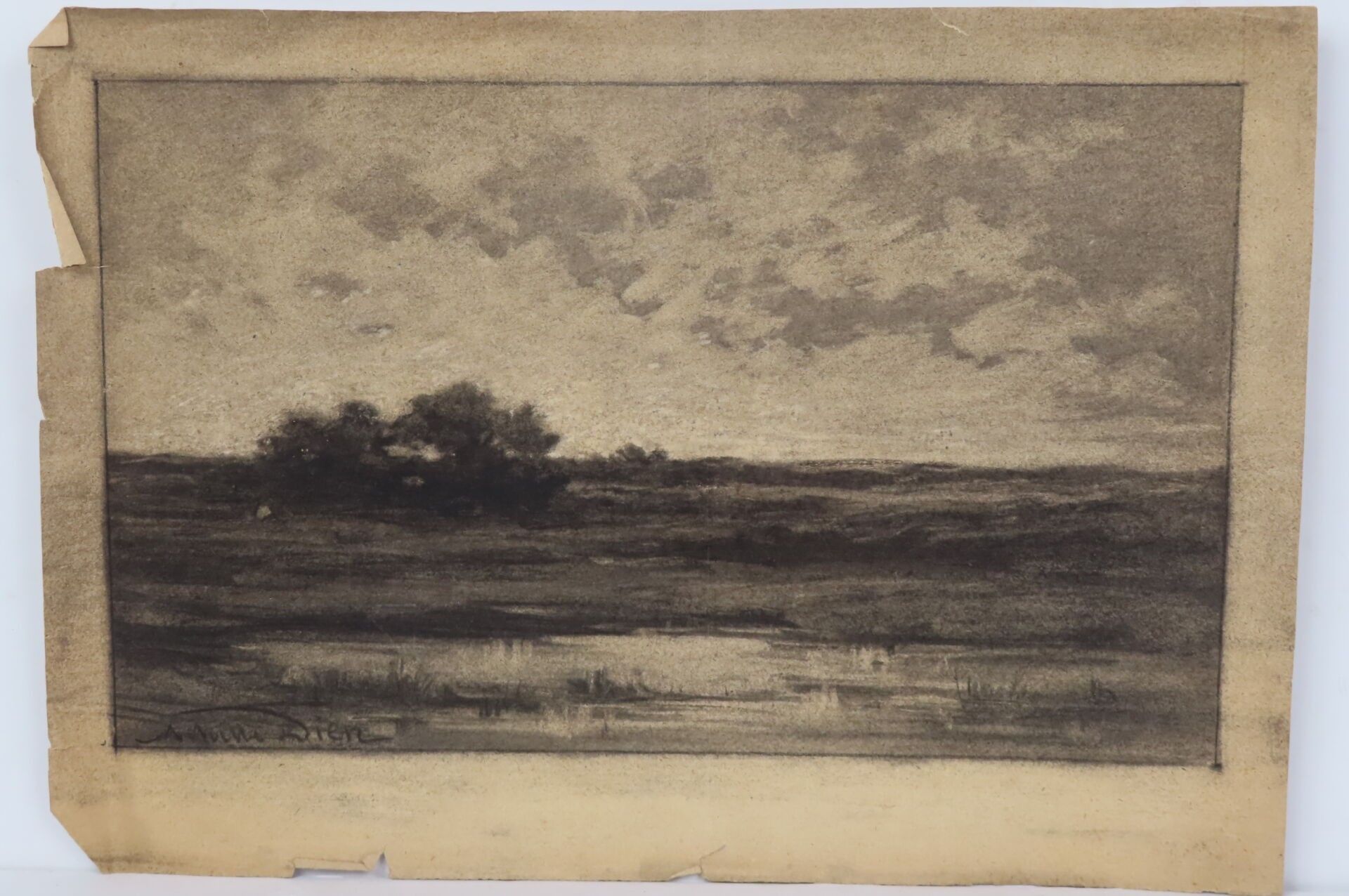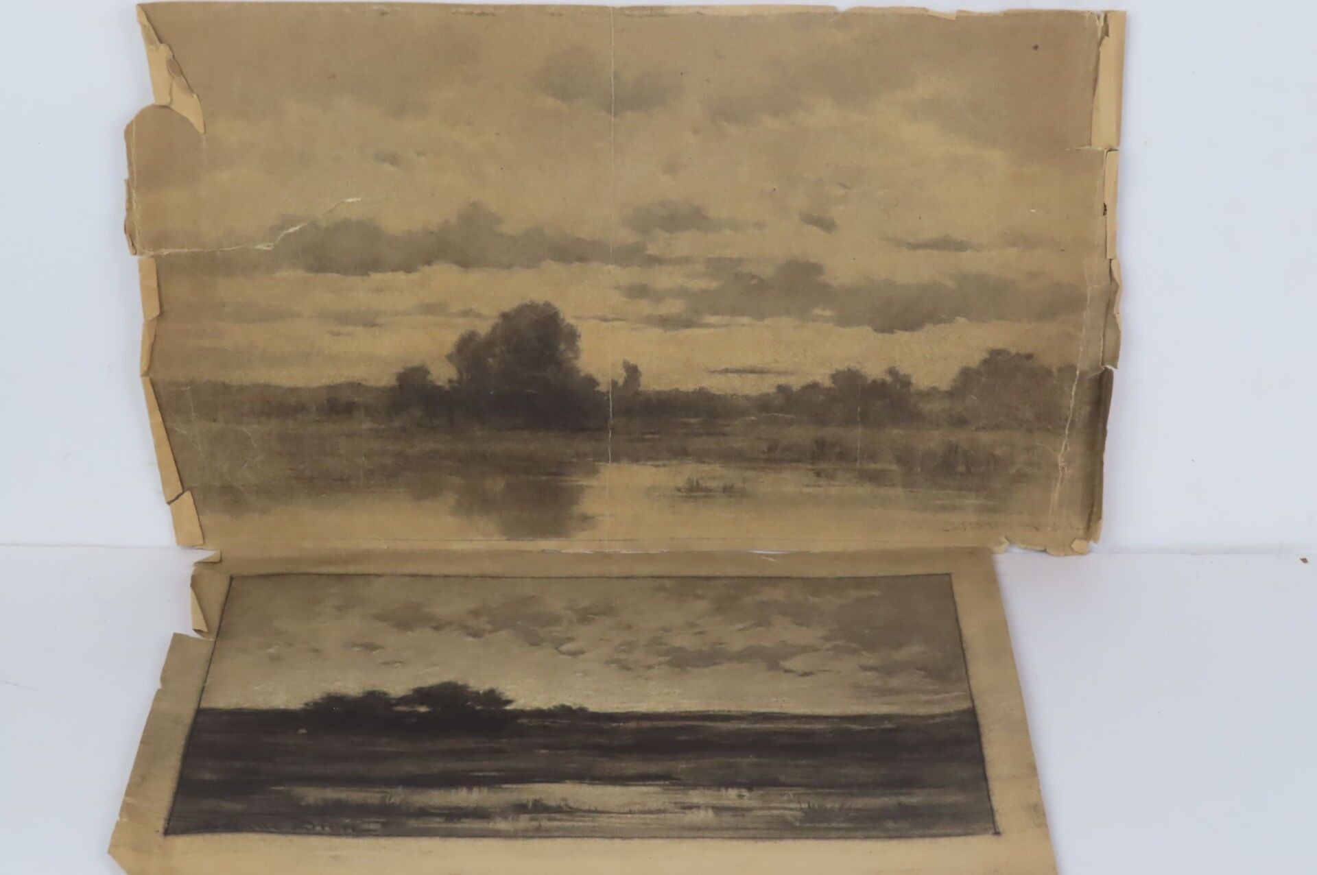 Achille DIEN (1832 - ?). "Paysages de marais", pair of charcoal drawings, signed lower right and left (25 x 36.5 cm and 25.5 x 43 cm) (folds, tears)