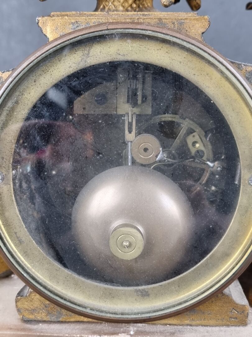 A gilt regule and onyx clock, the dial with Roman numerals a…