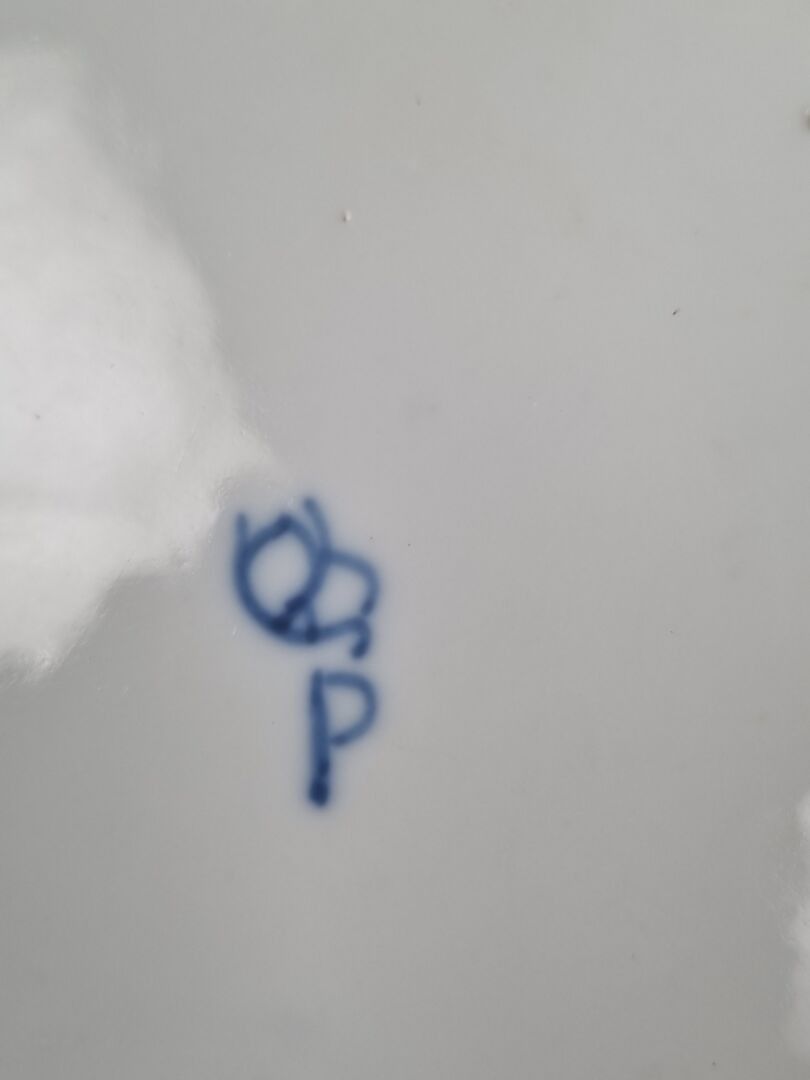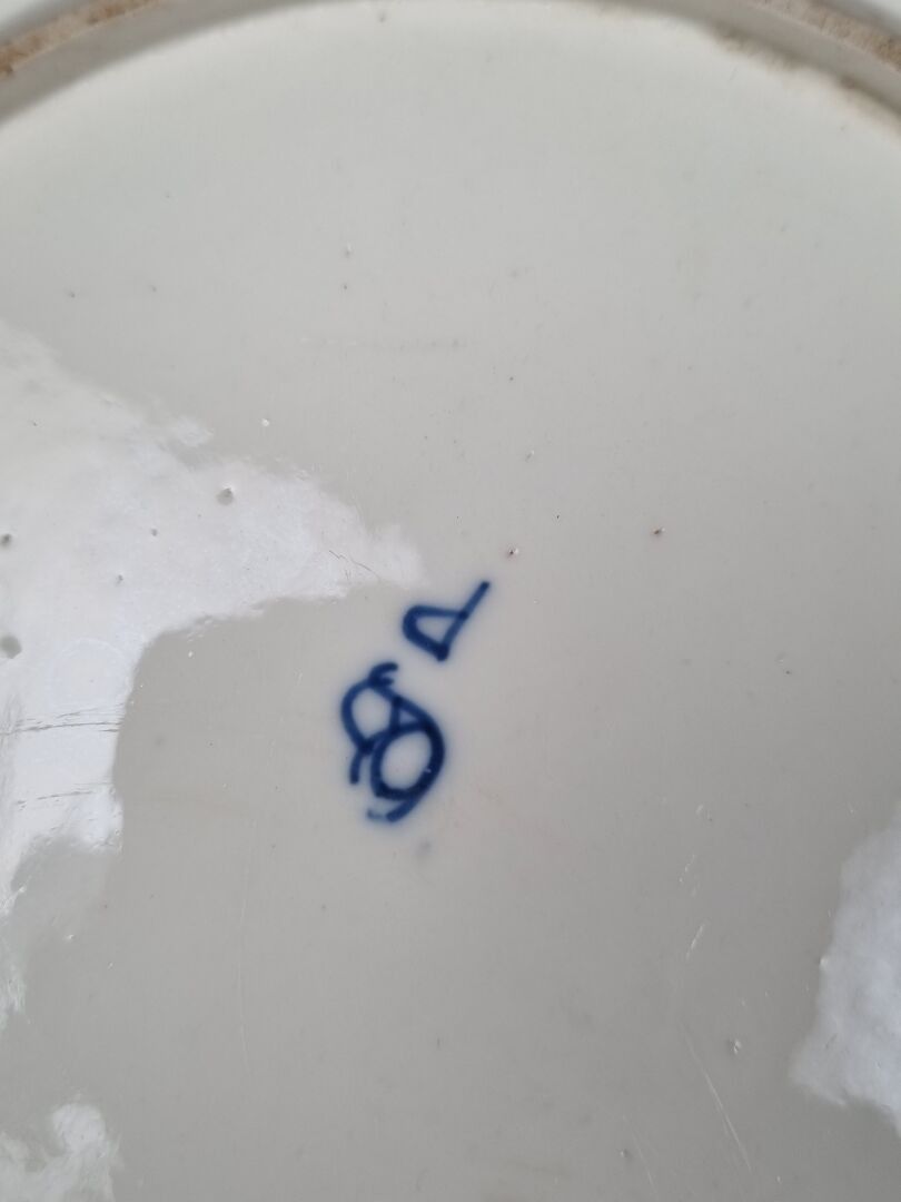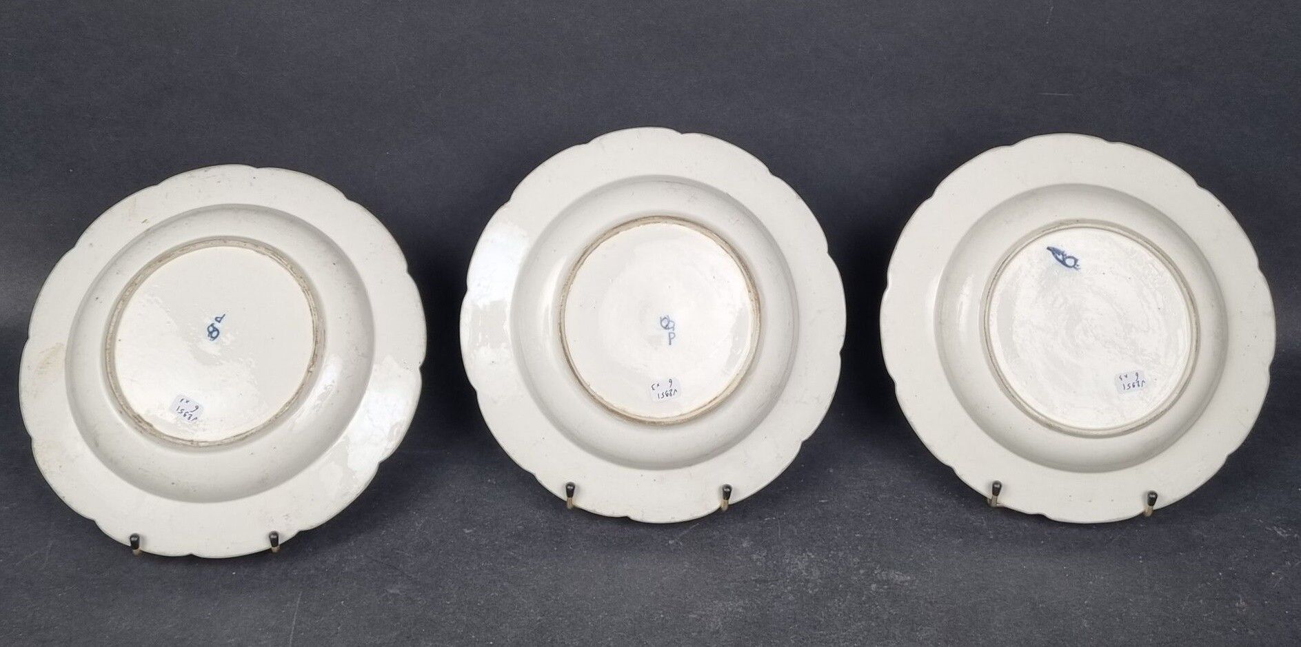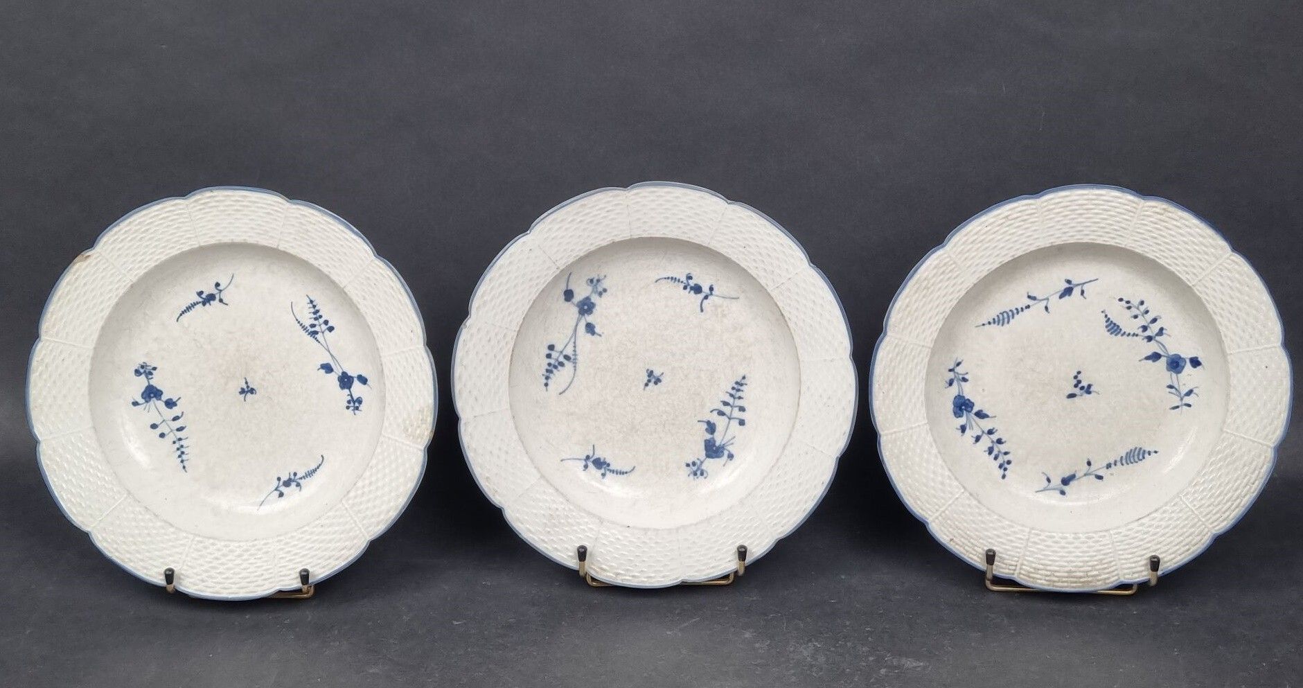 CHANTILLY. Set of 3 rimmed plates in soft porcelain with blue monochrome decoration of carnations and twigs, marli with wickerwork motif in relief, hunting horn mark on reverse. 18th century (diameter: 24.5 cm) (wear, small chips to one)