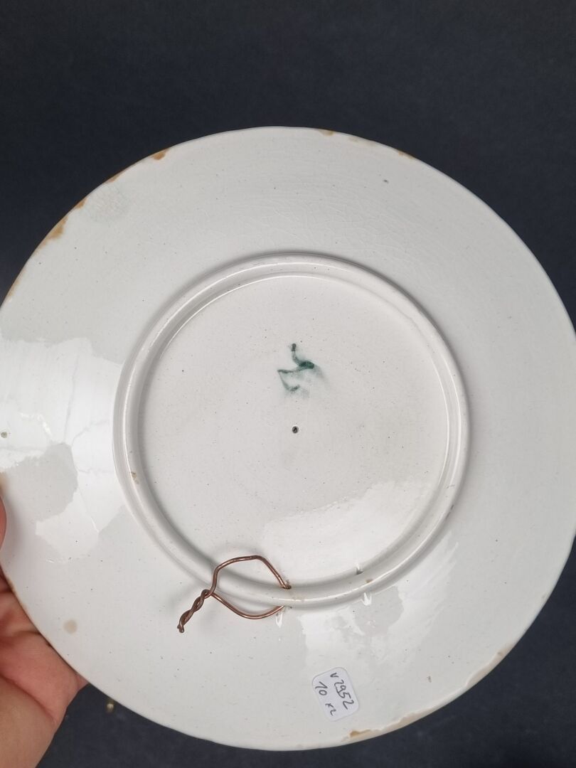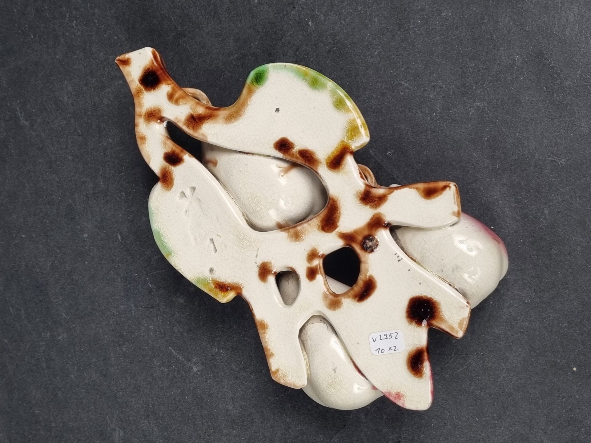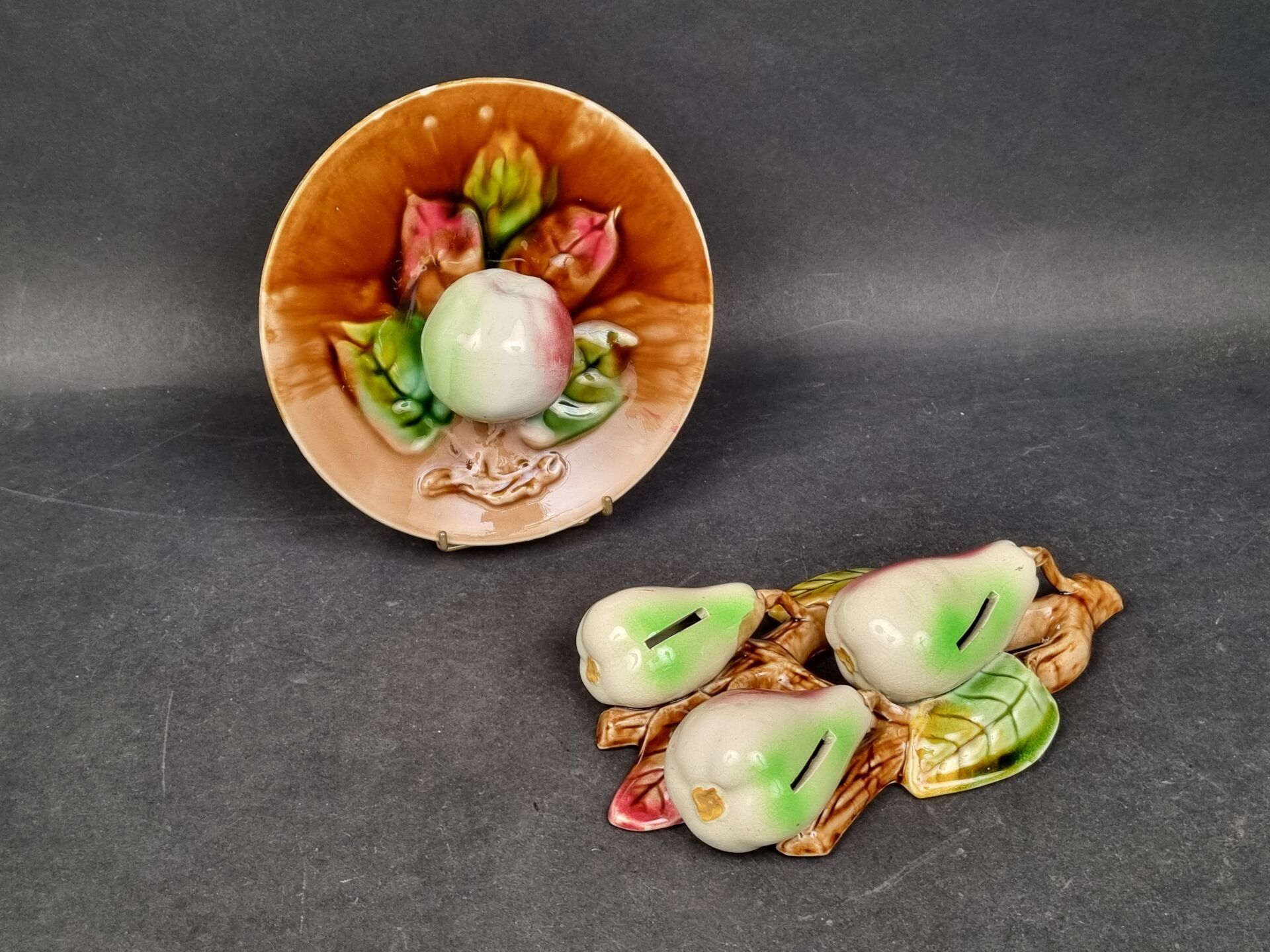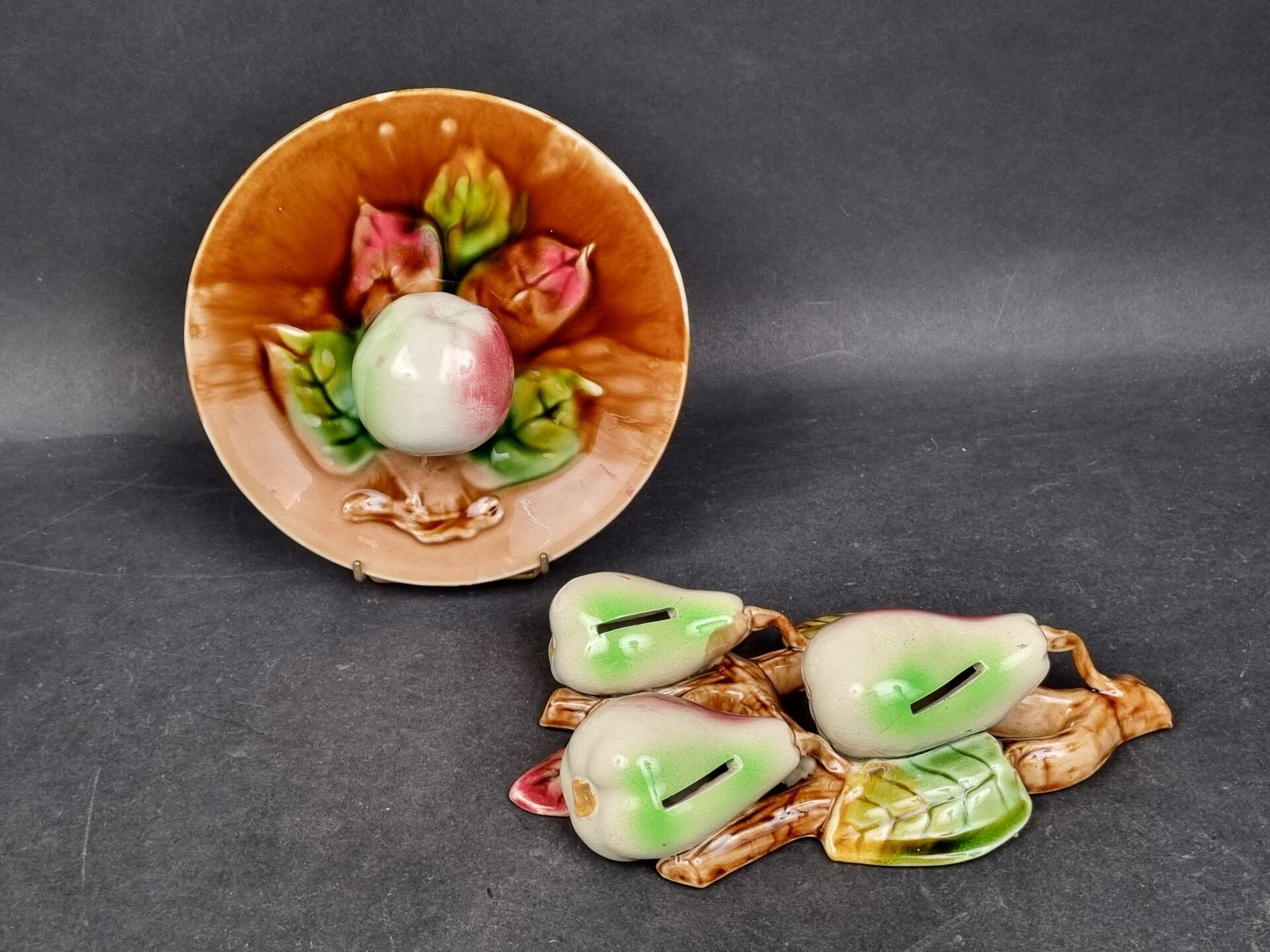 Lot comprising a polychrome enamelled earthenware money box decorated with pears and a plate decorated in relief with an apple, in the Longchamp or Orchies style, mark on reverse (diam: 23 and 28 cm)