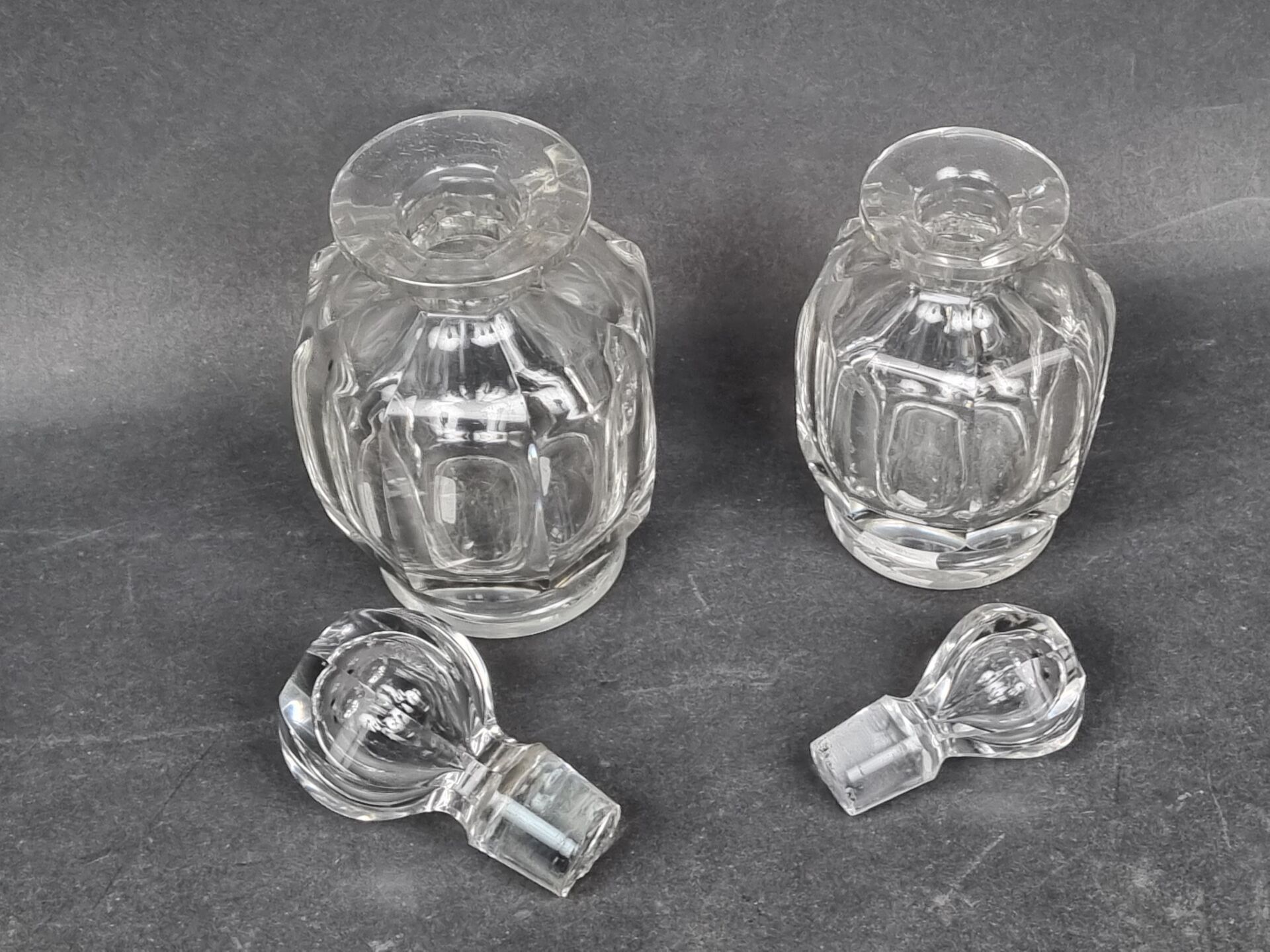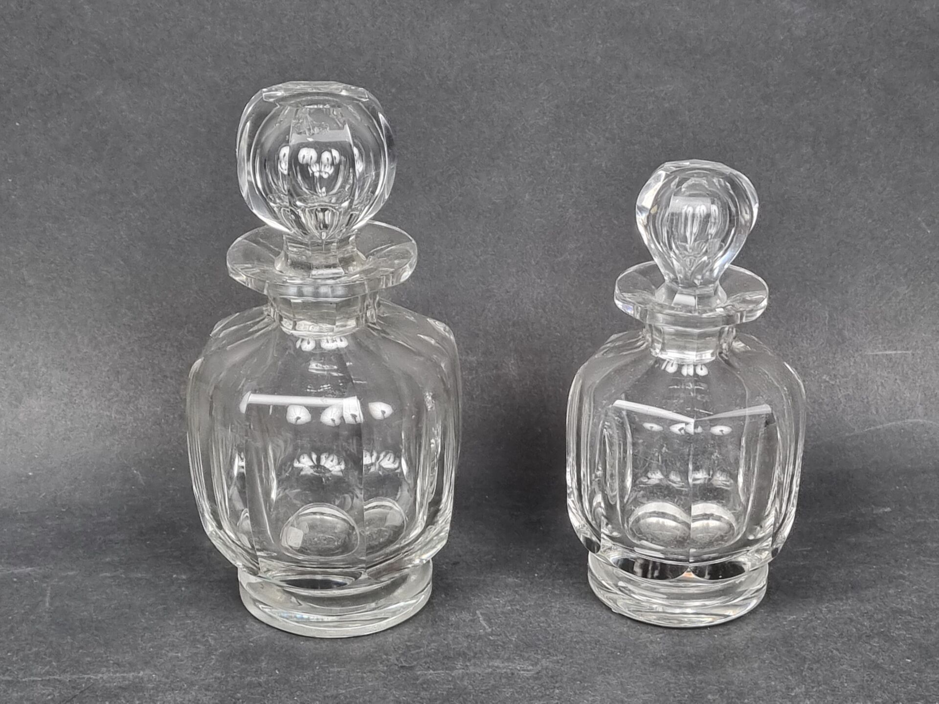 BACCARAT. Two translucent cut crystal bottles, stamped (H: 17.5 and 14.5 cm)