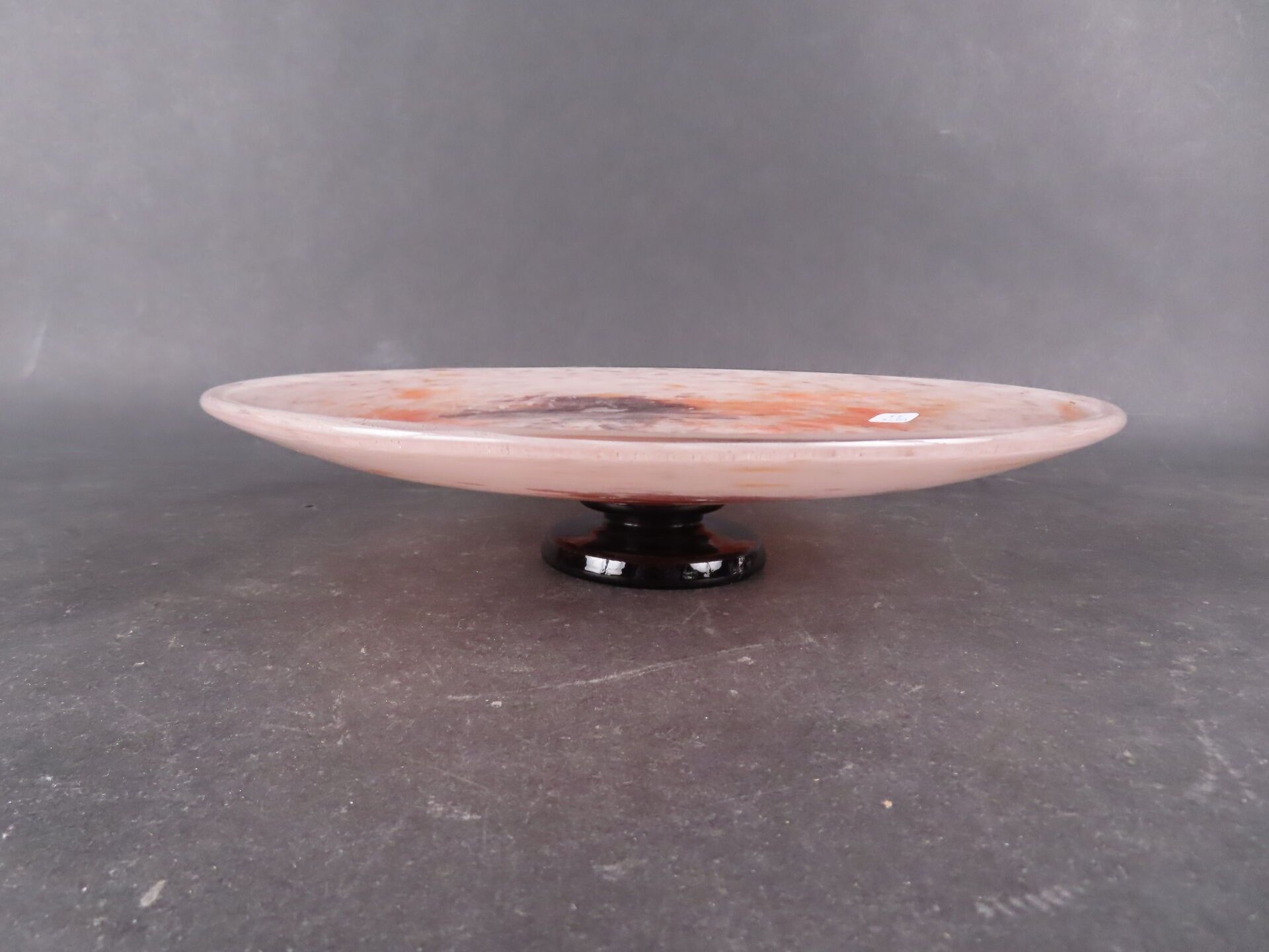 FRENCH GLASS. Orange/brown marmorated glass bowl, signed on the foot (H: 6.5 cm, Diam: 30 cm)