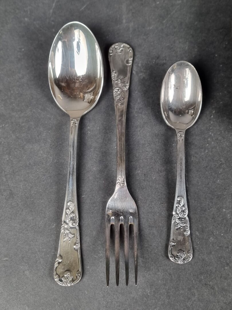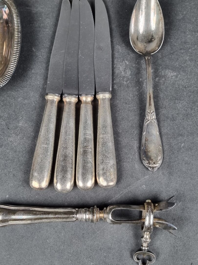 Set of silver-plated cutlery including 2 sugar tongs, 1 bowl, 1 carving fork with forged silver handle, 1 pair of carving tongs and miscellaneous.