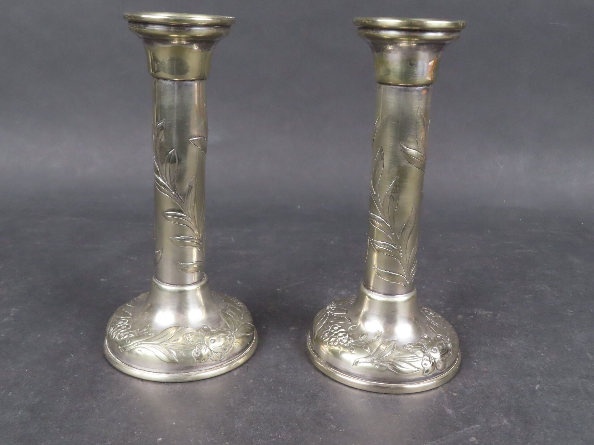 Pair of silver-plated candlesticks decorated with flowers, E…