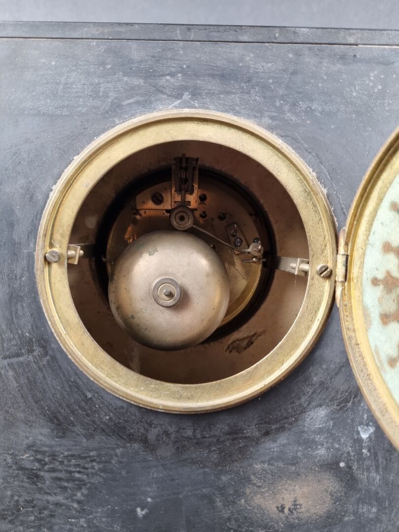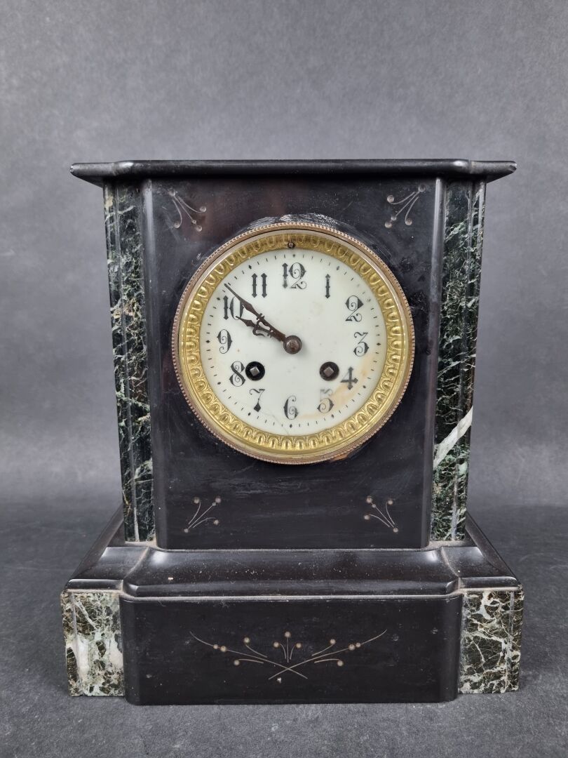 Black marble and sea green marble terminal clock, dial with Arabic numerals (H: 27.5 cm, W: 24 cm)