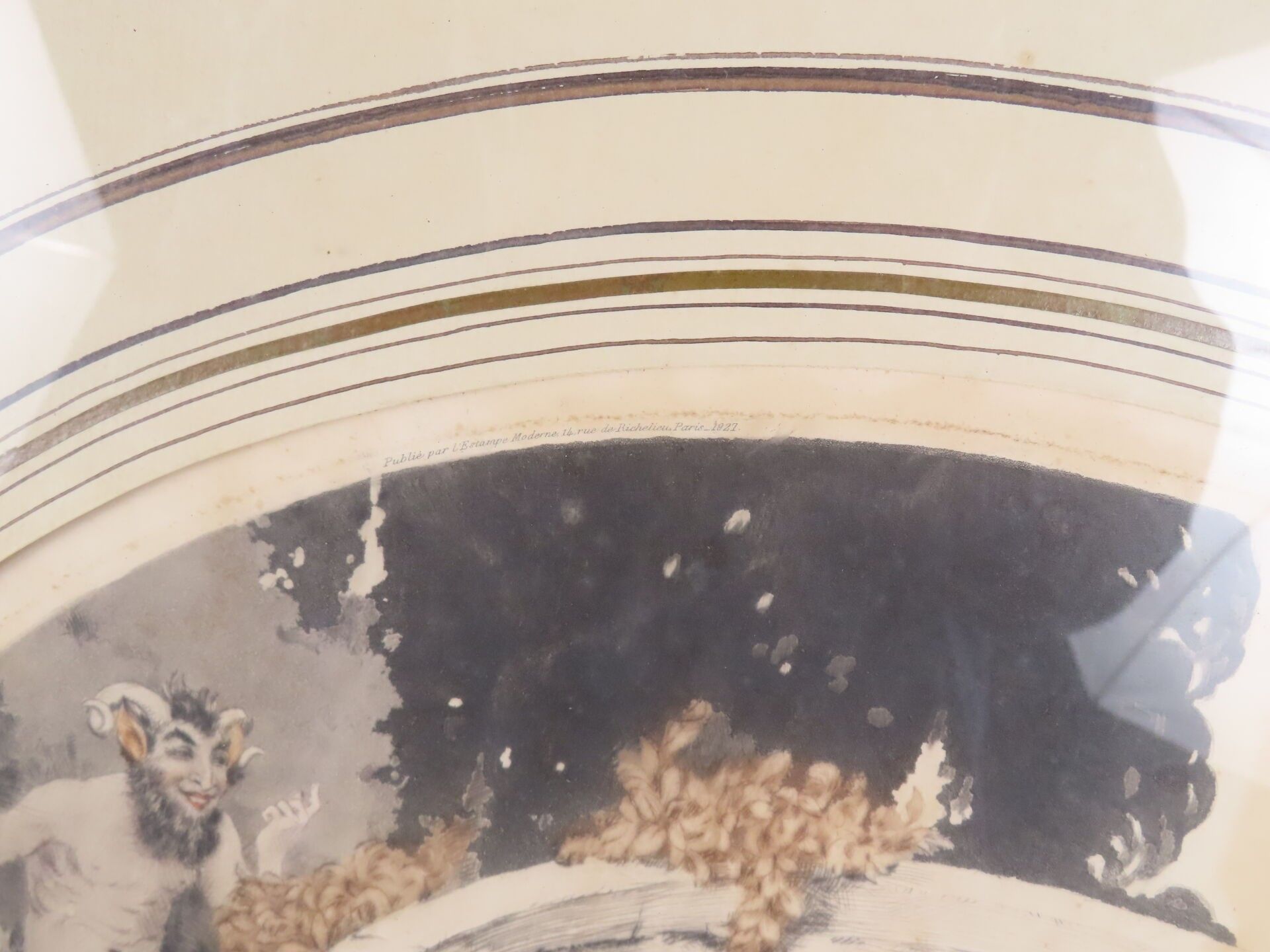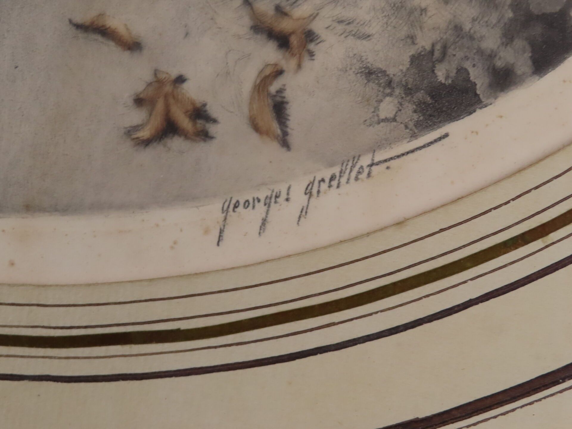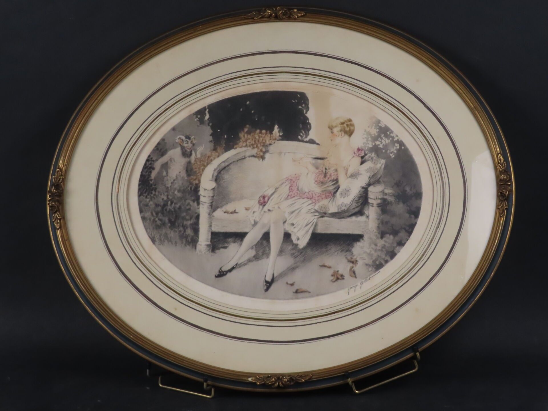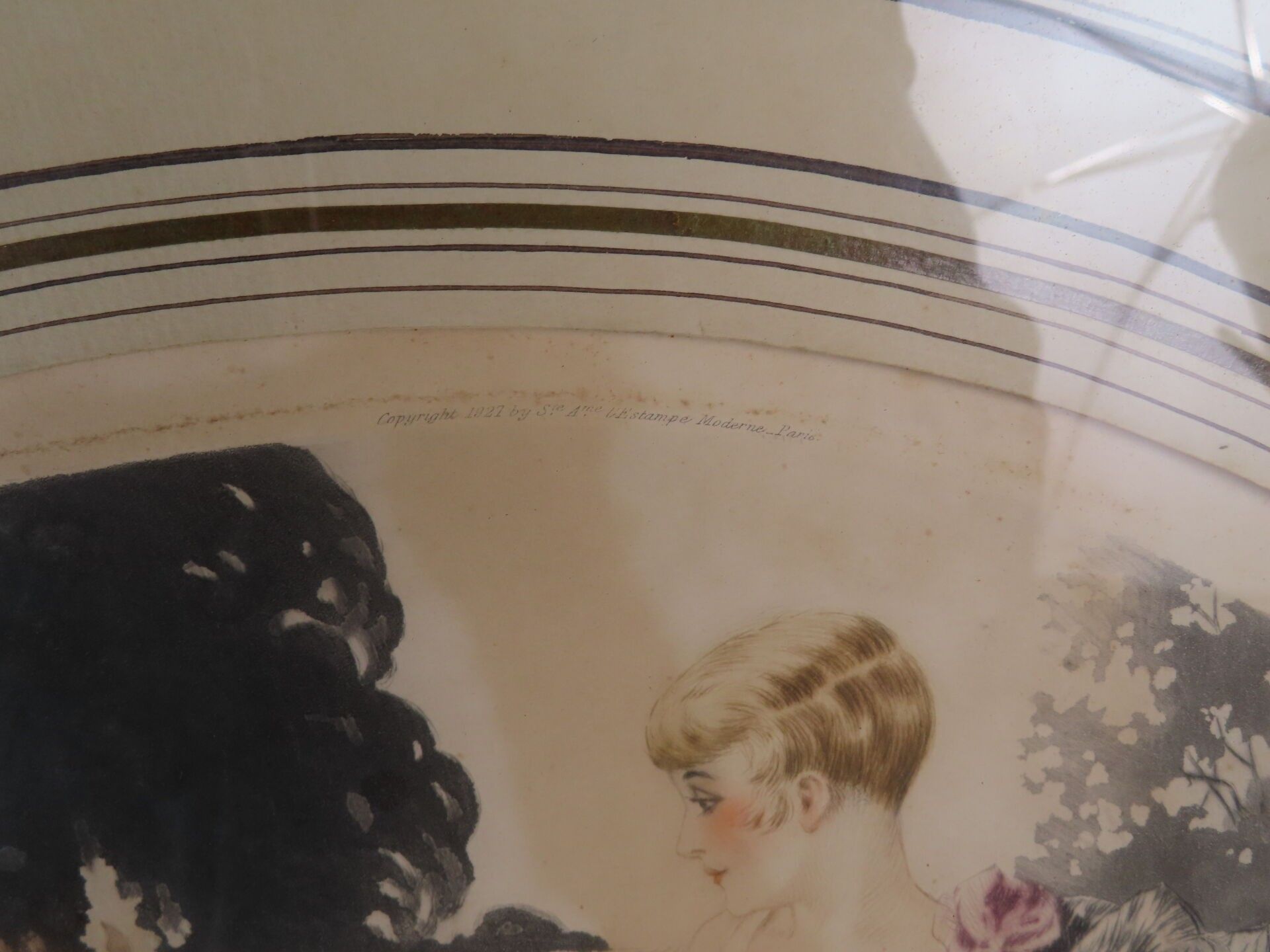 Georges GRELLET (1869-1959). "Élégante et satyre", aquatint with oval view, frame decorated with flowers (with frame: 63 x 54 cm) (stain, small missing frame)