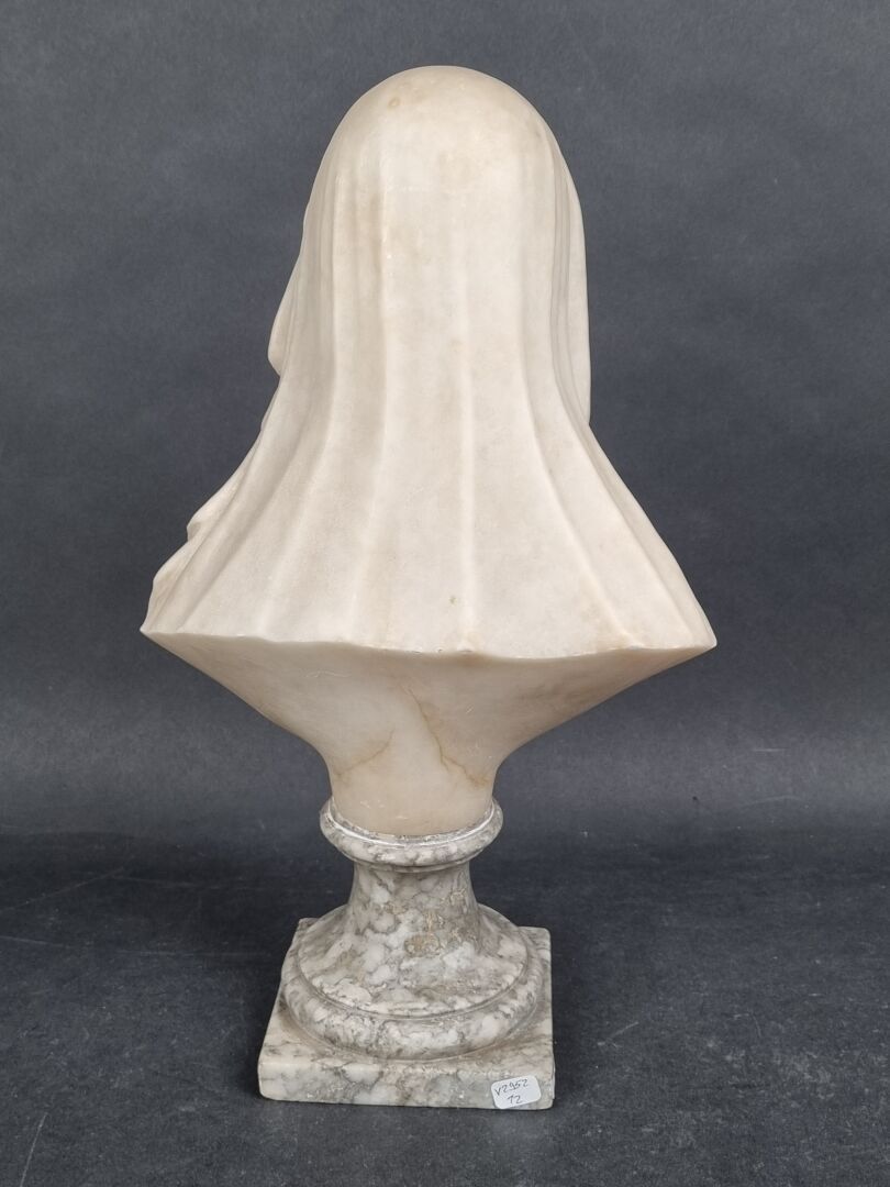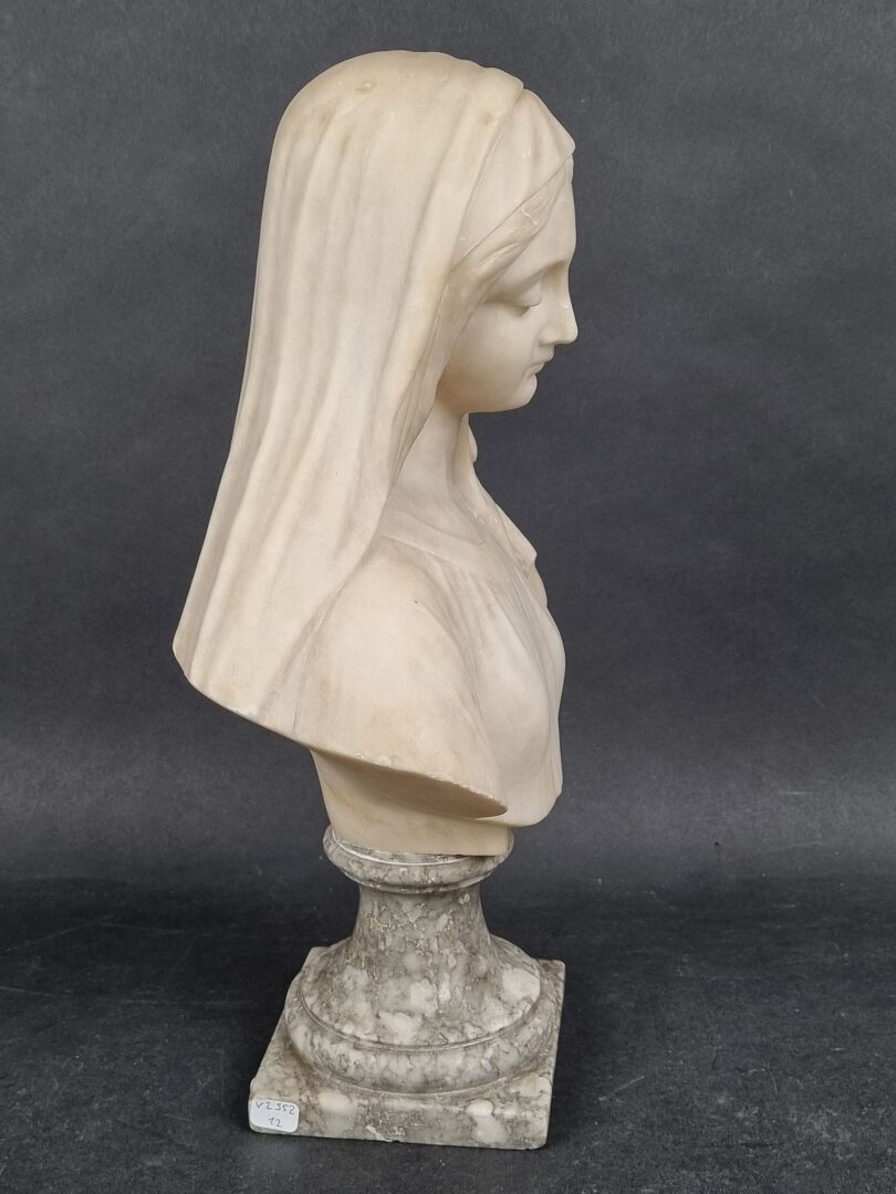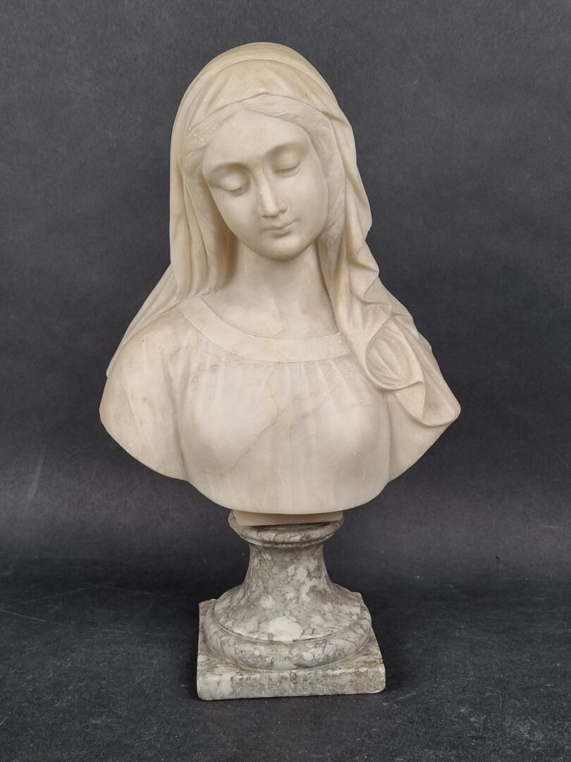 Alabaster bust of the Virgin Mary, grey marble pedestal (H: …