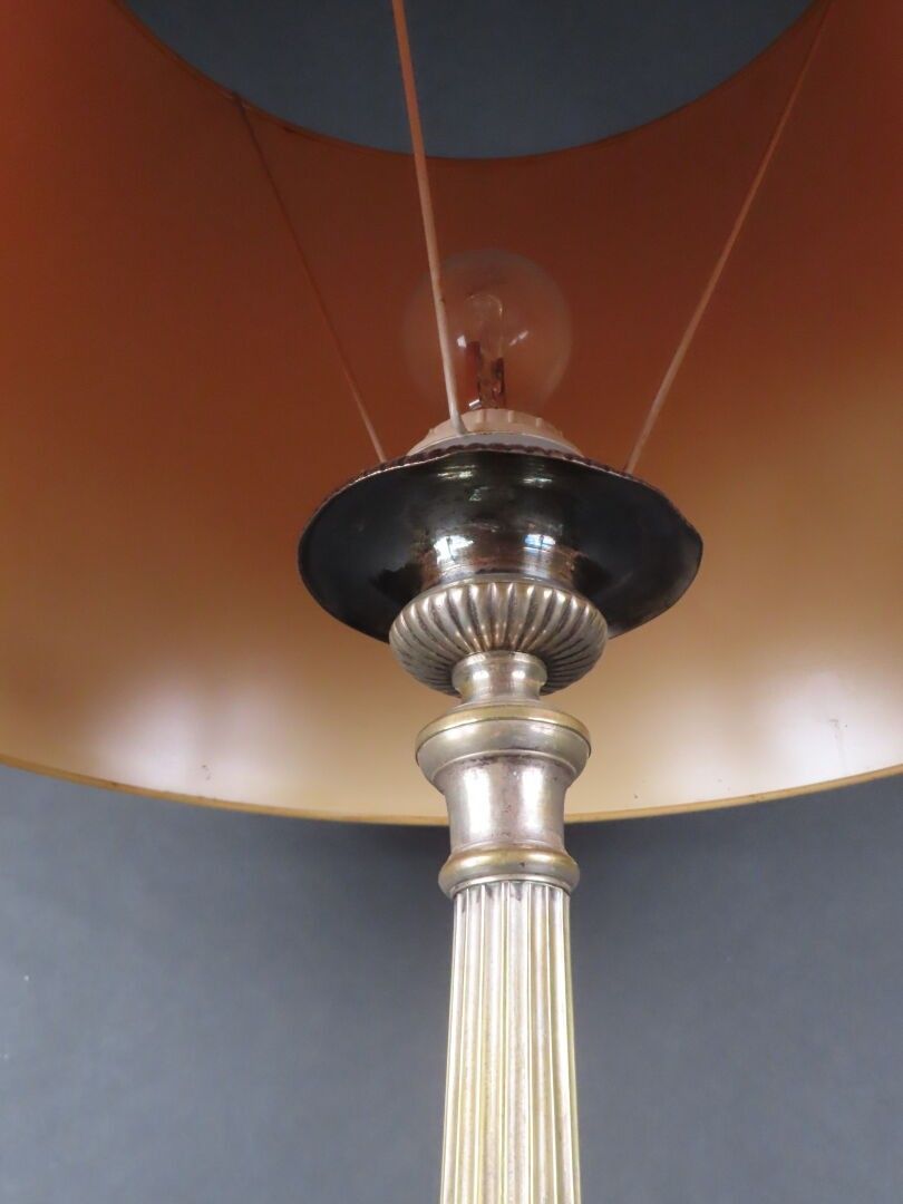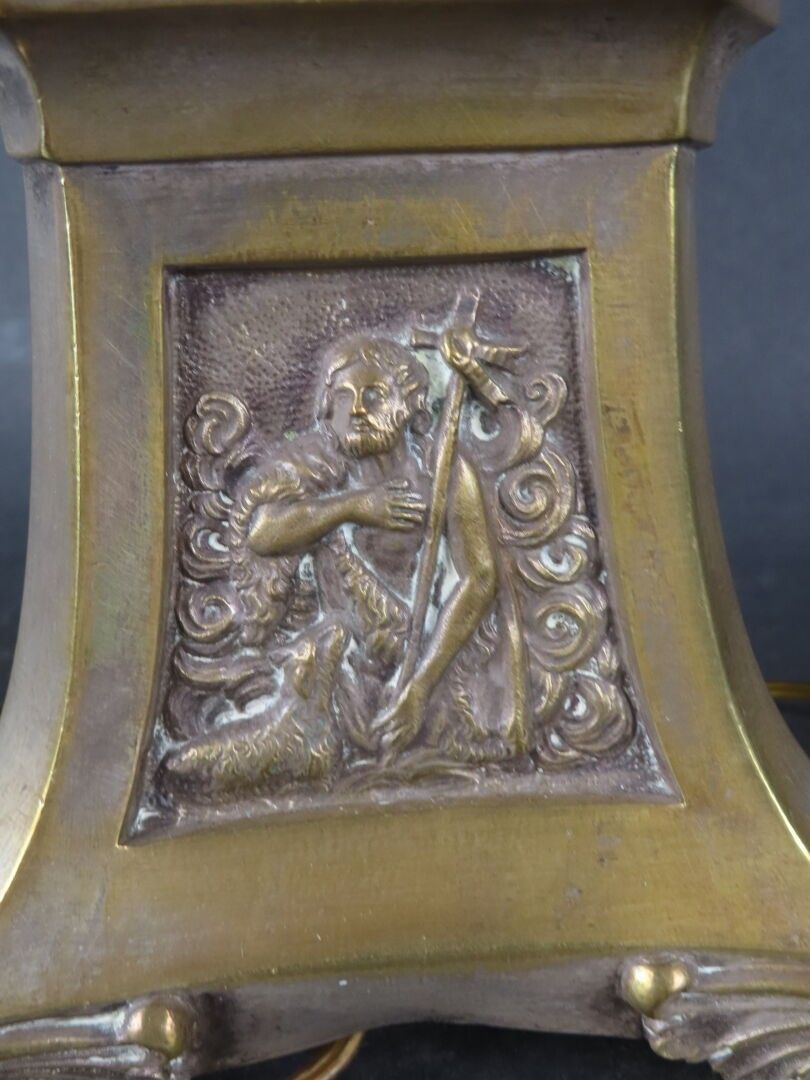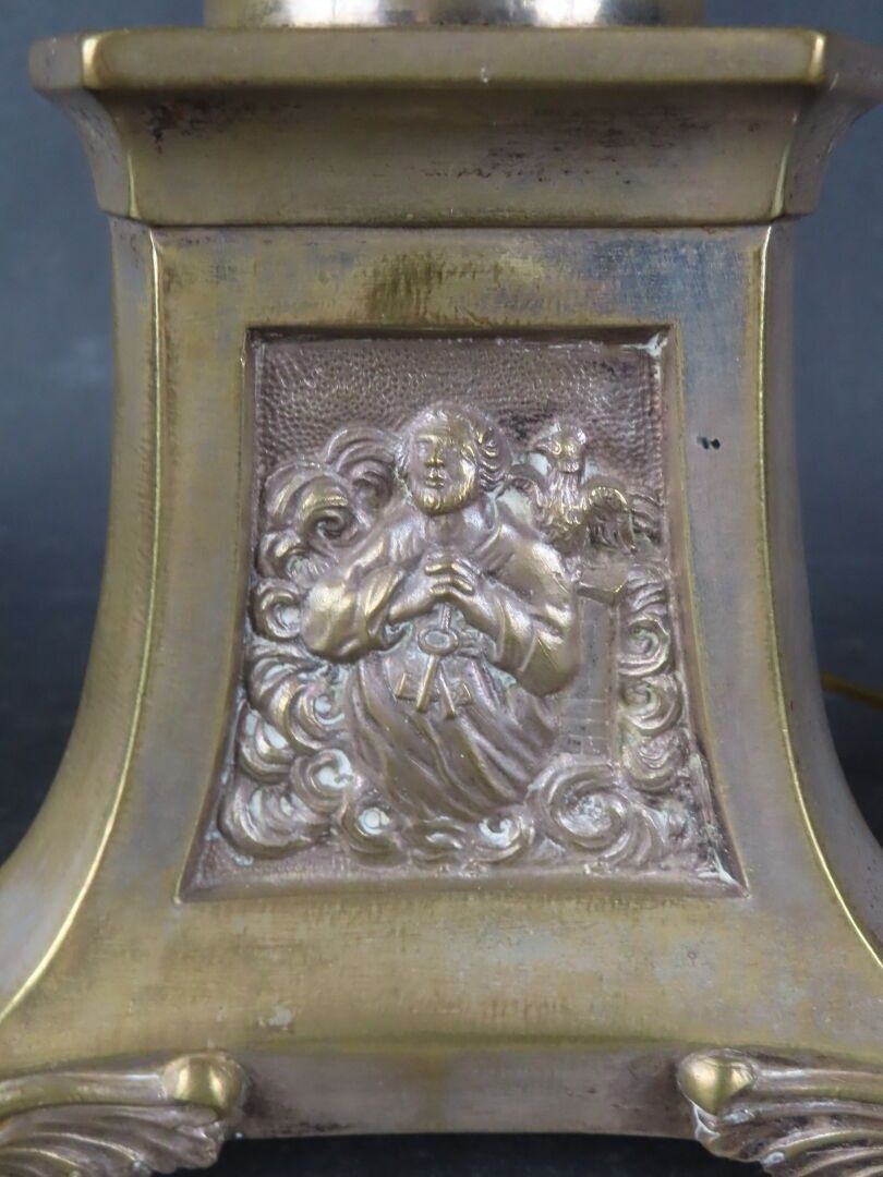 Tripod silver-plated brass candlestick with fluting, decorated with Saint Paul, Saint Peter and Saint John the Baptist, briffe legs (H. excluding shade: 59 cm)